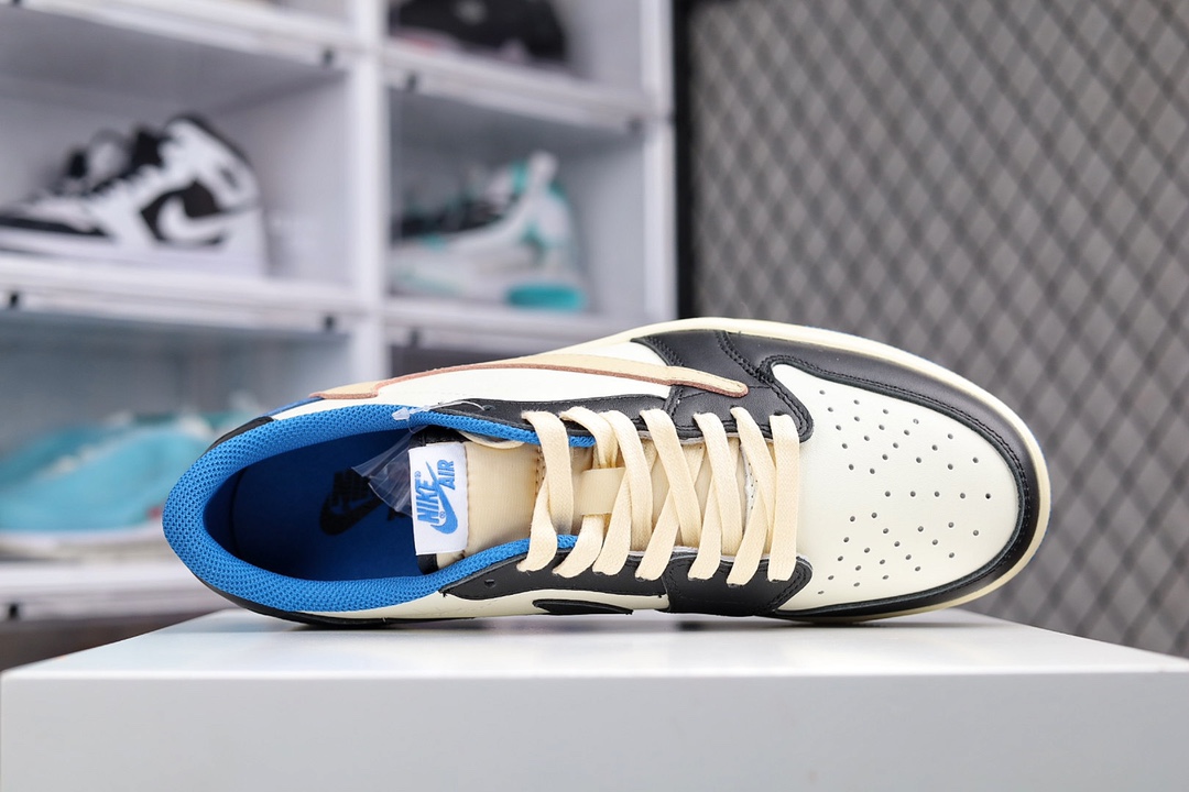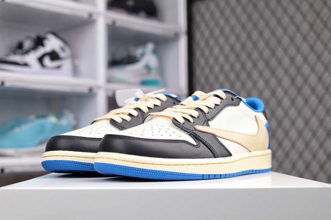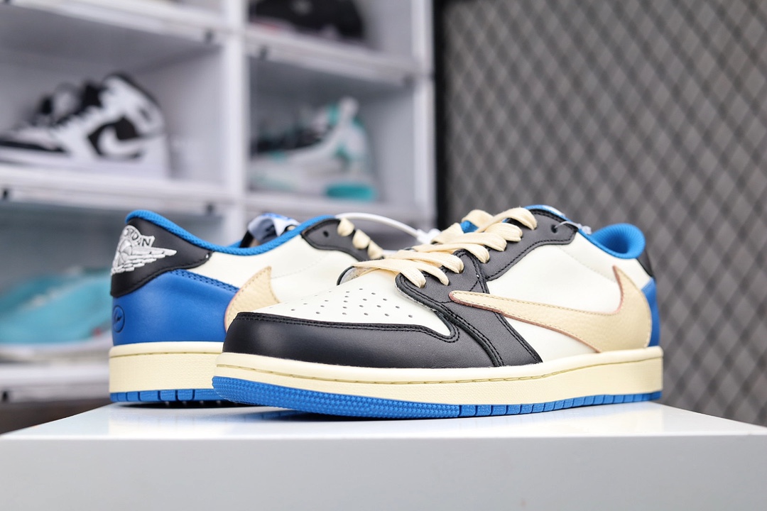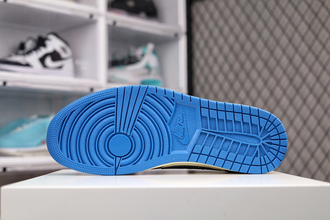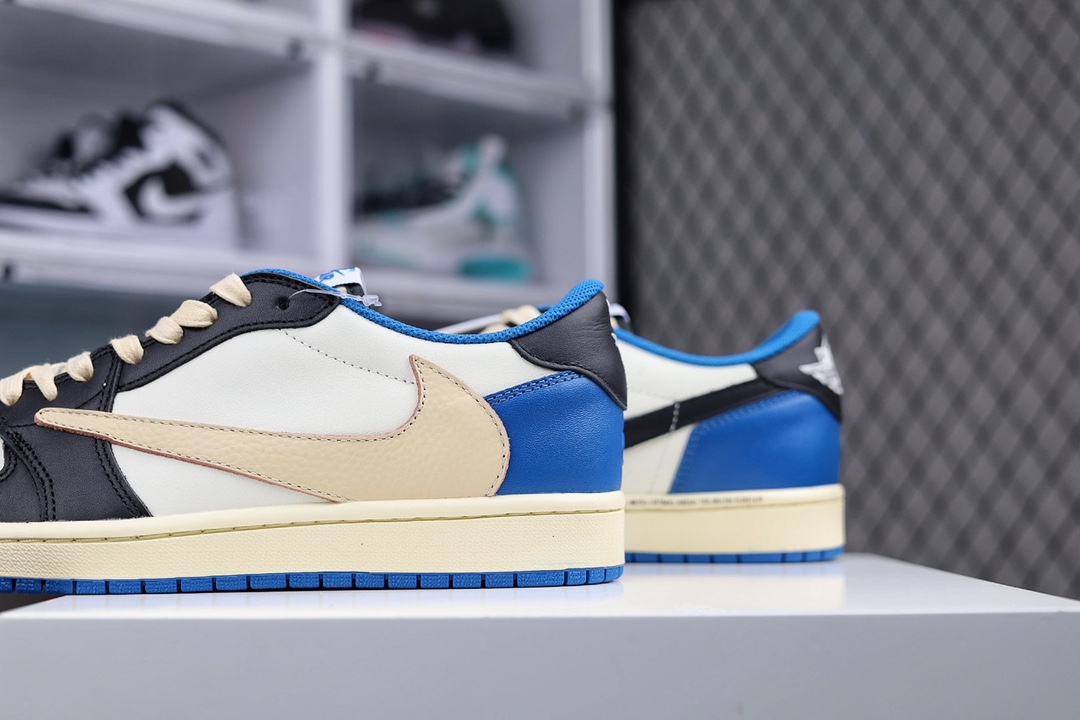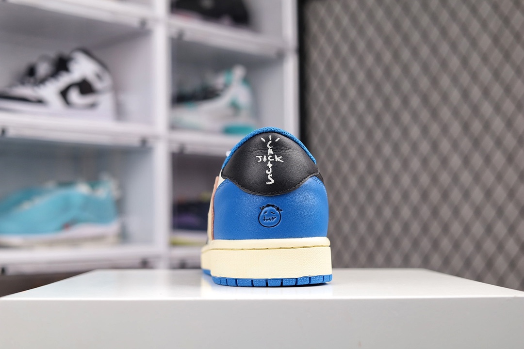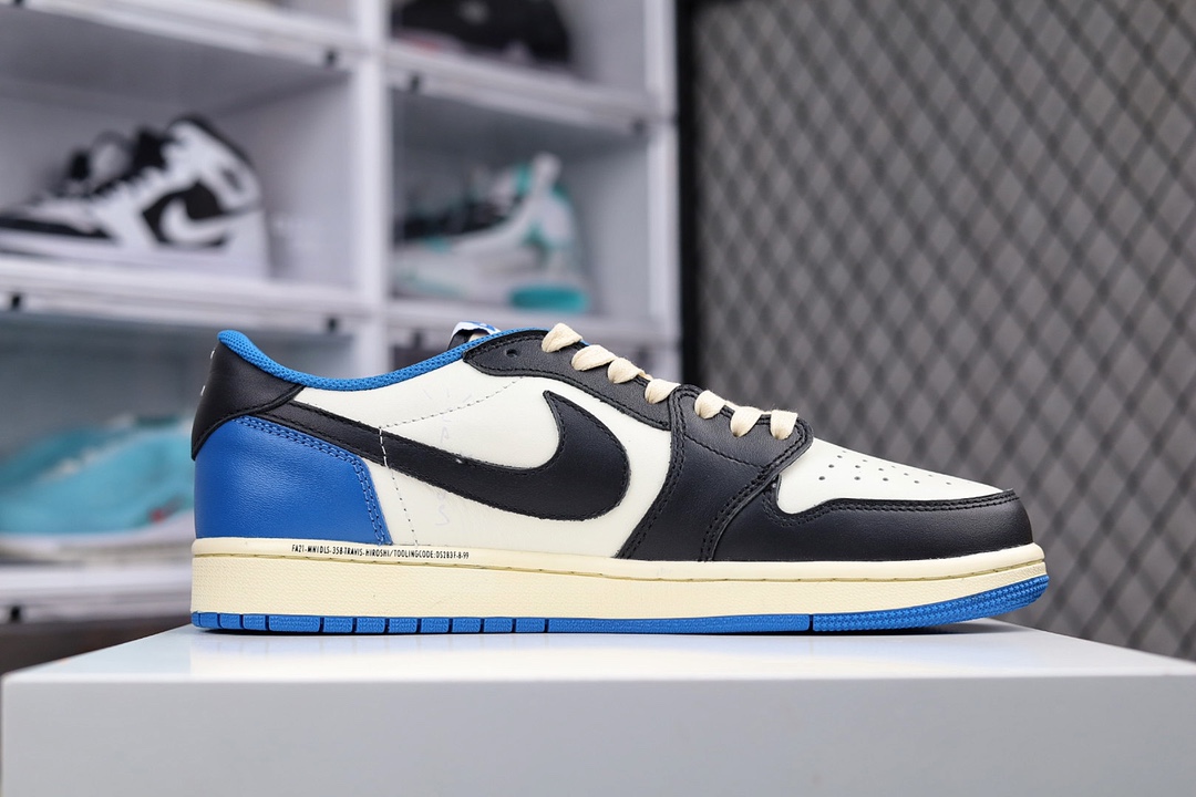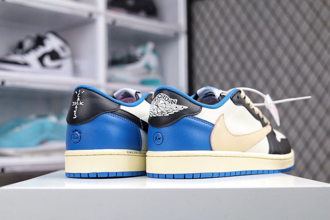 G5 公司级 全头层 Fragment x Travis Scott x Air Jordan 1 ” Military Blue ” AJ1乔1 TS 藤原浩 闪电 鬼脸 三方联名倒钩 完美品质出货 细节如图所示 进口头层皮料 鞋面切割工整 冲孔整齐干净 中底拉帮线 后跟漏斗小蛮腰鞋型×996MK