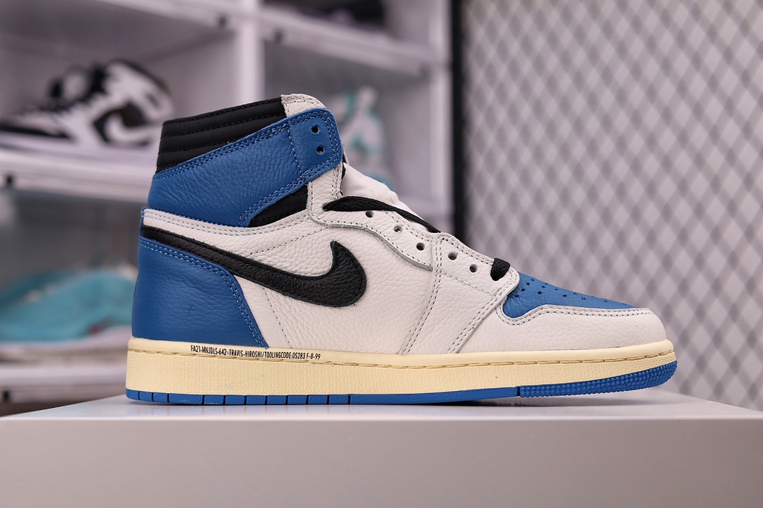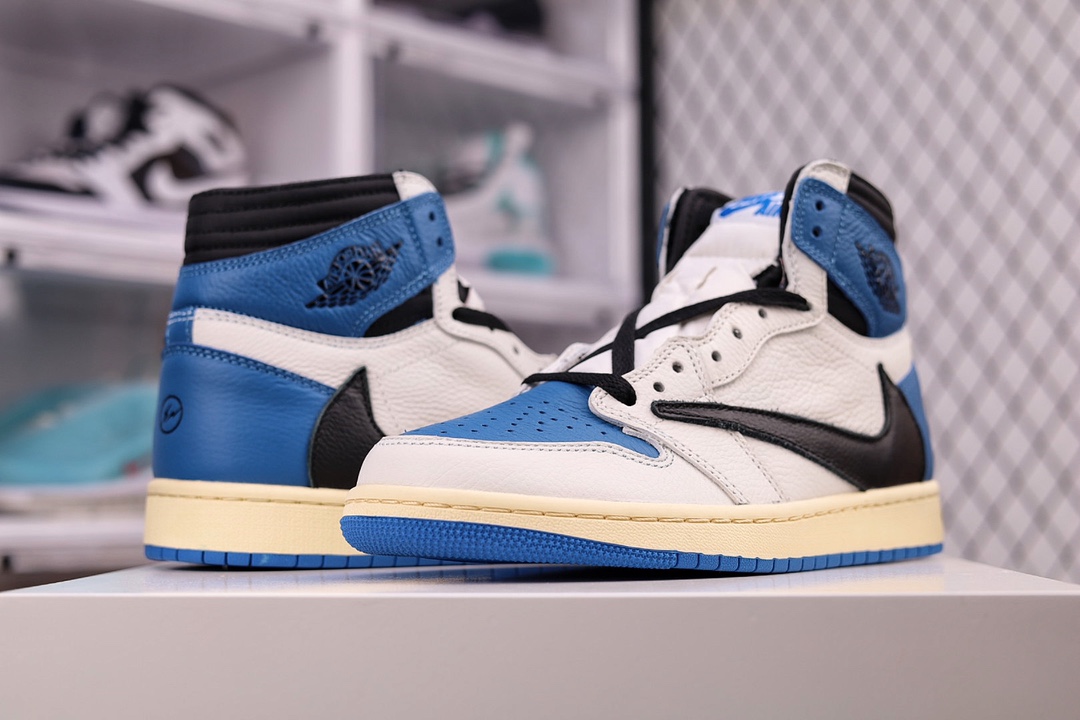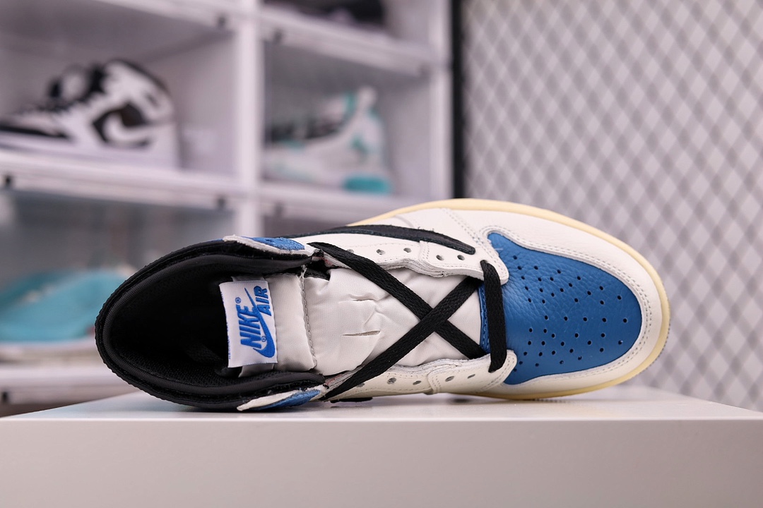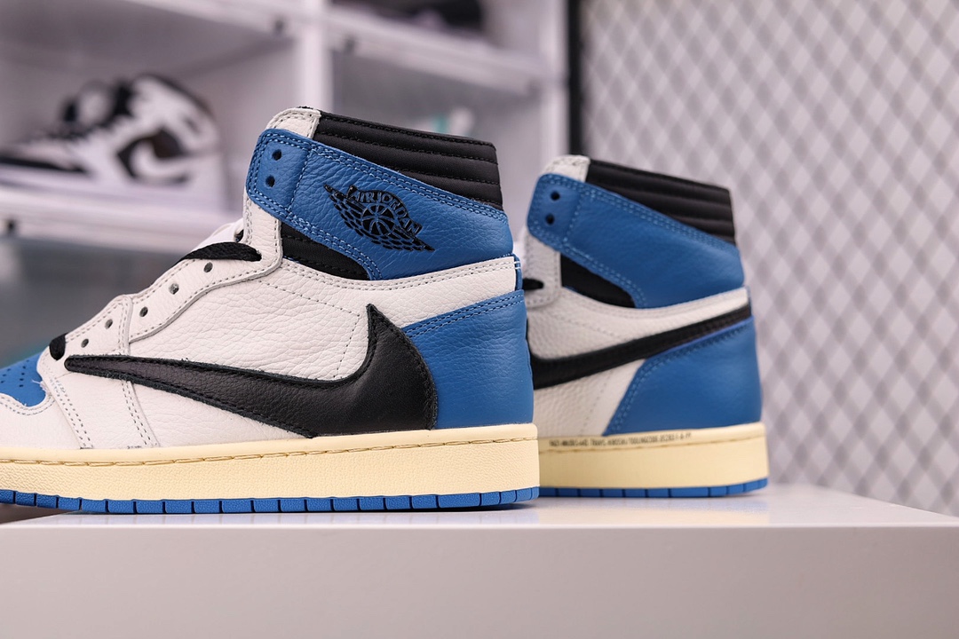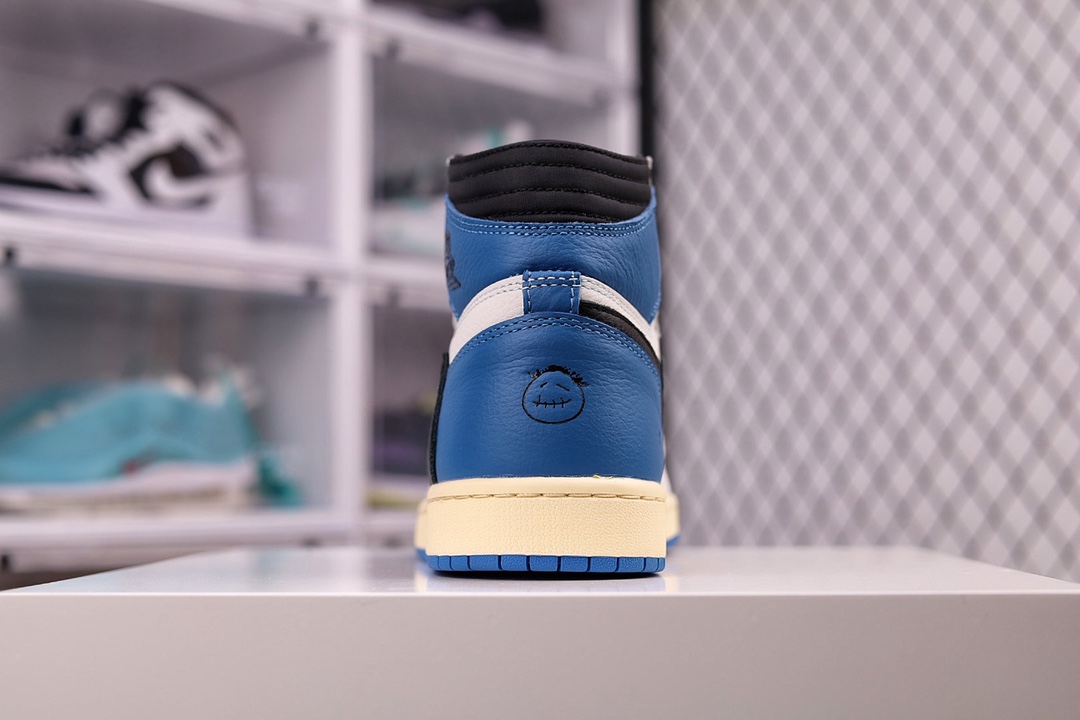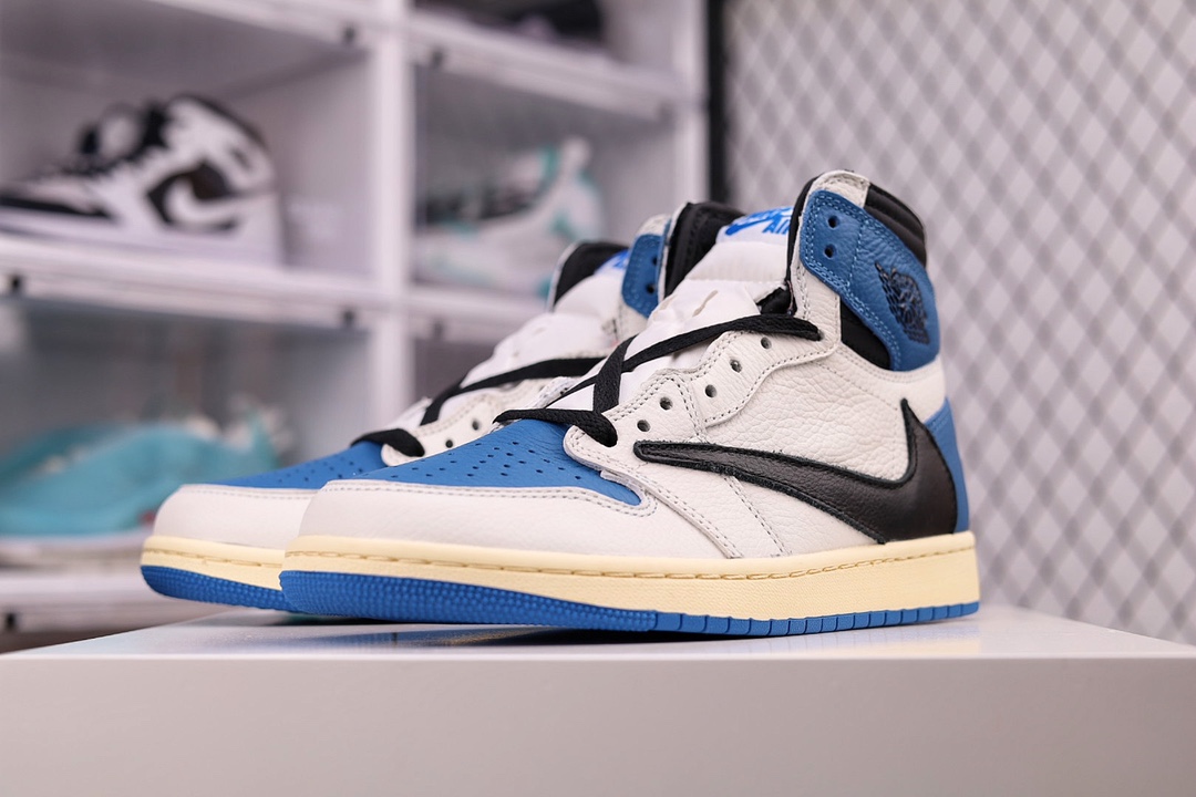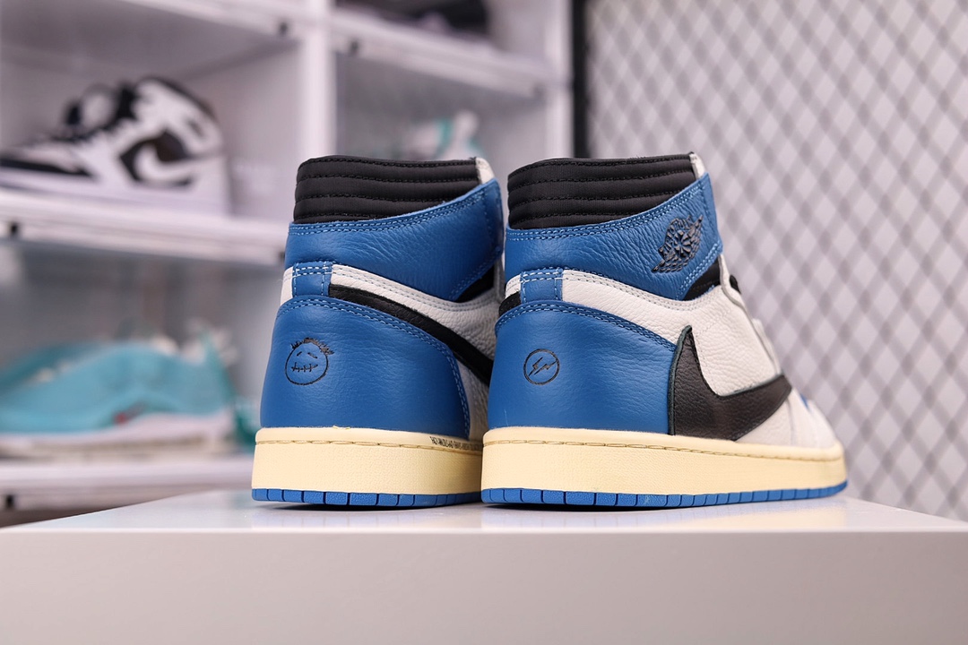 H0 大次 全头层 原装原盒TS 藤原浩 三方联名 闪电倒钩 白蓝 Fragment x TS x Air Jordan 1 High OG SP “Military Blue” 鞋头的大面积白色,搭配硕大的黑色「倒勾」再点缀上藤原浩拿手的蓝色,吸睛效果直接拉满。左右脚的鞋舌上缝有Travis Scott 和 fragment Design的Logo标签后跟处还妆点着黑色的笑脸和闪电Logo都彰显出联名身份。
