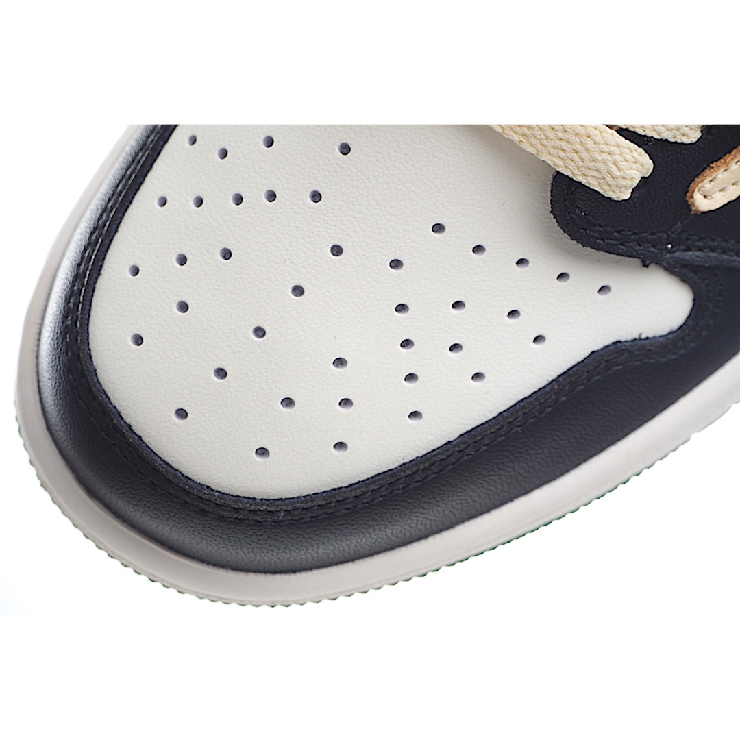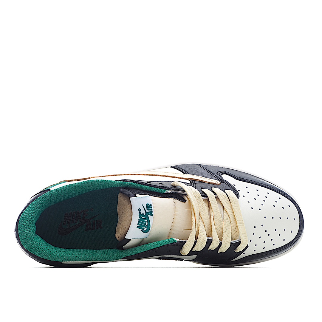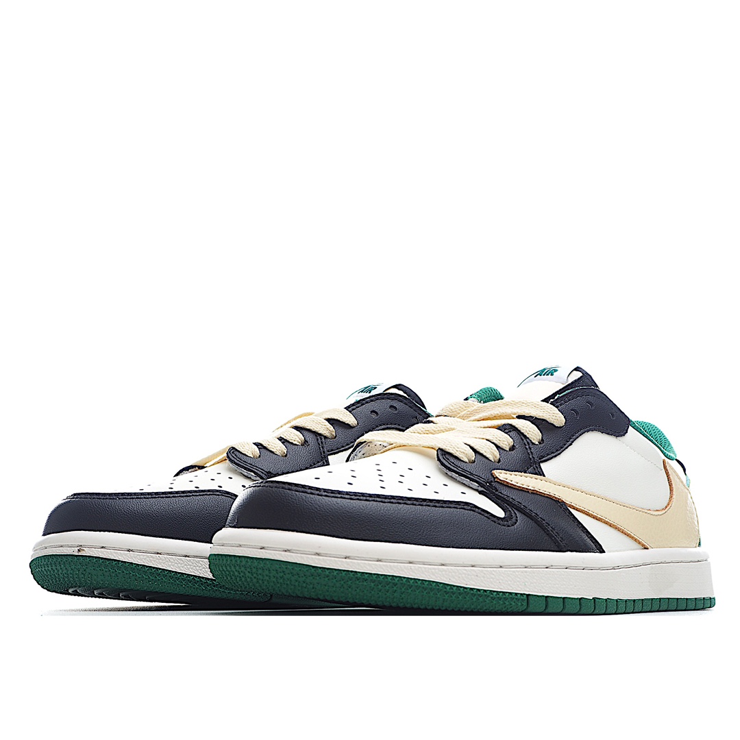 H0 Travis Scott x Fragment x Air Jordan 1 Low TS联名倒勾低帮板鞋 DM7866-128错版灵感来源于洛杉矶球鞋店铺收到一双特别的错版 Air Jordan 1“Gold Toe” 的勾子倒过来 之后抄近 H0 00美元 研发出反向勾的设计