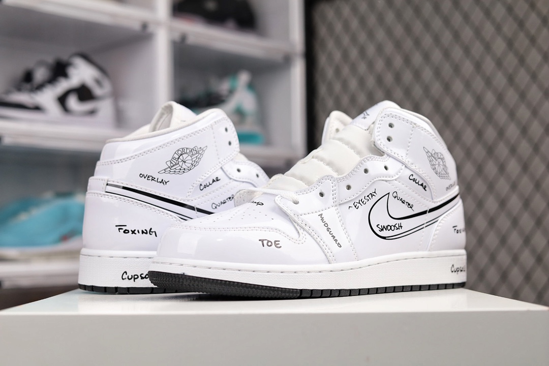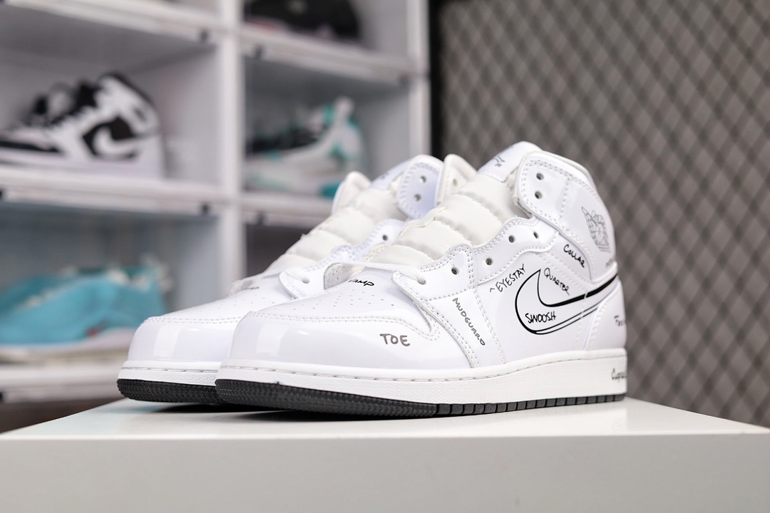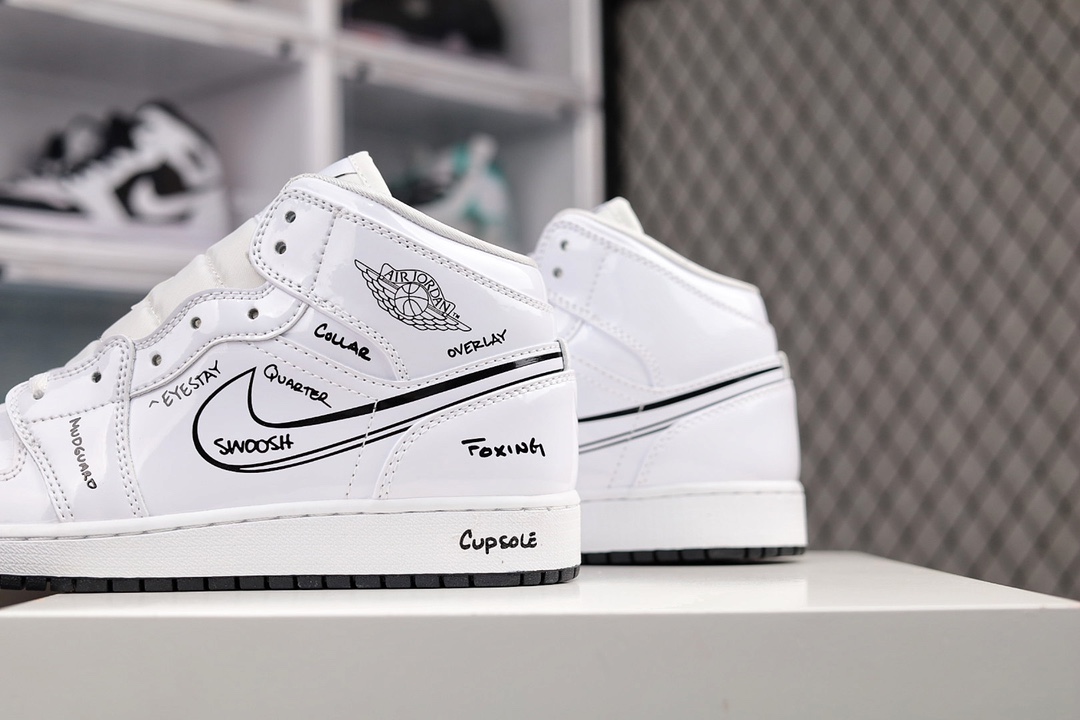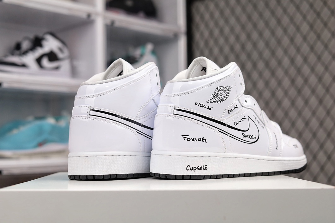 H5 纯原版本 耐克Nike Air Jordan 1 Mid GS”Schematic”AJ1乔丹一代中帮经典复古文化休闲运动篮球鞋“皮革白黑二次元涂鸦”升级原楦原档案数据开发原厂立体填充鞋舌海绵中底注胶孔内置真Sole气垫原数据开发模具大底×877BX货号:DQ1864 F5 尺码:35.5 36 36.5 37.5 38 38.5 39 40