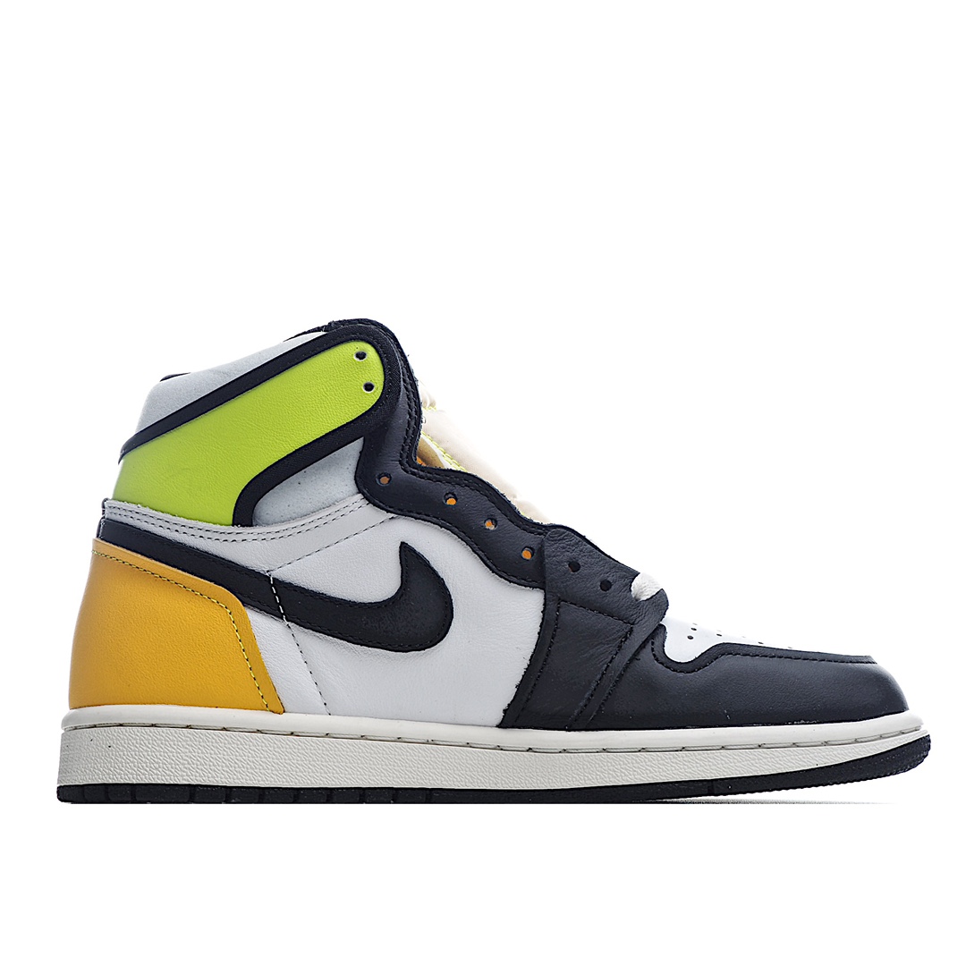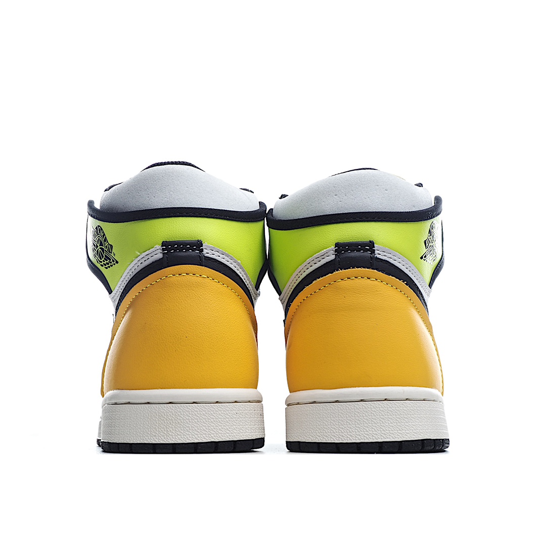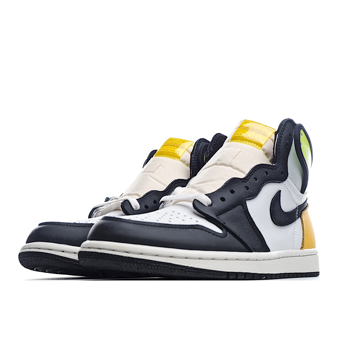 I5 Air Jordan 1 Retro High OG “VoltGold” 黑黄 全新配色的 Air Jordan 1。整双鞋采用白、黑、荧光绿和橘黄色拼接呈现,鞋头采用经典的黑脚趾配色设计,鞋帮处和后跟以荧光,土黄色点缀,十分跳脱的视觉效果!带来丰富视觉效果,十分亮眼。颜值爆表!