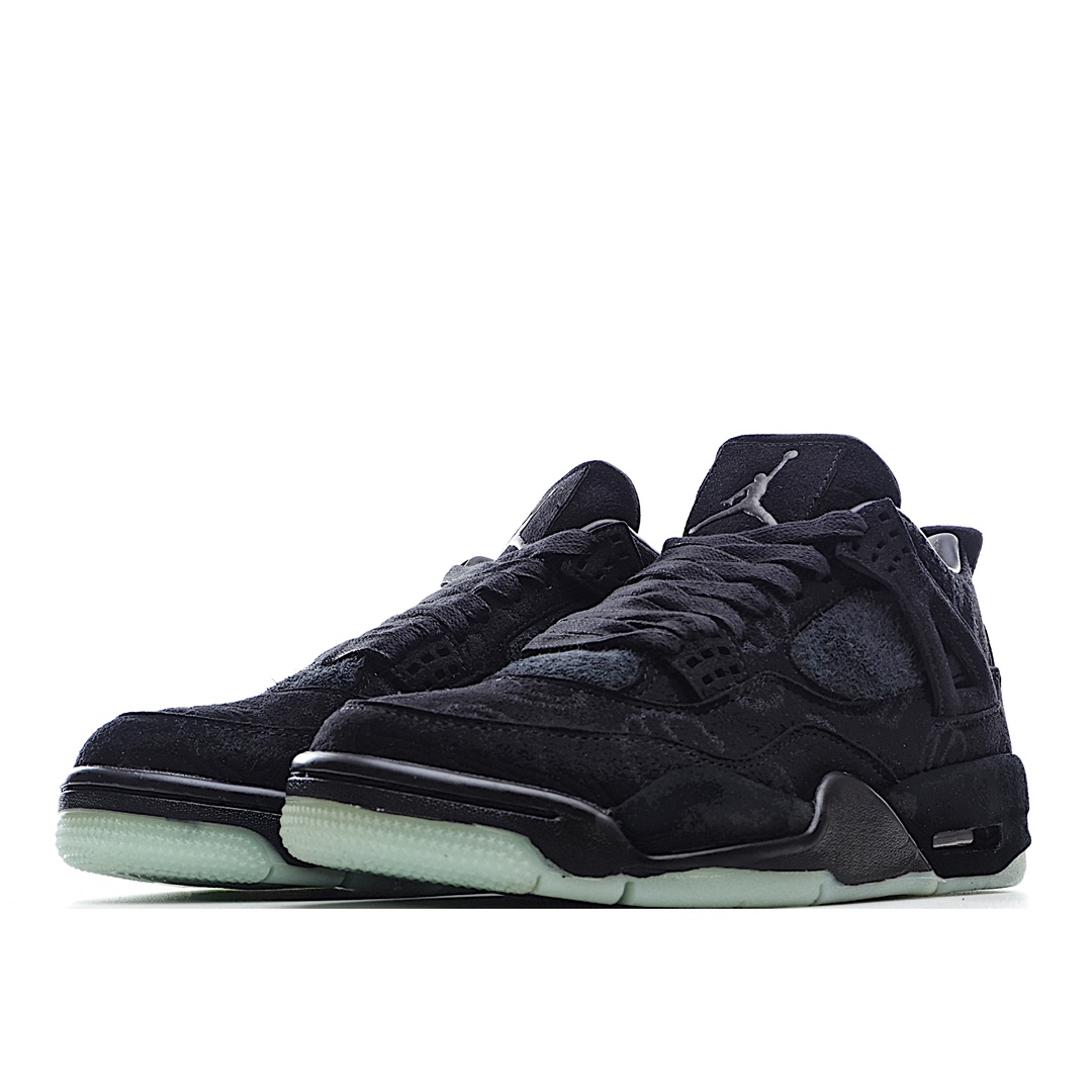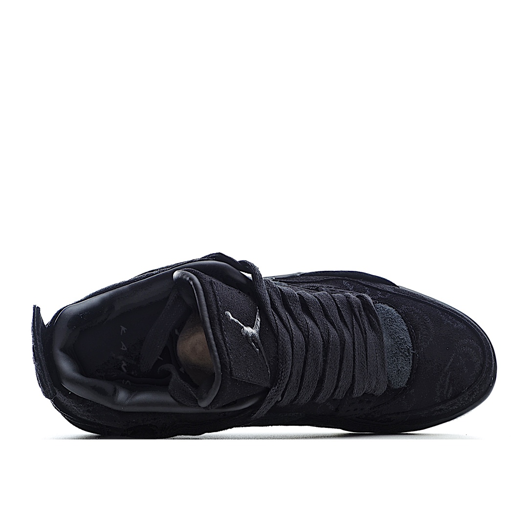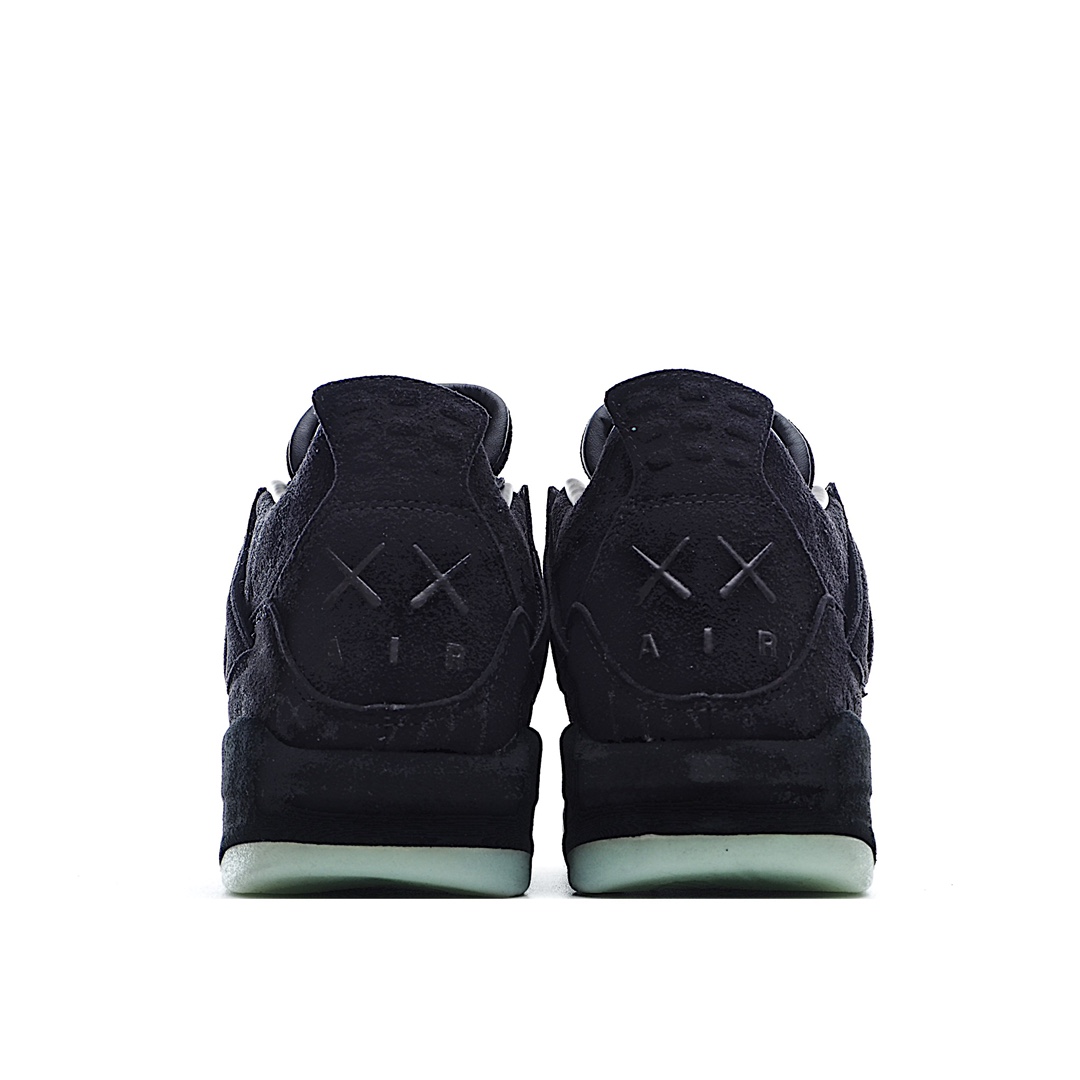 H0 KAWS x Air Jordan 4 Black AJ4 黑麂皮限量联名 夜光水晶大底 整体以酷黑装扮示人,细节设计与最终发售的灰色版本近乎相同,同样采用麂皮材质打造。鞋身布满 KAWS 标志性Companion 图案,后跟缀有黑色 “XX” 字母表明身份,最后以一袭透明大底收尾,整双鞋的低调奢华感油然而生!