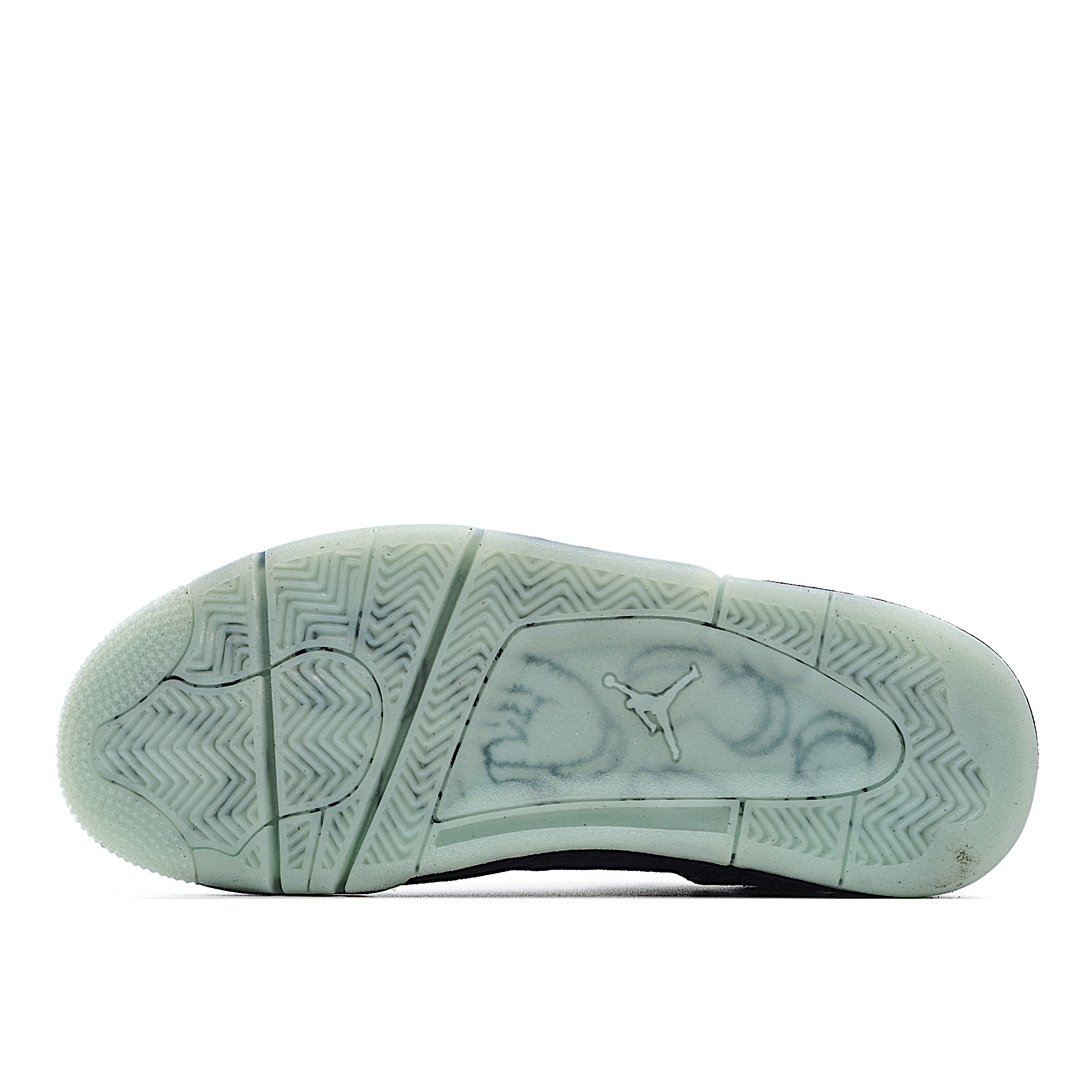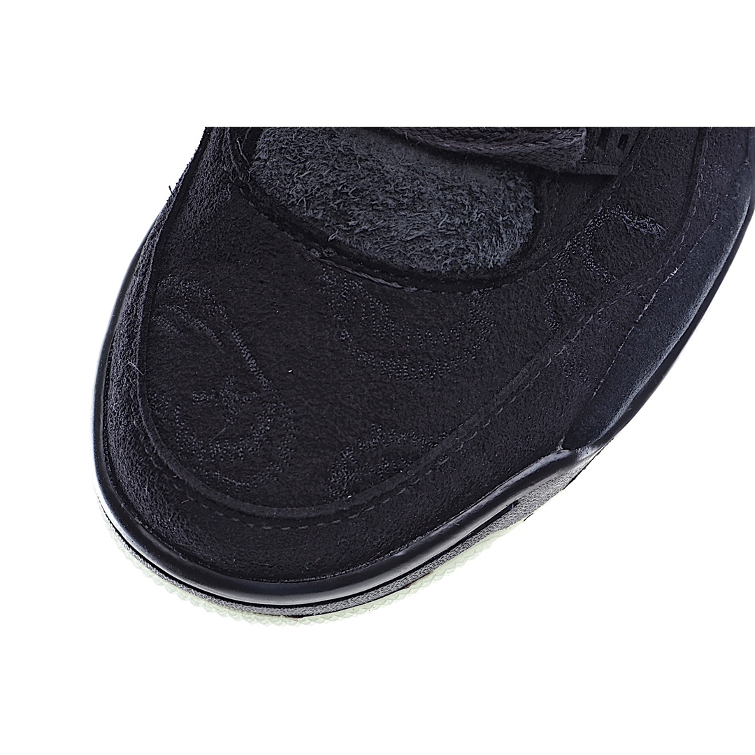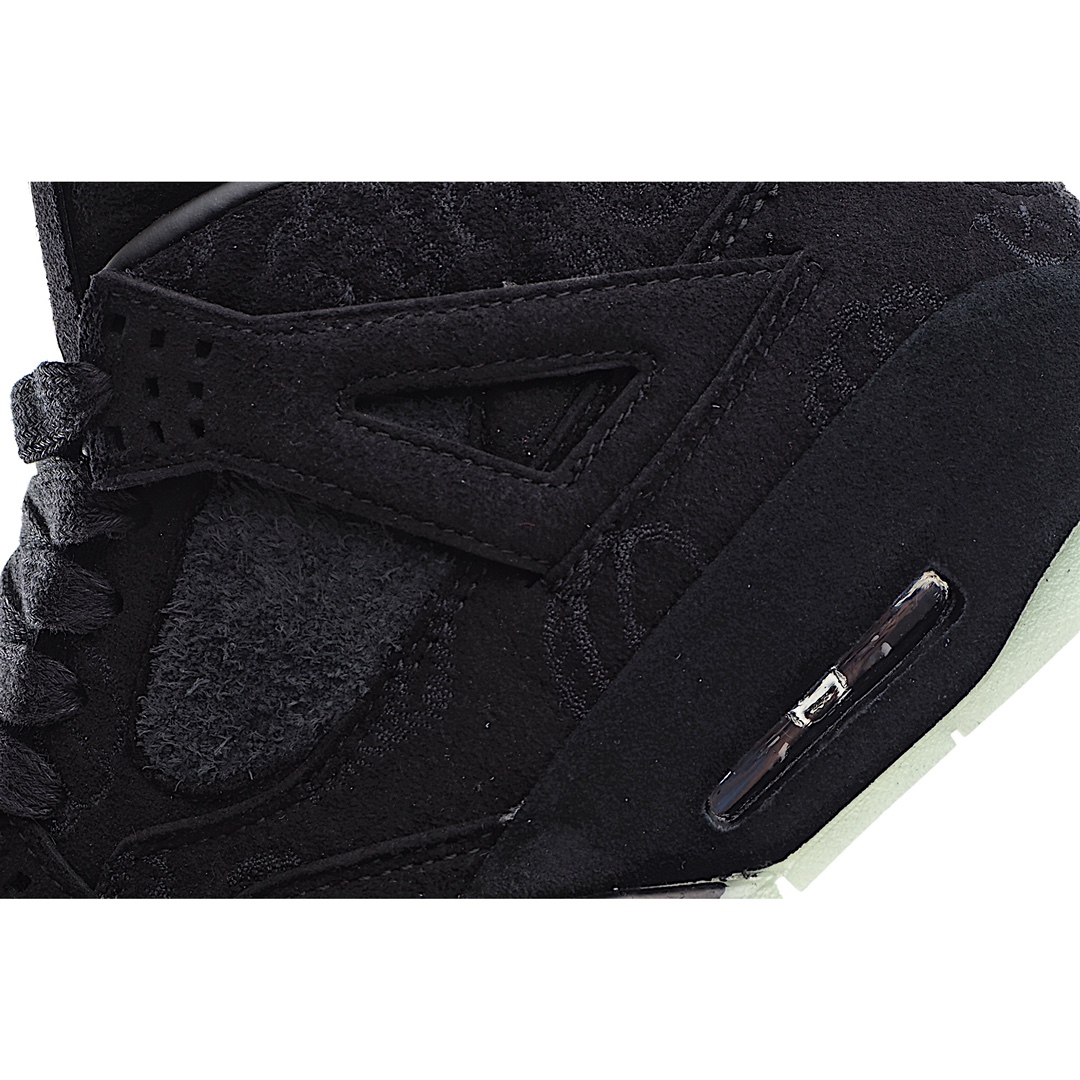 H0 KAWS x Air Jordan 4 Black AJ4 黑麂皮限量联名 夜光水晶大底 整体以酷黑装扮示人,细节设计与最终发售的灰色版本近乎相同,同样采用麂皮材质打造。鞋身布满 KAWS 标志性Companion 图案,后跟缀有黑色 “XX” 字母表明身份,最后以一袭透明大底收尾,整双鞋的低调奢华感油然而生!