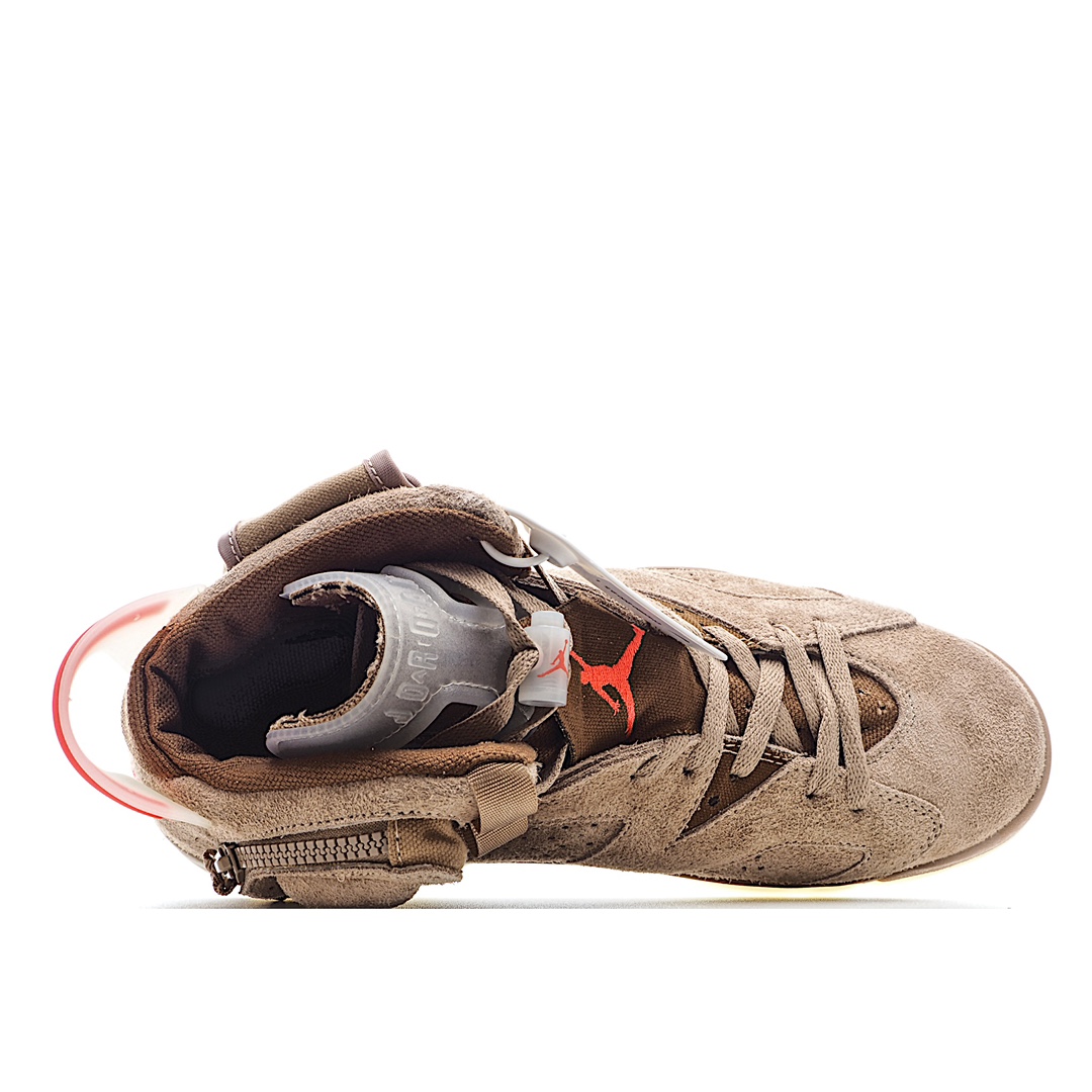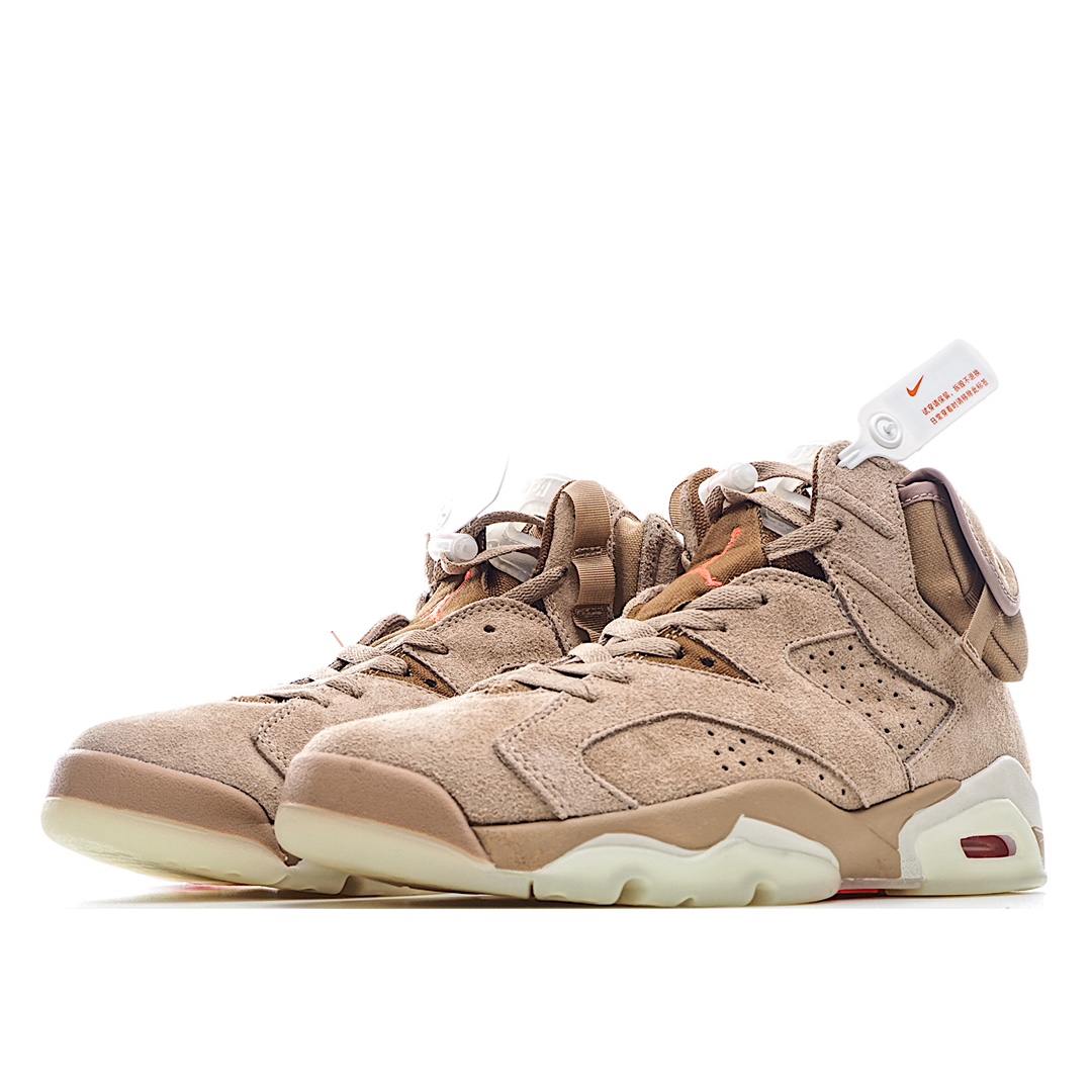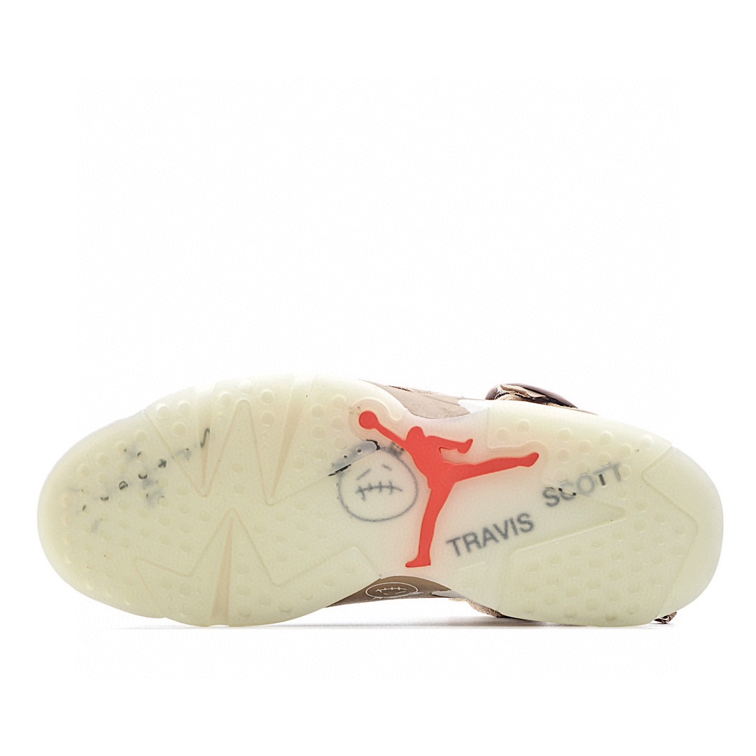 I0 纯原 Travis Scott Air Jordan 6 British Khaki 夜光反光篮球鞋 全新的 Travis Scott x Air Jordan 6 采用了不同于前作的翻毛皮材质,以棕色色调贯穿全身。红色 Jumpman Logo 居中点缀,鞋舌侧边缀有 Travis Scott Logo,并且极具工装韵味,很好穿搭极具街头辨识度。细节设计与此前大不相同,鞋帮内侧位置以拉链设计妆点,中底上缀有 Travis Scott 经典的笑脸 Logo。最后以乳白色水晶大底收尾,并缀以笑脸 Logo 和镜像的 Travis Scott 字样,完善整体造型设计。