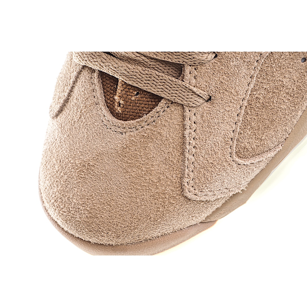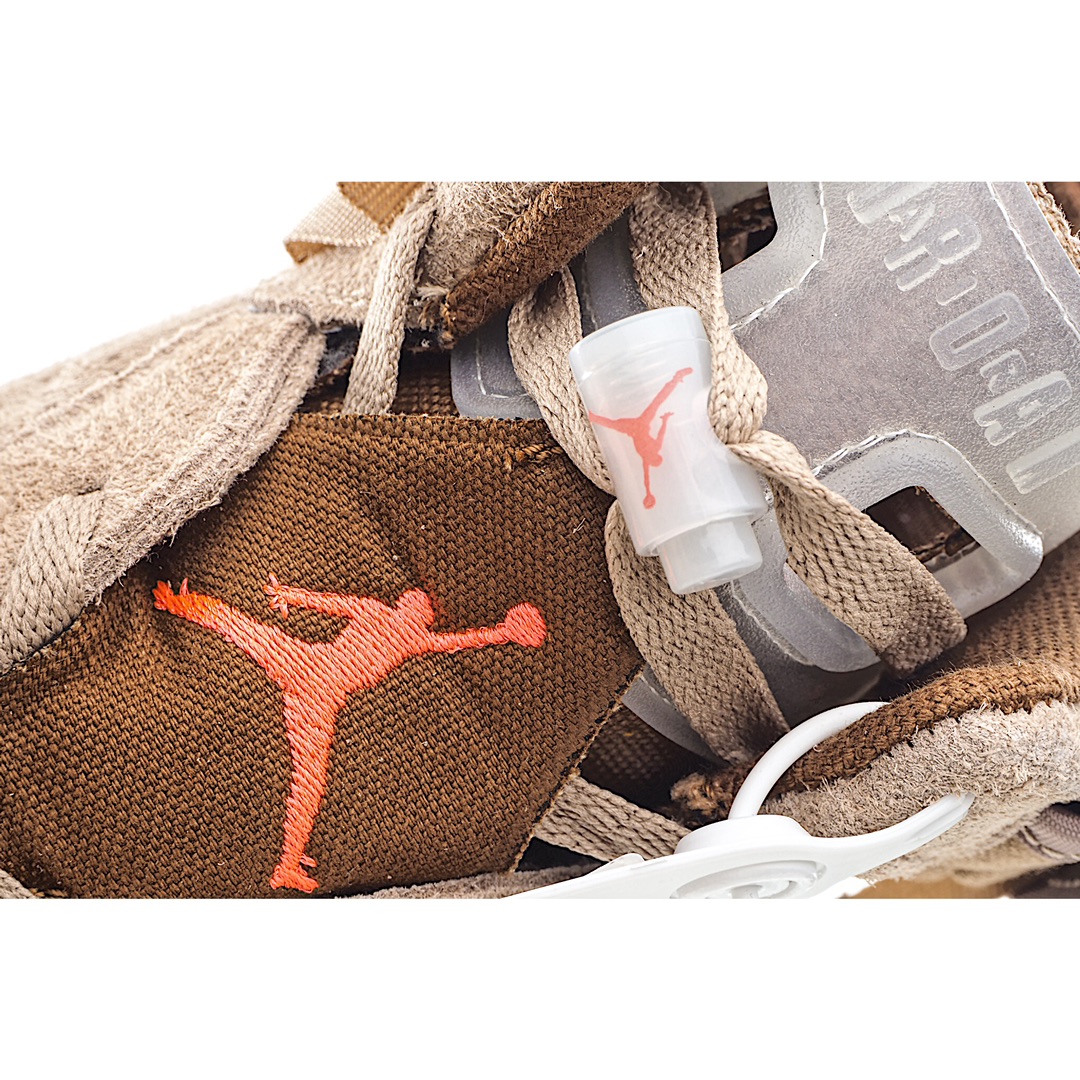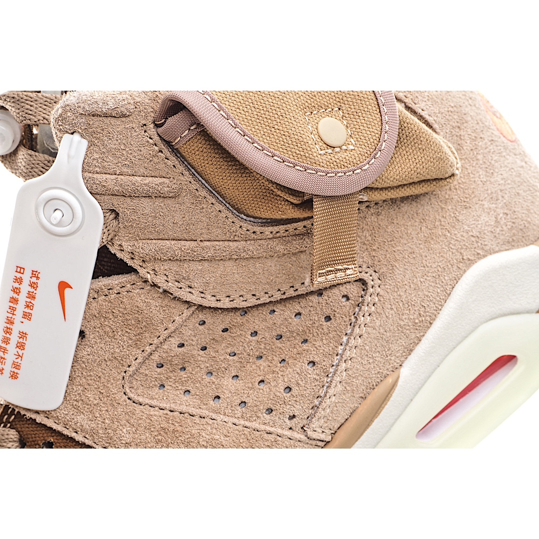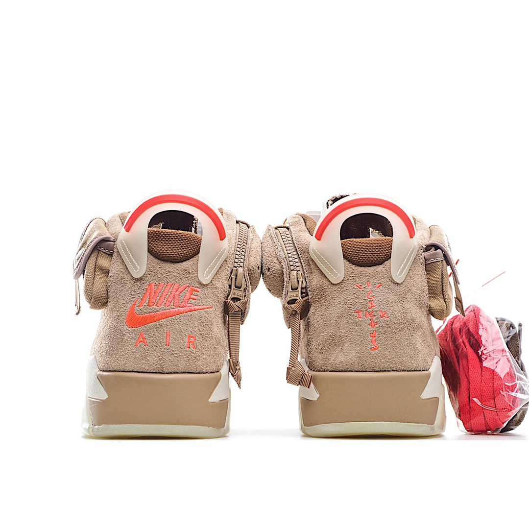 I0 纯原 Travis Scott Air Jordan 6 British Khaki 夜光反光篮球鞋 全新的 Travis Scott x Air Jordan 6 采用了不同于前作的翻毛皮材质,以棕色色调贯穿全身。红色 Jumpman Logo 居中点缀,鞋舌侧边缀有 Travis Scott Logo,并且极具工装韵味,很好穿搭极具街头辨识度。细节设计与此前大不相同,鞋帮内侧位置以拉链设计妆点,中底上缀有 Travis Scott 经典的笑脸 Logo。最后以乳白色水晶大底收尾,并缀以笑脸 Logo 和镜像的 Travis Scott 字样,完善整体造型设计。