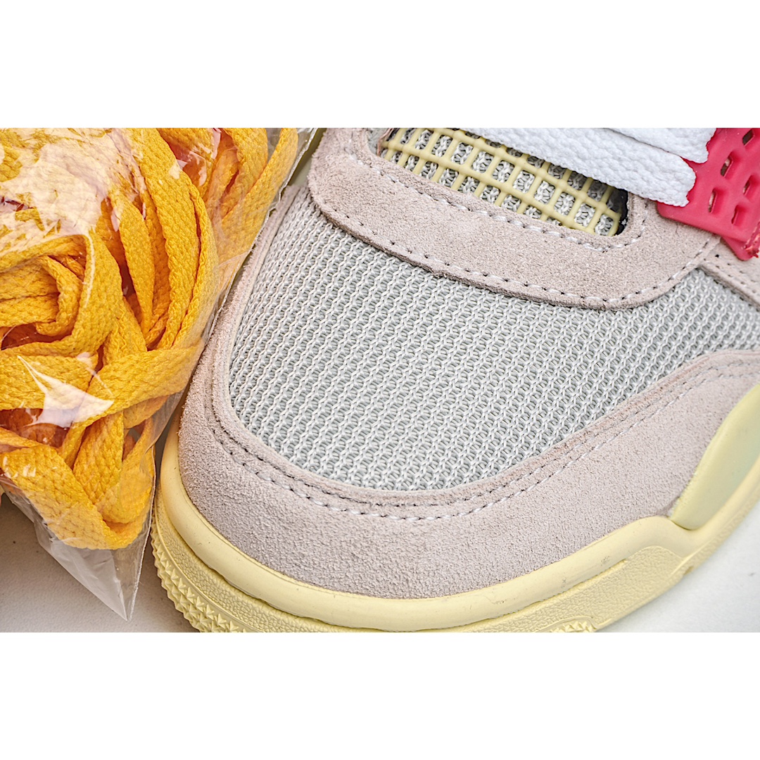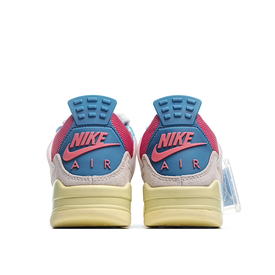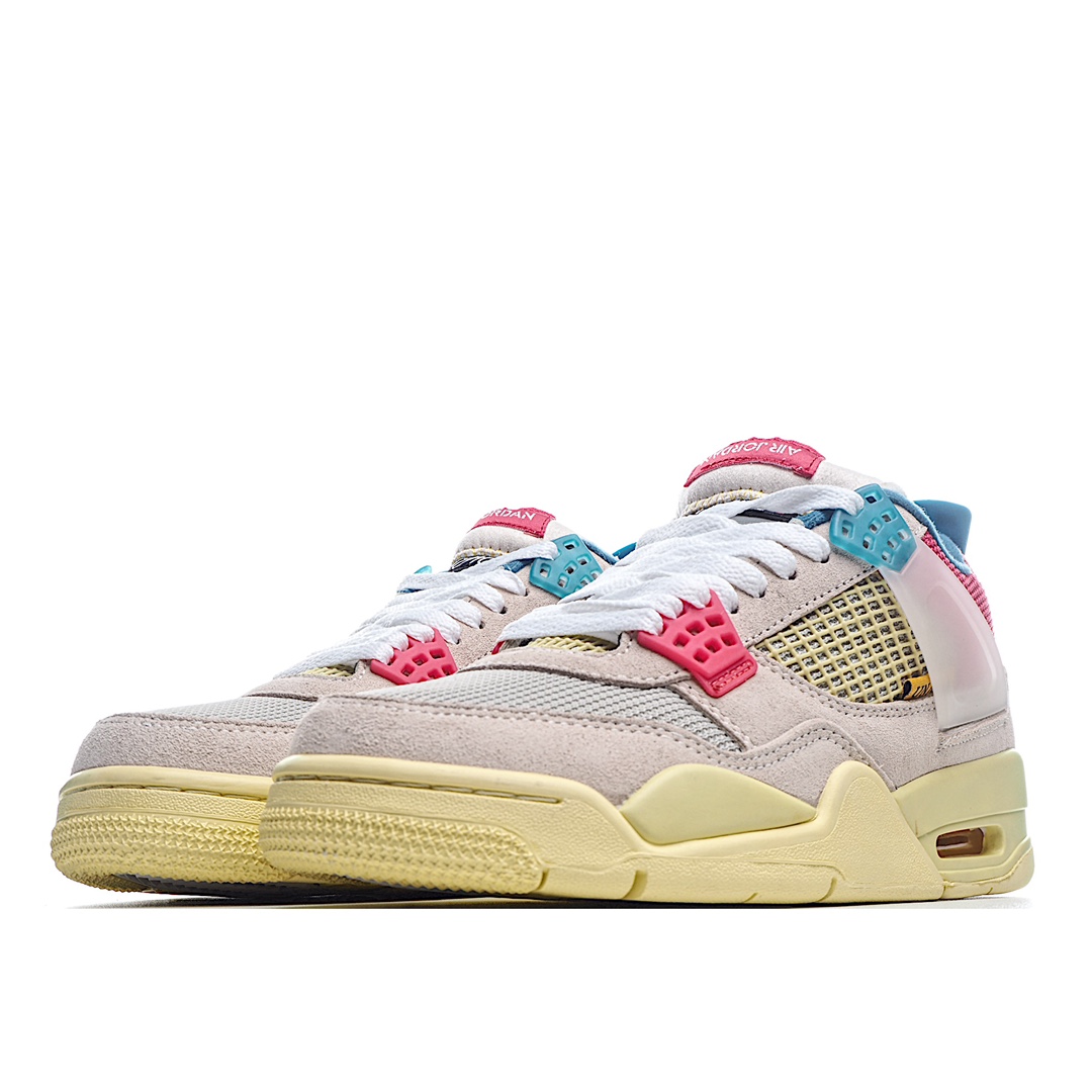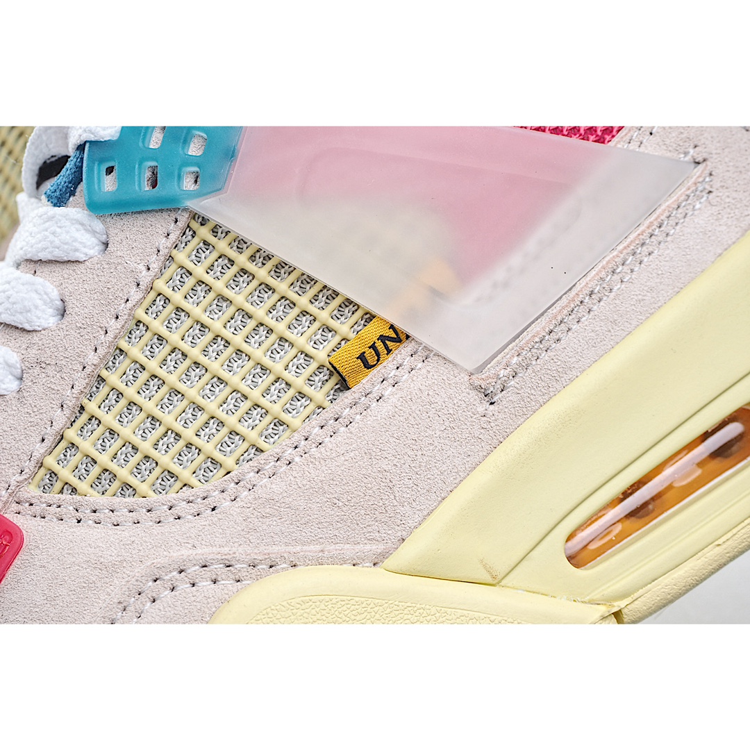 I0 Union x Nike Air Jordan 4 天价联名 蓝海岸 粉红蓝鞋身上经典的网格开窗部位缝有联名标签。鞋舌是最特别的细节之一,鞋舌长度变短并改为海绵材质,缝有 “AIR JORDAN” 字样。搭载自带氧化效果的黄色鞋底,后跟则是鲜艳夺目的 Nike Air 标志,遵从了 OG 元年的设计