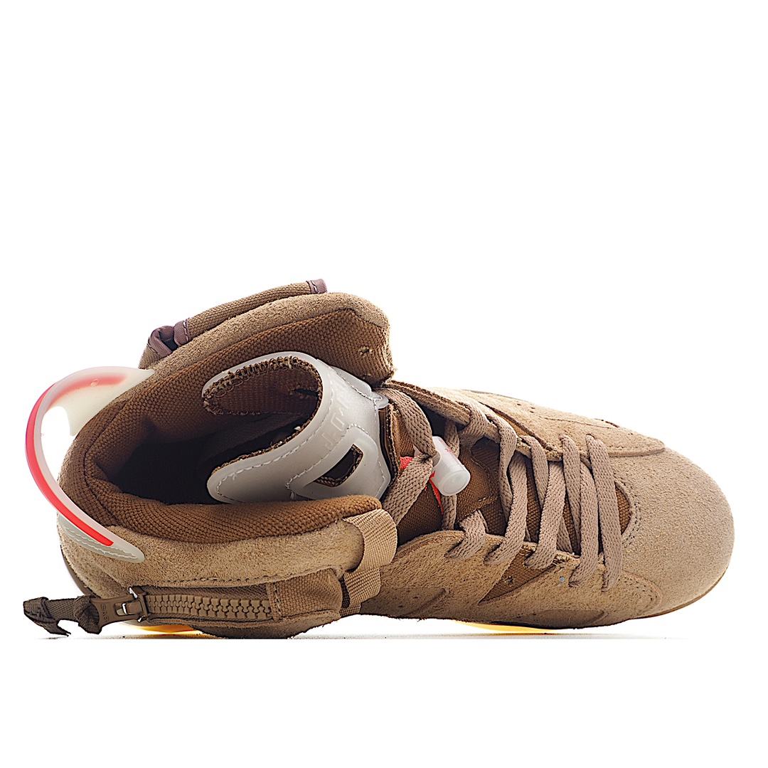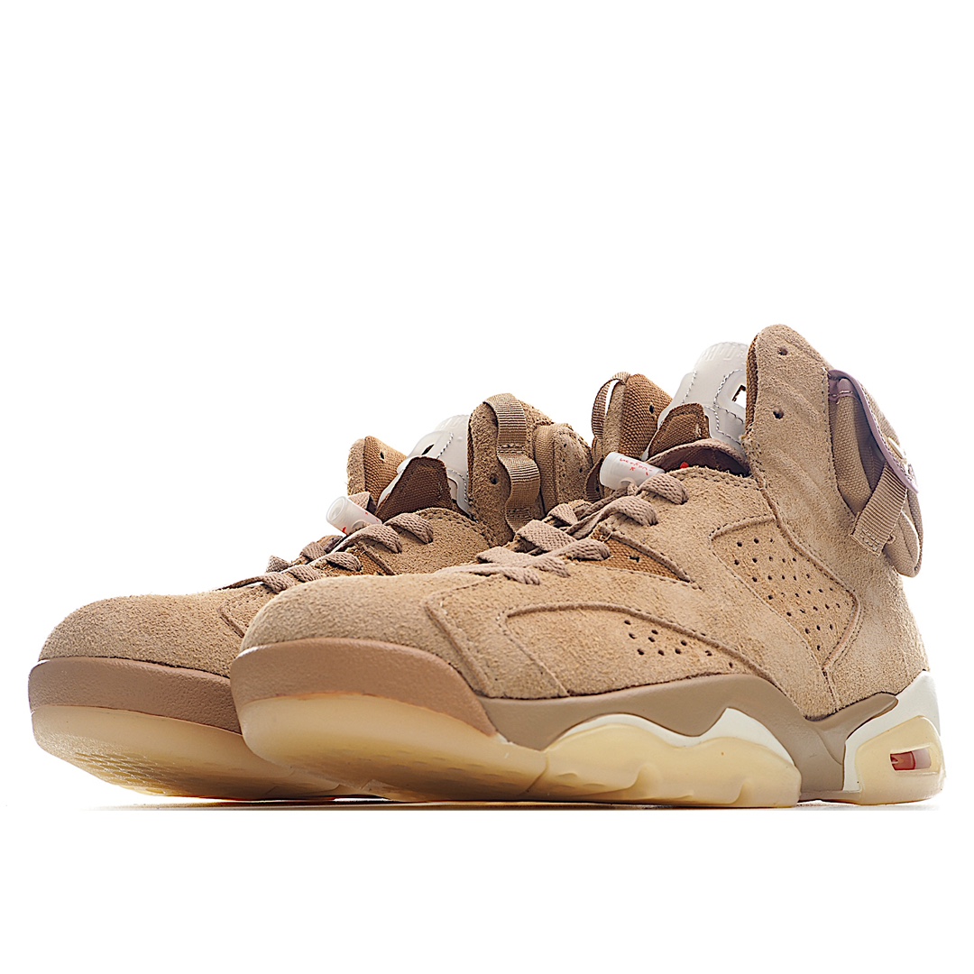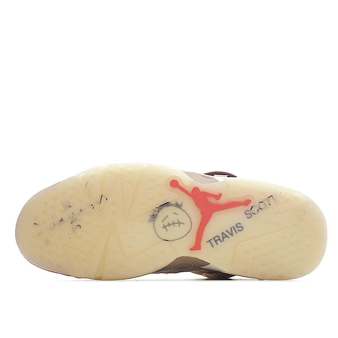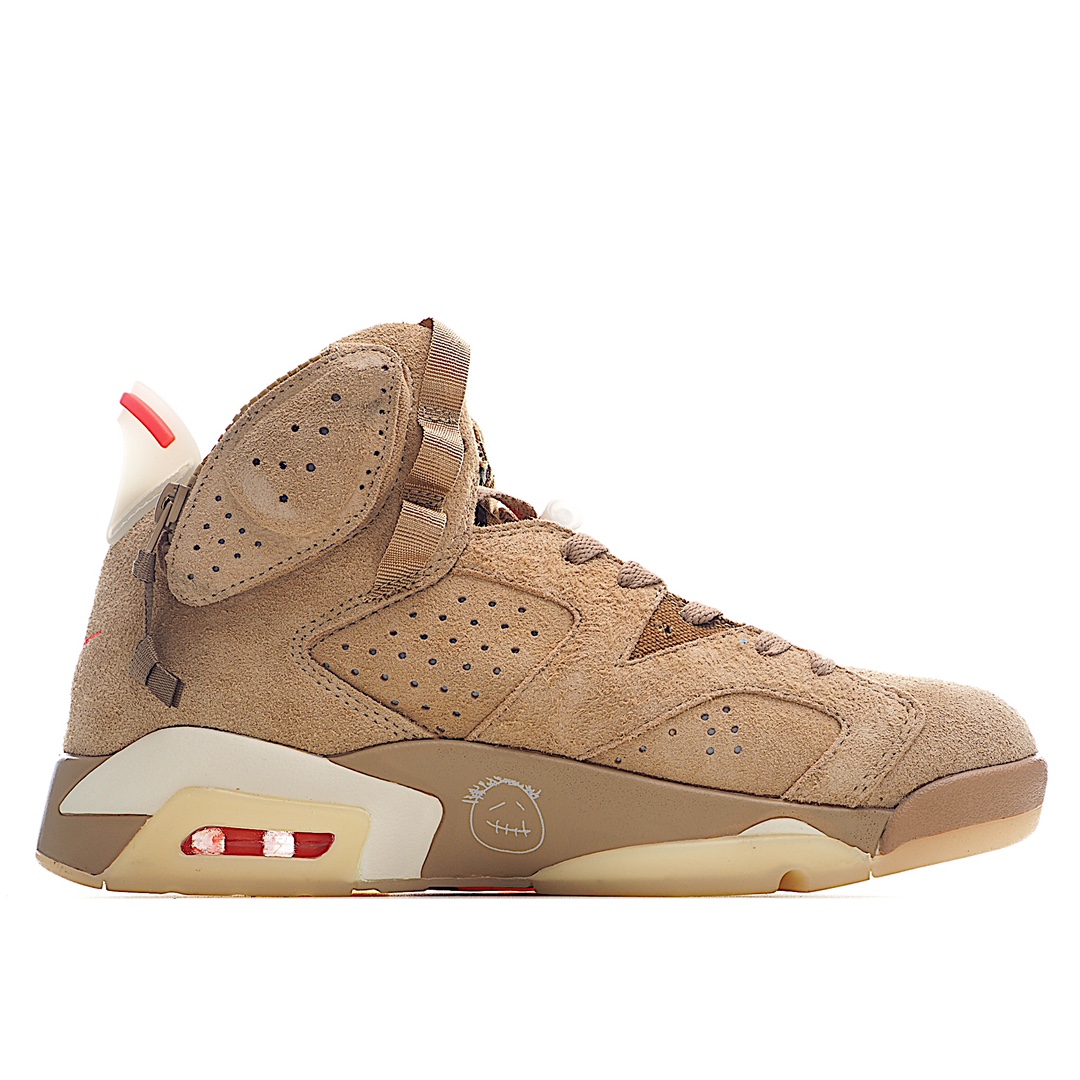 K0 纯原Travis Scott Air Jordan 6 British Khaki 夜光反光篮球鞋 全新的 Travis Scott x Air Jordan 6 采用了不同于前作的翻毛皮材质,以棕色色调贯穿全身。红色 Jumpman Logo 居中点缀,鞋舌侧边缀有 Travis Scott Logo,并且极具工装韵味,很好穿搭极具街头辨识度。细节设计与此前大不相同,鞋帮内侧位置以拉链设计妆点,中底上缀有 Travis Scott 经典的笑脸 Logo。最后以乳白色水晶大底收尾,并缀以笑脸 Logo 和镜像的 Travis Scott 字样,完善整体造型设计。