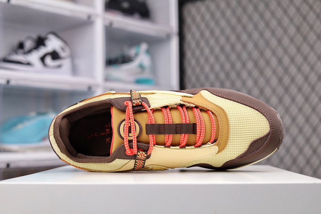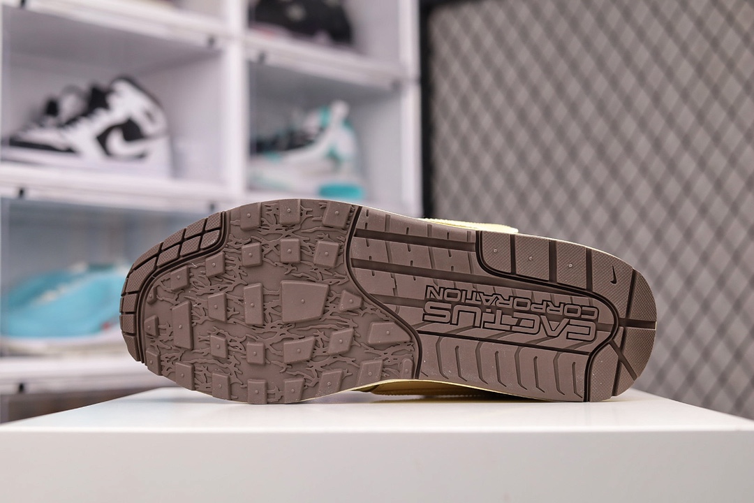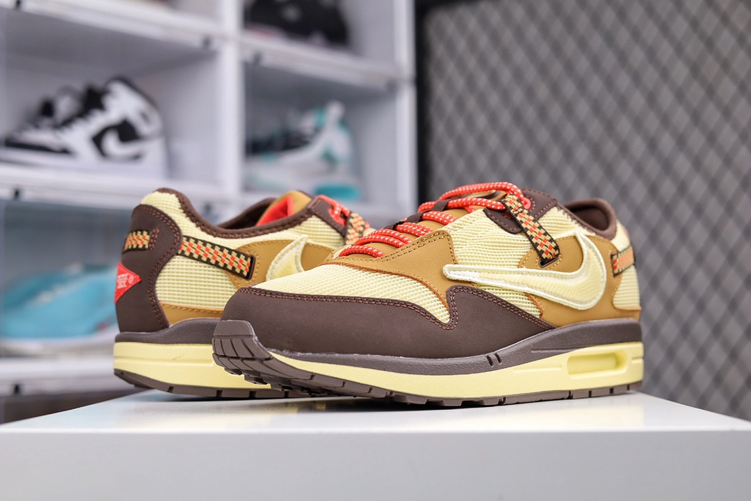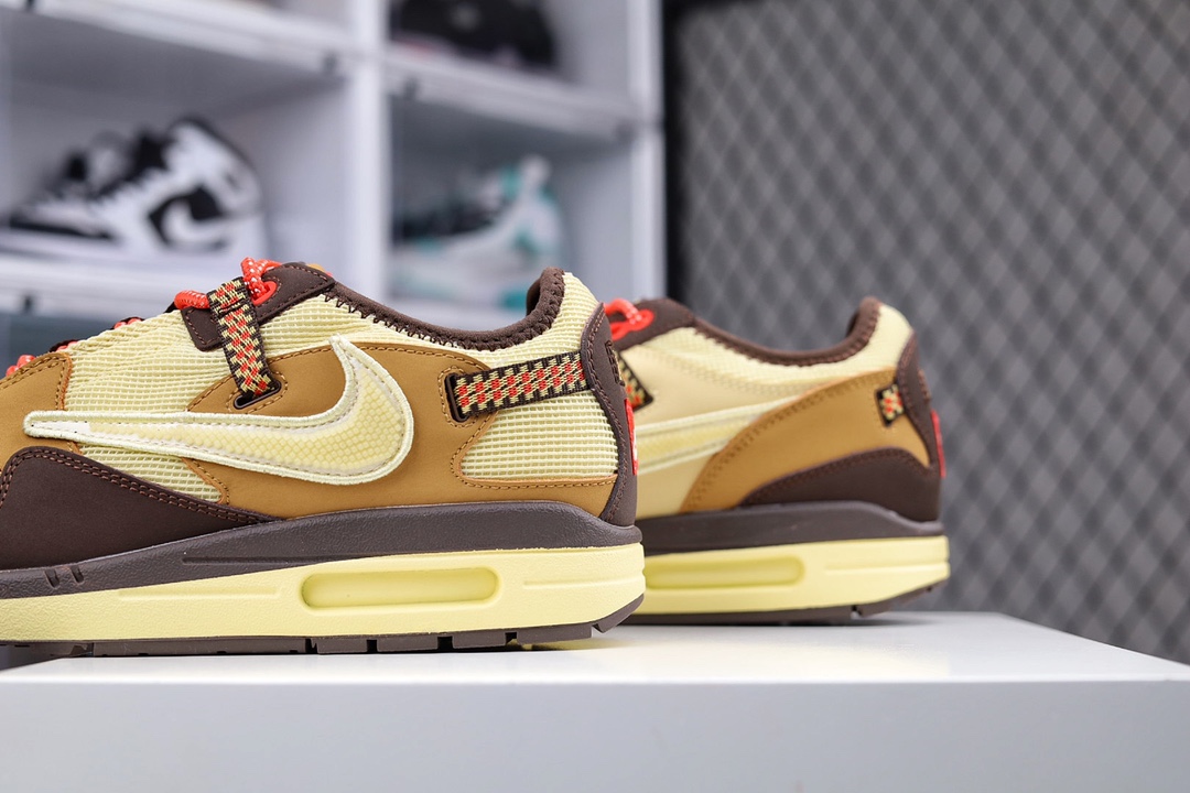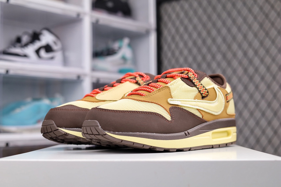 H0 Travis Scott x NK Air Max 1 “Cactus Jack” 重磅联名 棕黄 鞋款采用棕色及乳白色打造鞋面,在鞋款前后部分皆包裹有咖啡色护边。鞋侧的 Swoosh 依旧进行了倒置处理,也是 Travis Scott 的标志性设计。鞋款后跟处点缀有三角形 Logo,鞋底部分采用黄色搭配深色外底打造。鞋舌、鞋跟均有彰显联名身份的图案装点,材质上则是尼龙网面、磨砂皮革等组合而成,质感、细节均有着不错的表现×558XQ