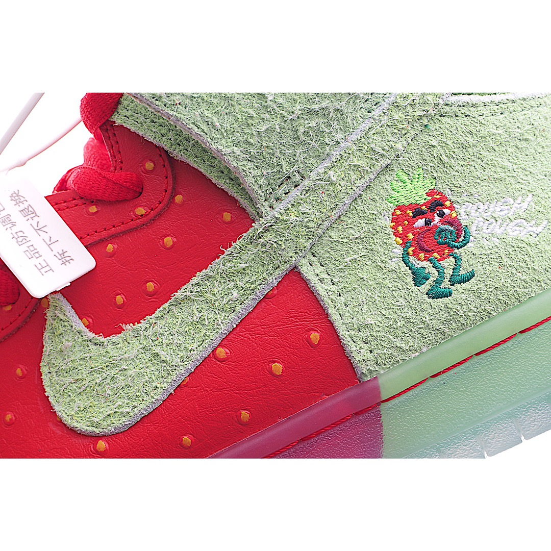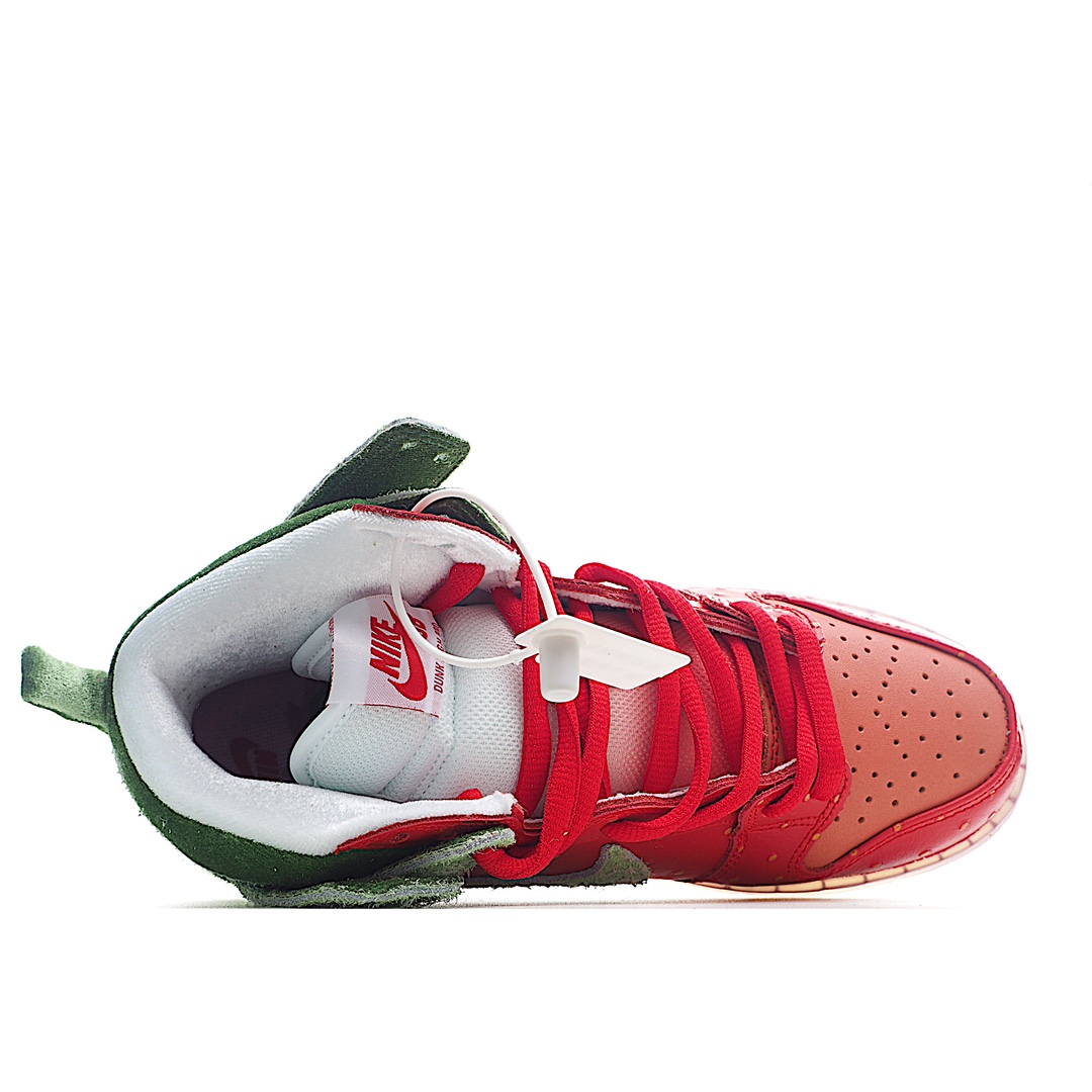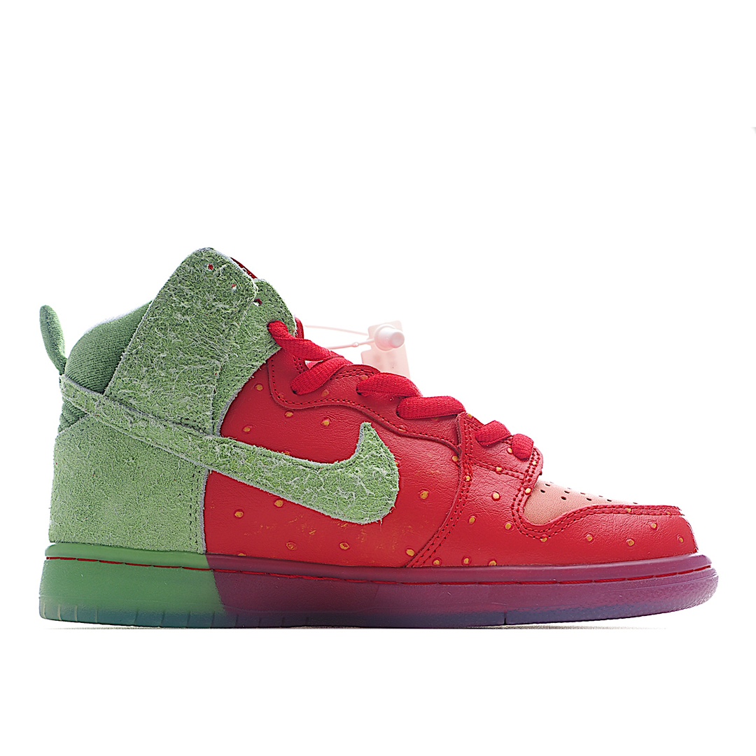 I5 Nk SB Dunk High“Strawberry Cough”草莓绿配色休闲滑板鞋鞋面以红色皮革和绿色长绒翻毛皮打造,分别代表草莓的果肉和绿叶。红色部分还有点状设计,传神地还原草莓籽细节撞色设计积极视觉冲击力,上脚辨识度极高,可能是近期设计最大胆的 Dunk 新品
