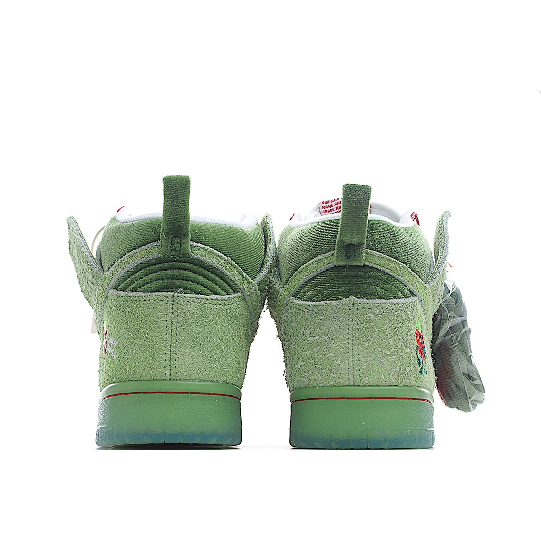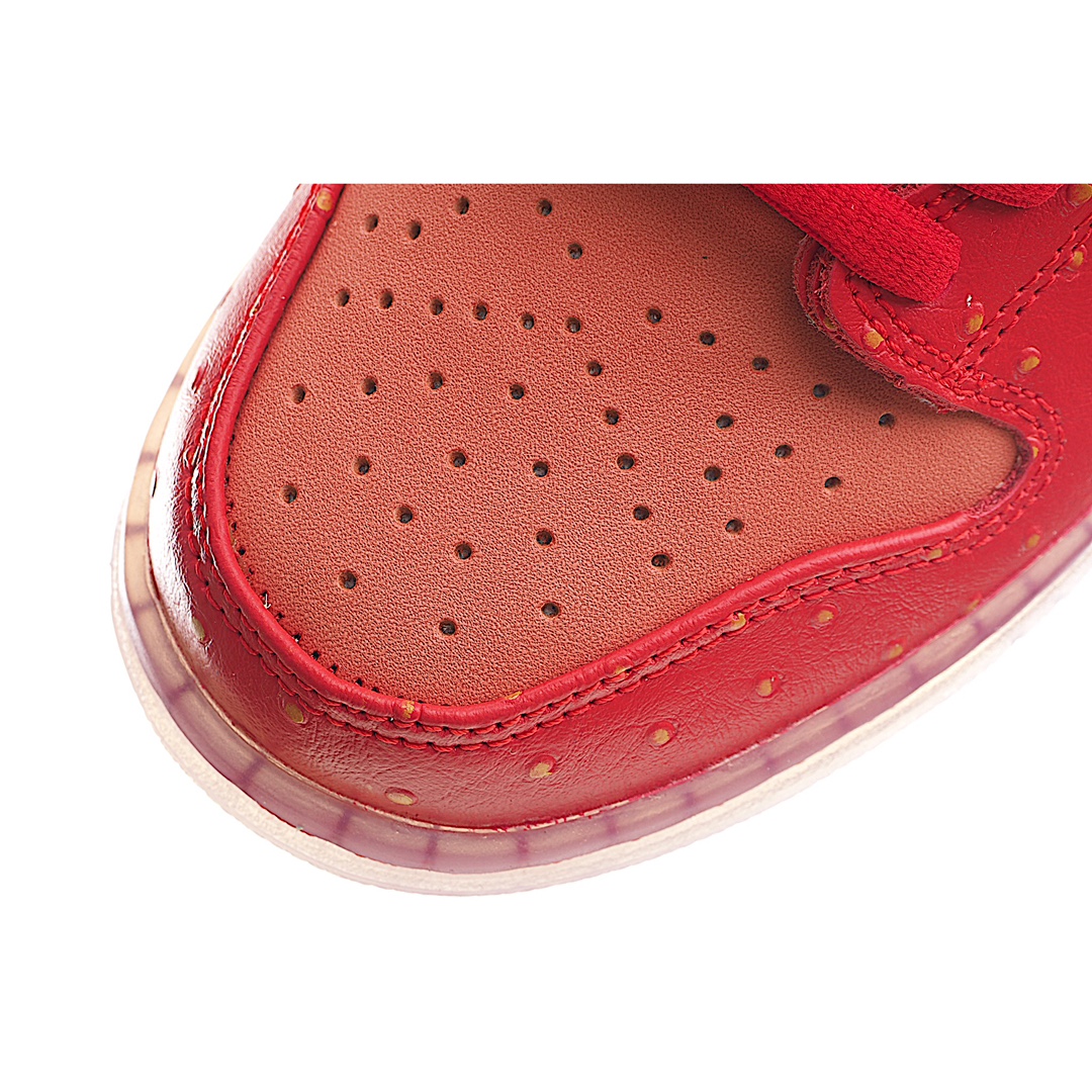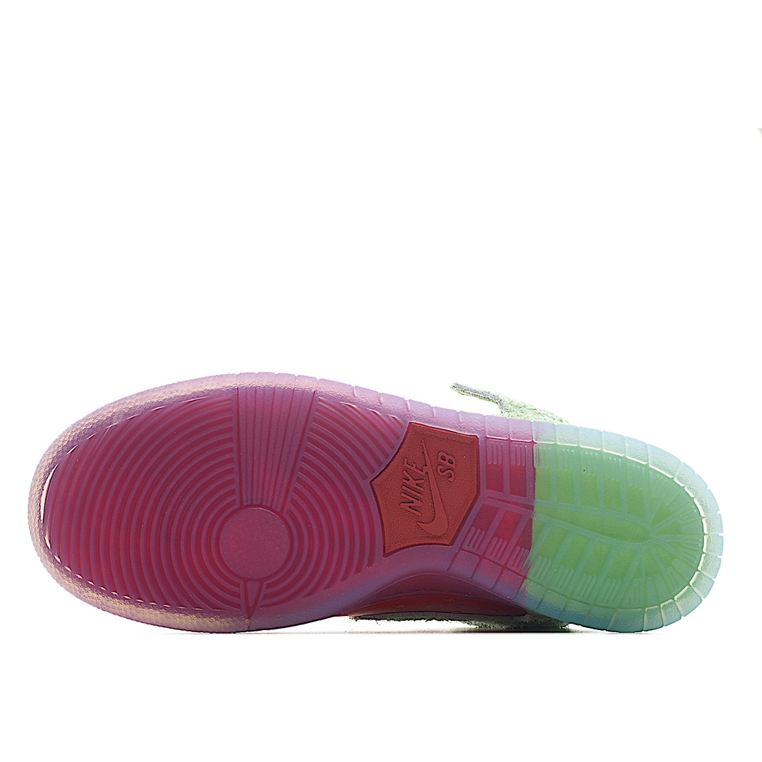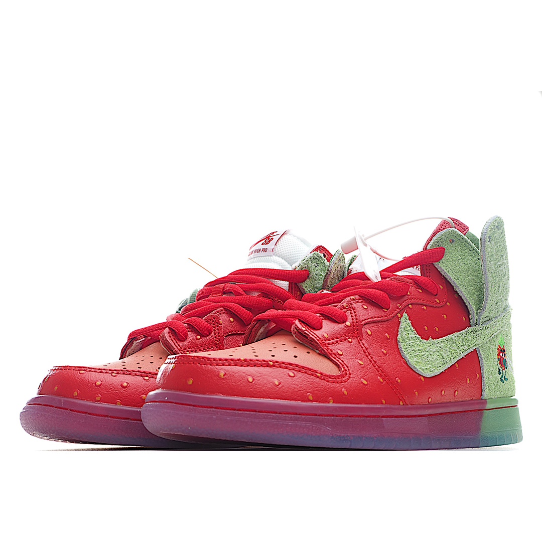 I5 Nk SB Dunk High“Strawberry Cough”草莓绿配色休闲滑板鞋鞋面以红色皮革和绿色长绒翻毛皮打造,分别代表草莓的果肉和绿叶。红色部分还有点状设计,传神地还原草莓籽细节撞色设计积极视觉冲击力,上脚辨识度极高,可能是近期设计最大胆的 Dunk 新品