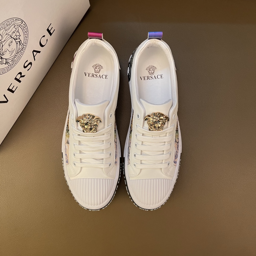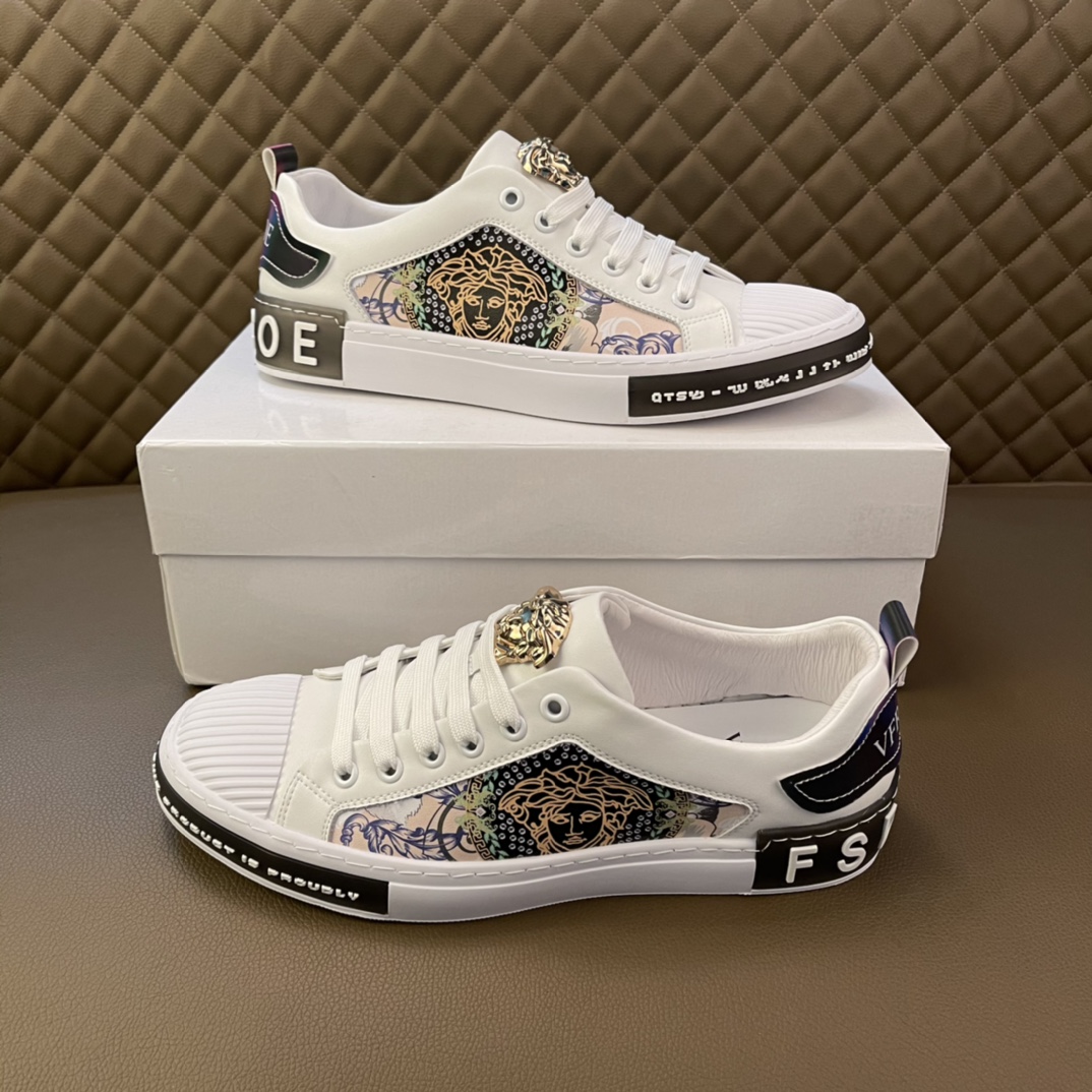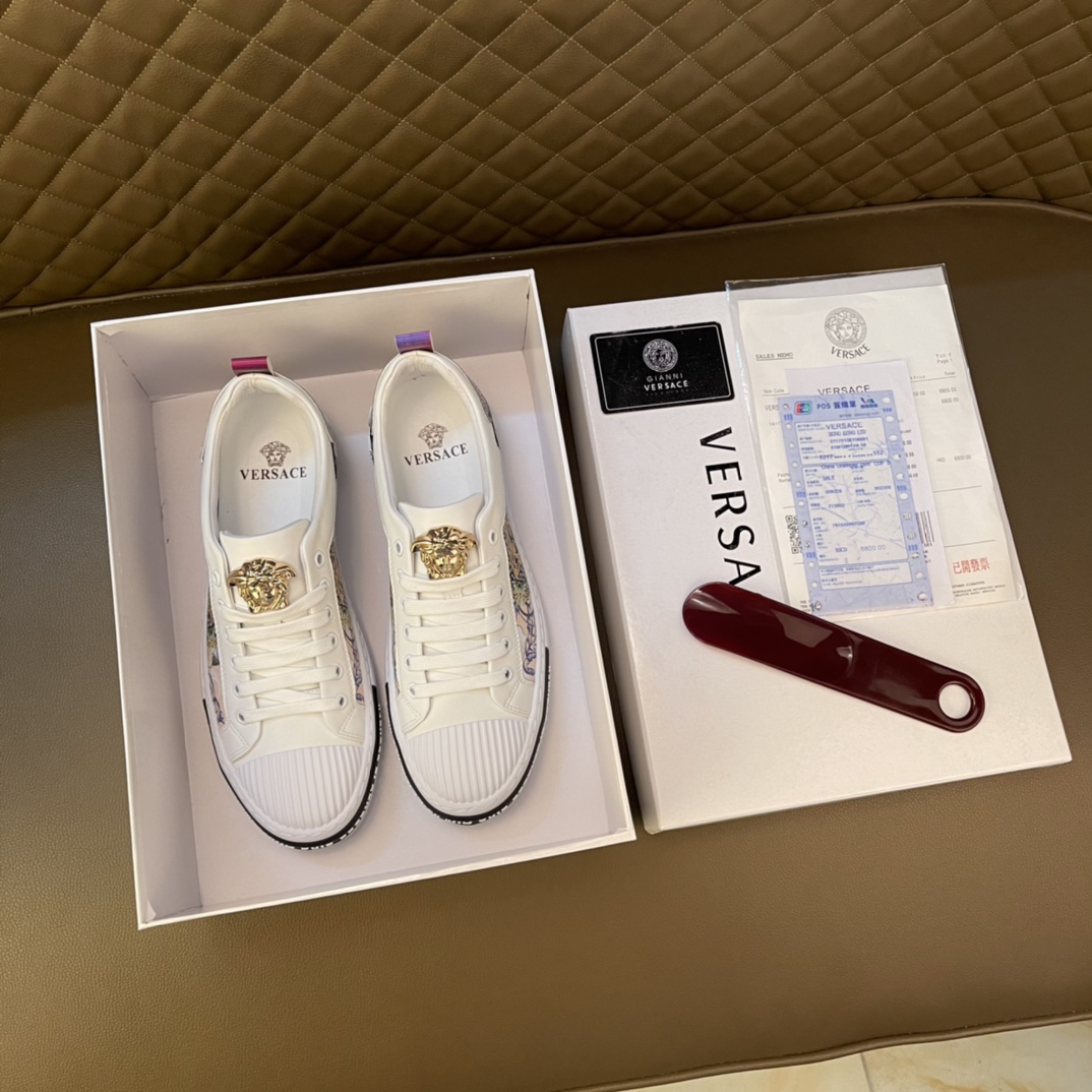 I5 最高品质范思哲VERSACE~独领风骚2022经典低帮懒人款,原版瓦莎琪运动鞋面更是精心打造😍 材料:🐂进口头层小牛皮,羊皮内里🐑 欧美大师独特版面设计 完美打造专柜品质,懒人松紧带套脚设计 耐磨仿滑原版大底 运动跑步风设计 上脚独特的美,青年乐福款 休闲运动板鞋💓超级舒服。特供红底范思哲原版鞋面复刻 英伦范儿 适合司机驾车外出🚗 绝对的焦点 高端 优雅.男装男鞋码数38-44 45可定做 黑色白色 🉑️选 长期供实体店补货