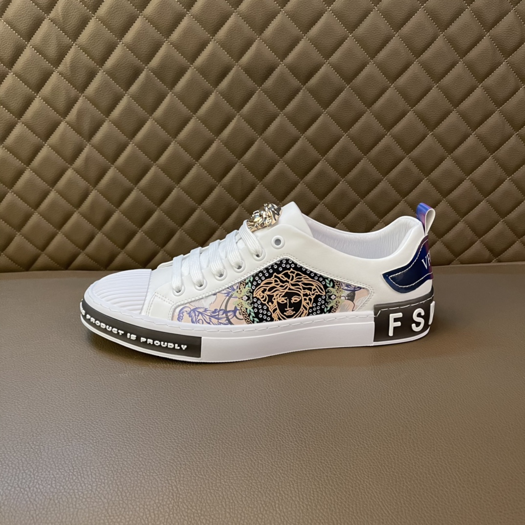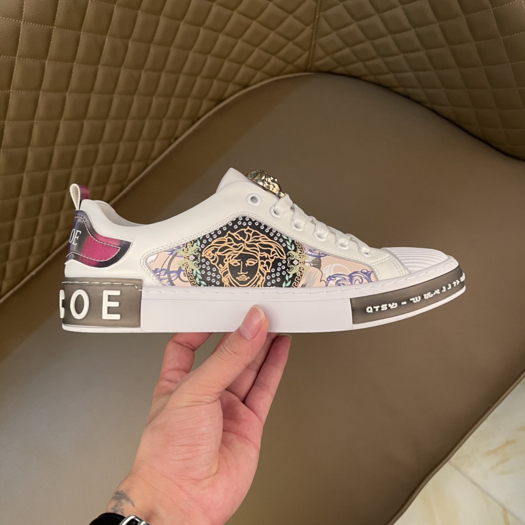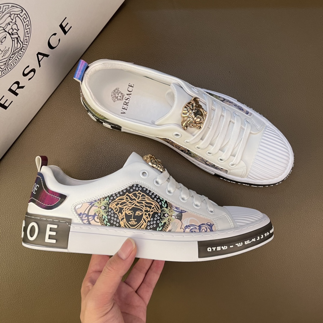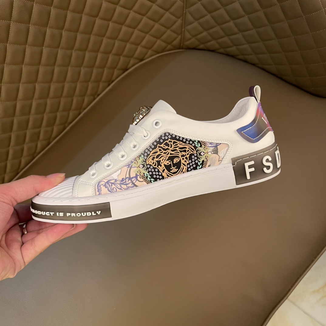 I5 最高品质范思哲VERSACE~独领风骚2022经典低帮懒人款,原版瓦莎琪运动鞋面更是精心打造😍 材料:🐂进口头层小牛皮,羊皮内里🐑 欧美大师独特版面设计 完美打造专柜品质,懒人松紧带套脚设计 耐磨仿滑原版大底 运动跑步风设计 上脚独特的美,青年乐福款 休闲运动板鞋💓超级舒服。特供红底范思哲原版鞋面复刻 英伦范儿 适合司机驾车外出🚗 绝对的焦点 高端 优雅.男装男鞋码数38-44 45可定做 黑色白色 🉑️选 长期供实体店补货