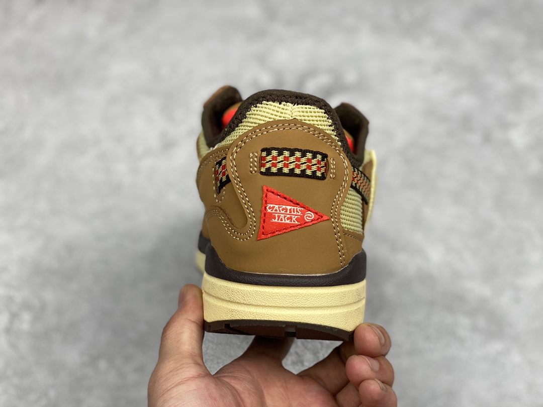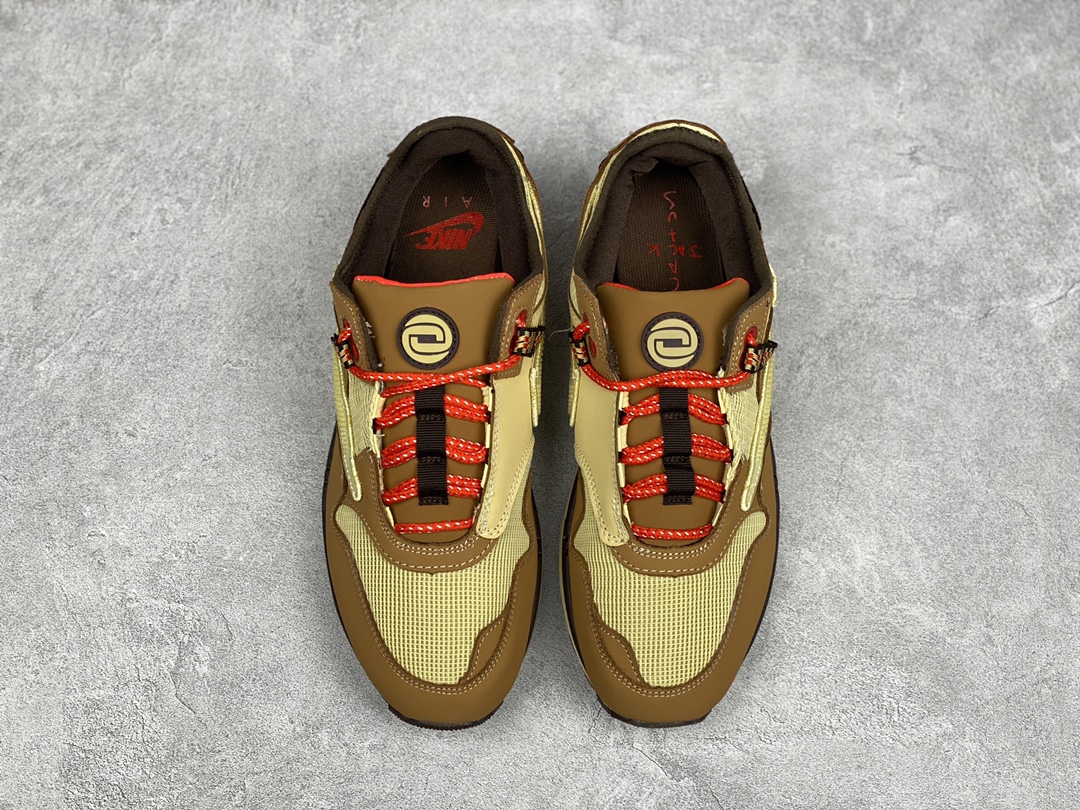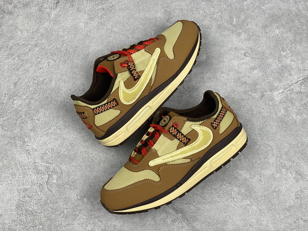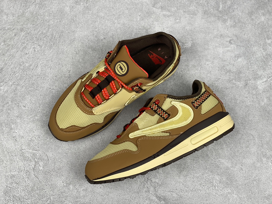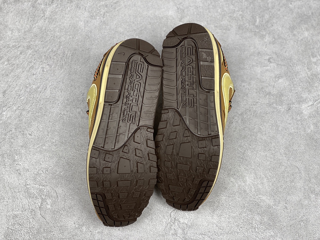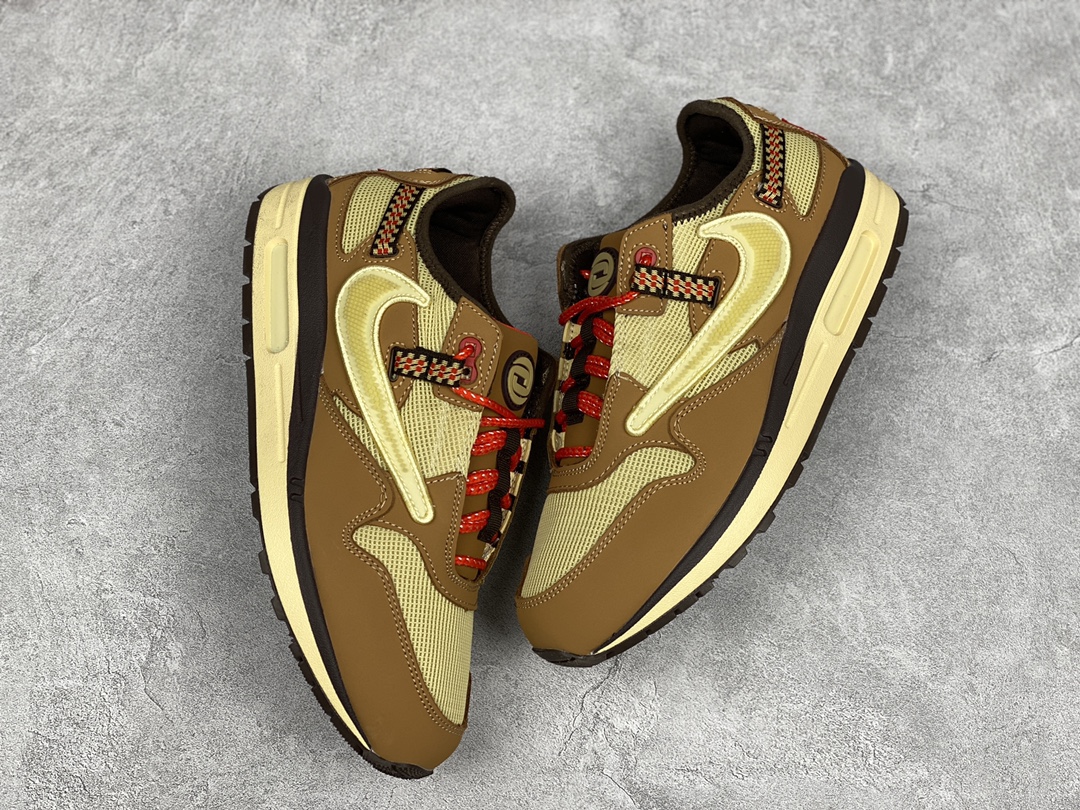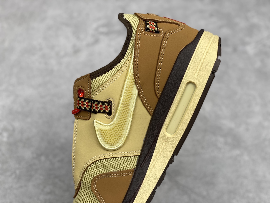 G0 公司级 Travis Scott x Nike Air Max 1″ Wheat/Lemon”改版款低帮复古百搭休闲运动慢跑鞋Travis Scott x Nike Air Max 1 “Cactus Jack” 鞋侧的 Swoosh 依旧进行了倒置处理,也是 Travis Scott 的标志性设计。鞋款后跟处点缀有三角形 Logo,鞋底部分采用黄色搭配深色外底打造。鞋舌、鞋跟均有彰显联名身份的图案装点,材质上则是尼龙网面、磨砂皮革等组合而成,质感、细节均有着不错的表现
