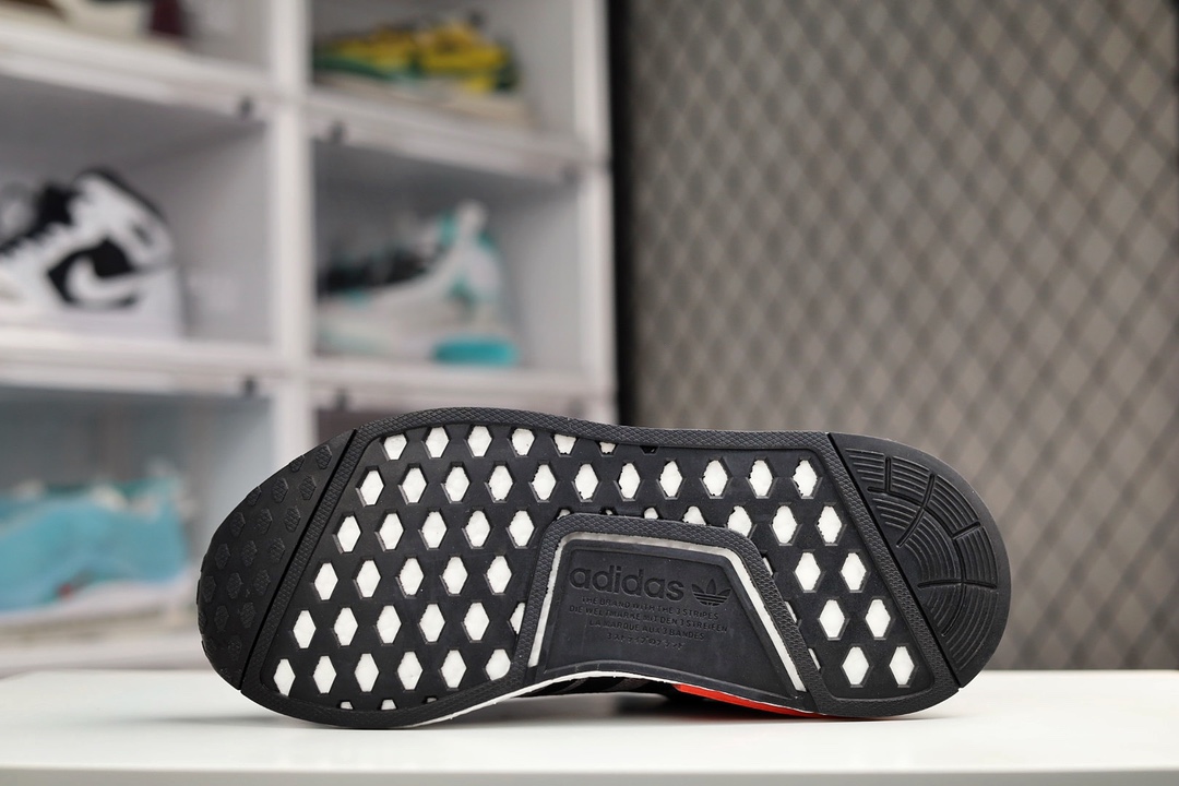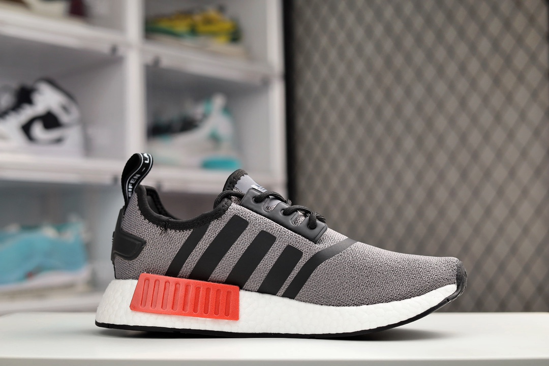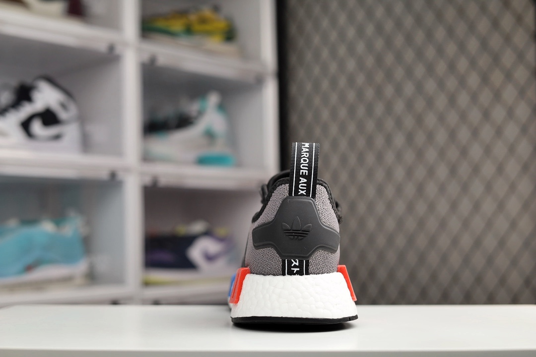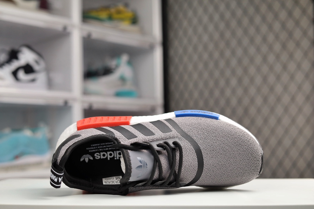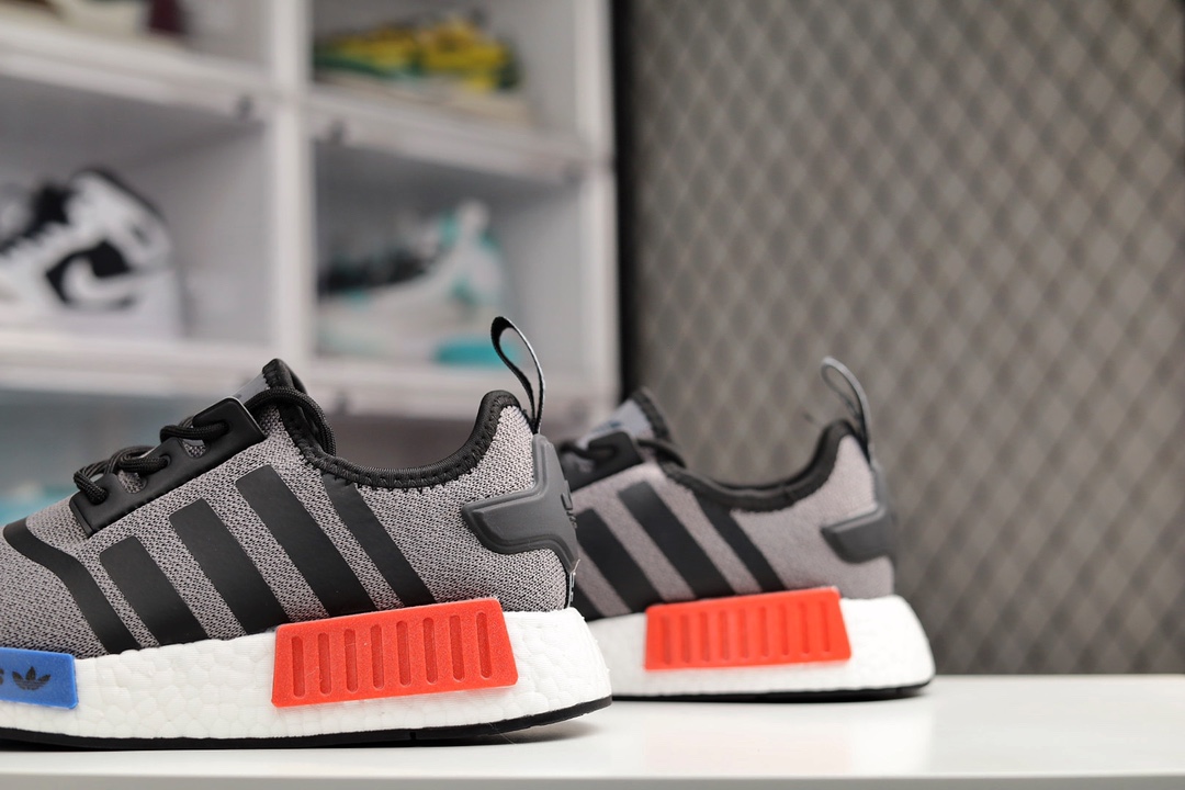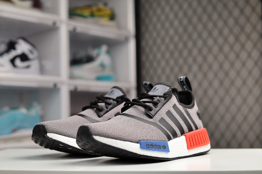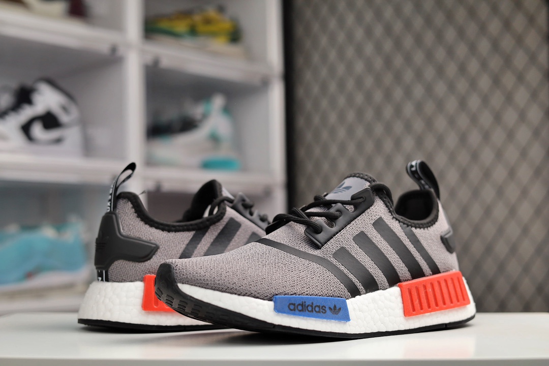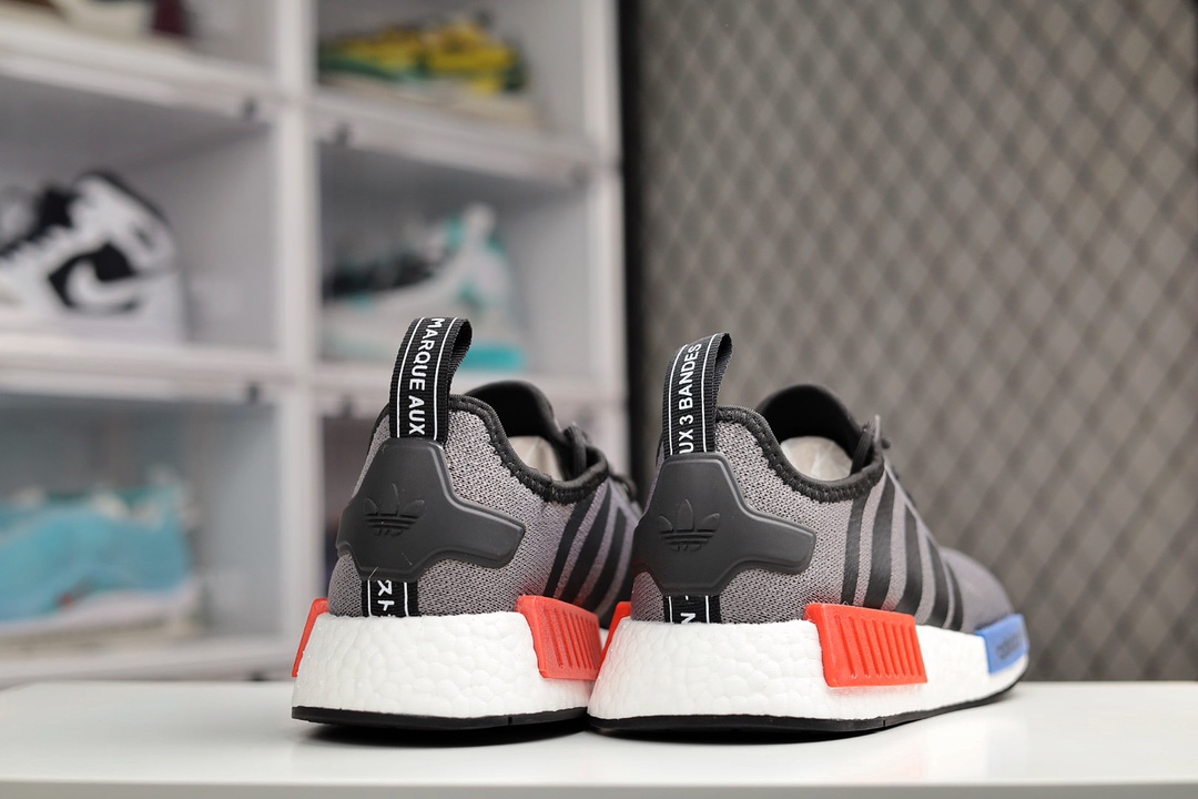 G0 男女鞋真标真爆材采用高密度针织飞织鞋面材质中底嵌入全掌Boost爆米花缓震物料外置防滑耐磨橡胶底片阿迪达斯Adidas Originals NMD_R1″Grey/Black/Blue/Red”R1系列低帮百搭休闲运动跑步鞋“针织深灰黑宝蓝红”