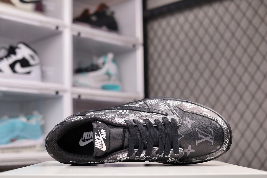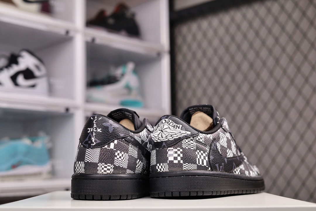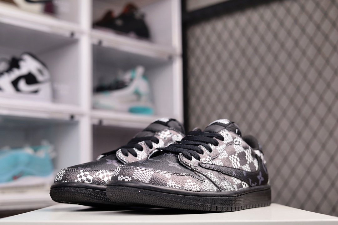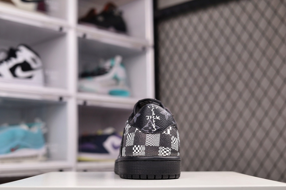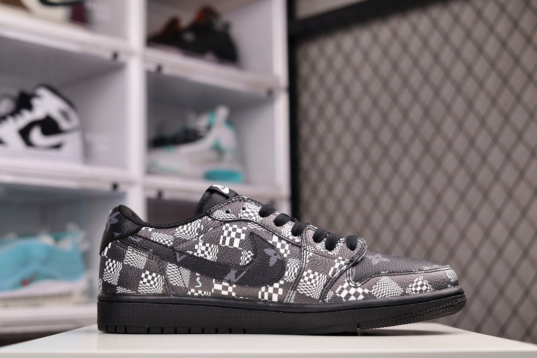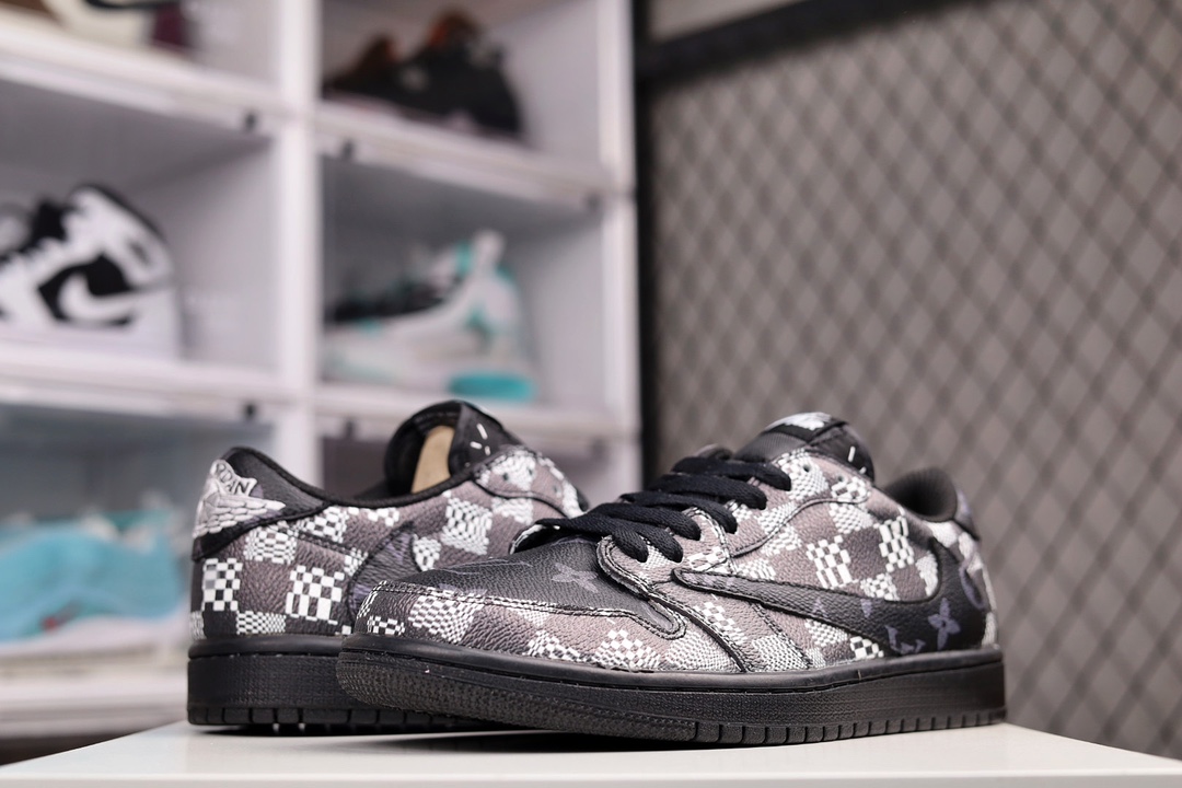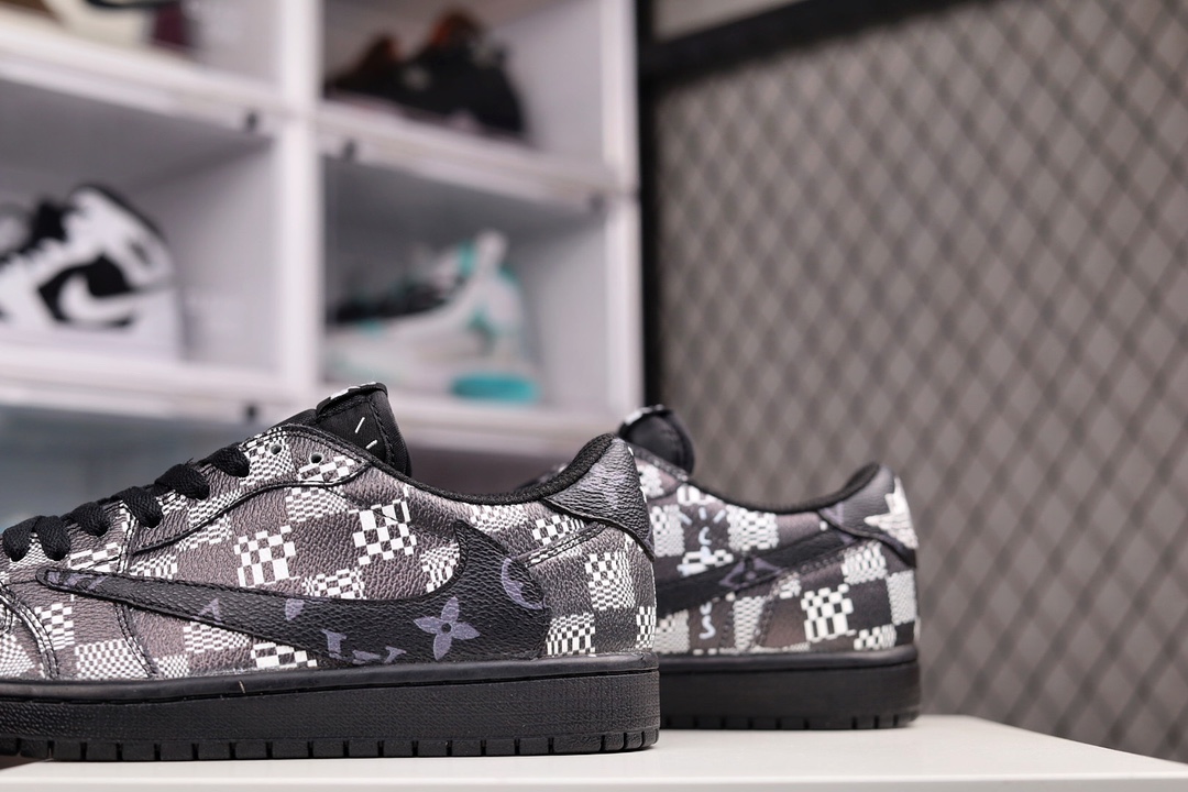 H0 公司级 Travis Scott x Fragment x Air Jordan 1 Low TS联名倒勾低帮板鞋 LV印花棋盘格错版灵感来源于洛杉矶球鞋店铺收到一双特别的错版 Air Jordan 1“Gold Toe” 的勾子倒过来 之后抄近 H0 00美元 研发出反向勾的设计