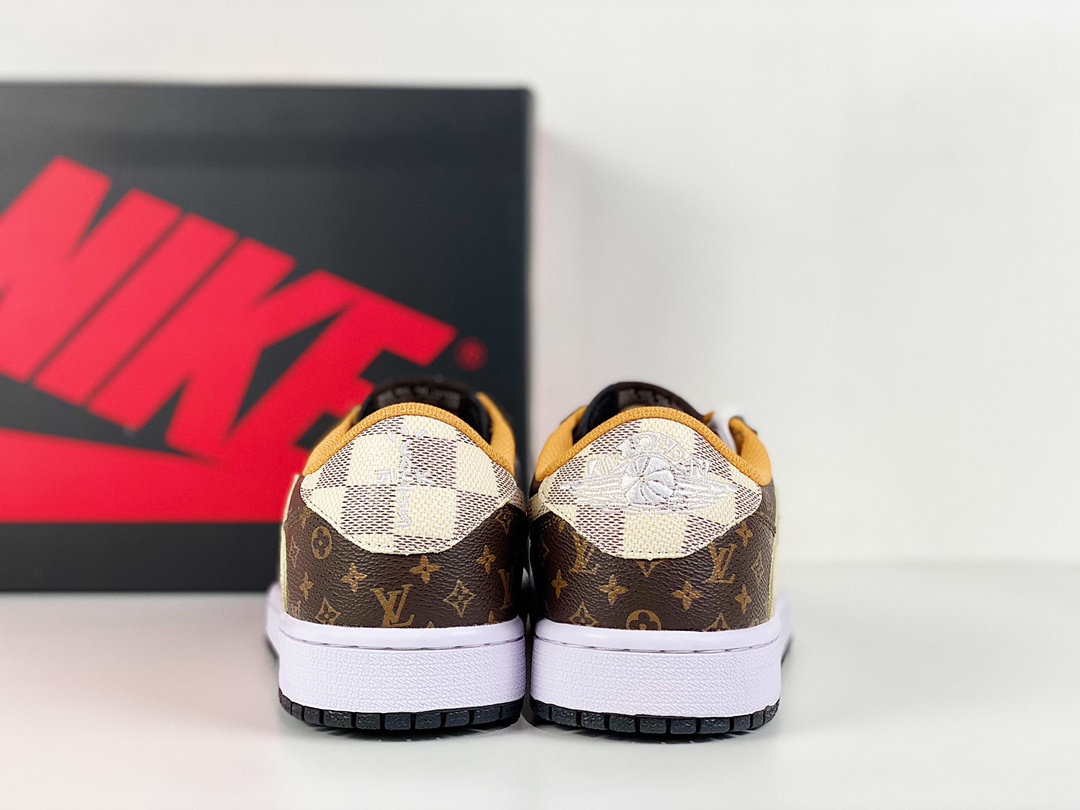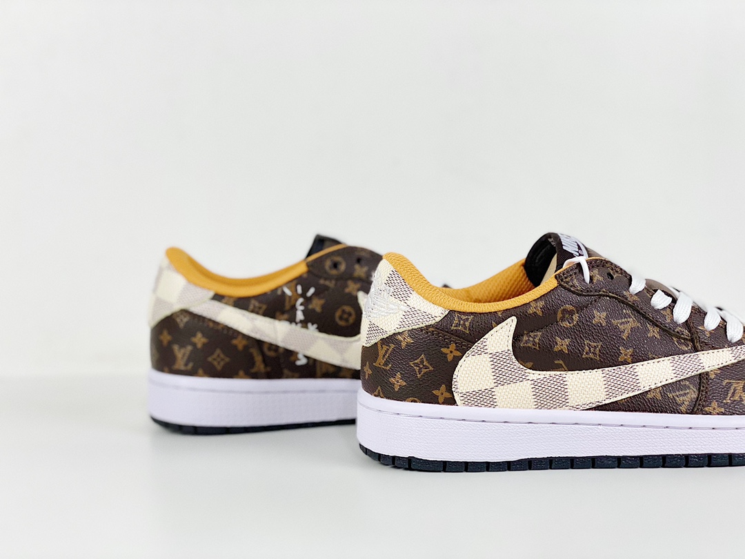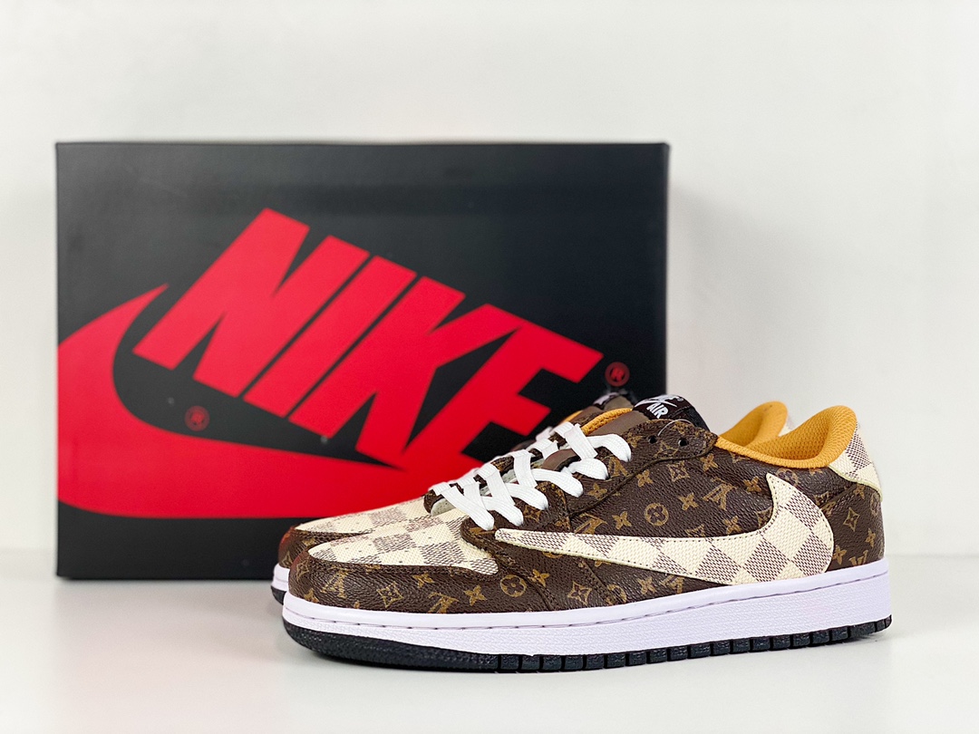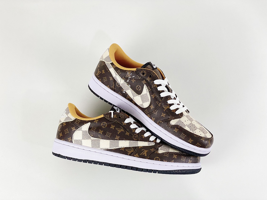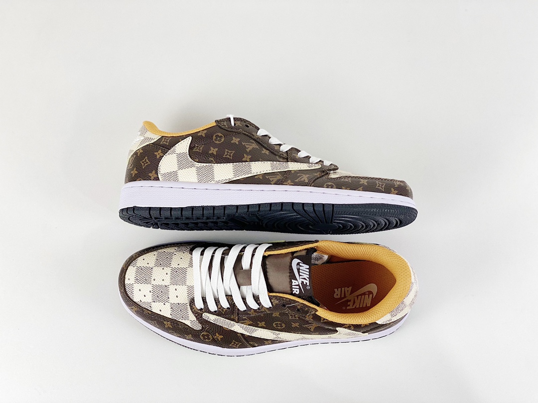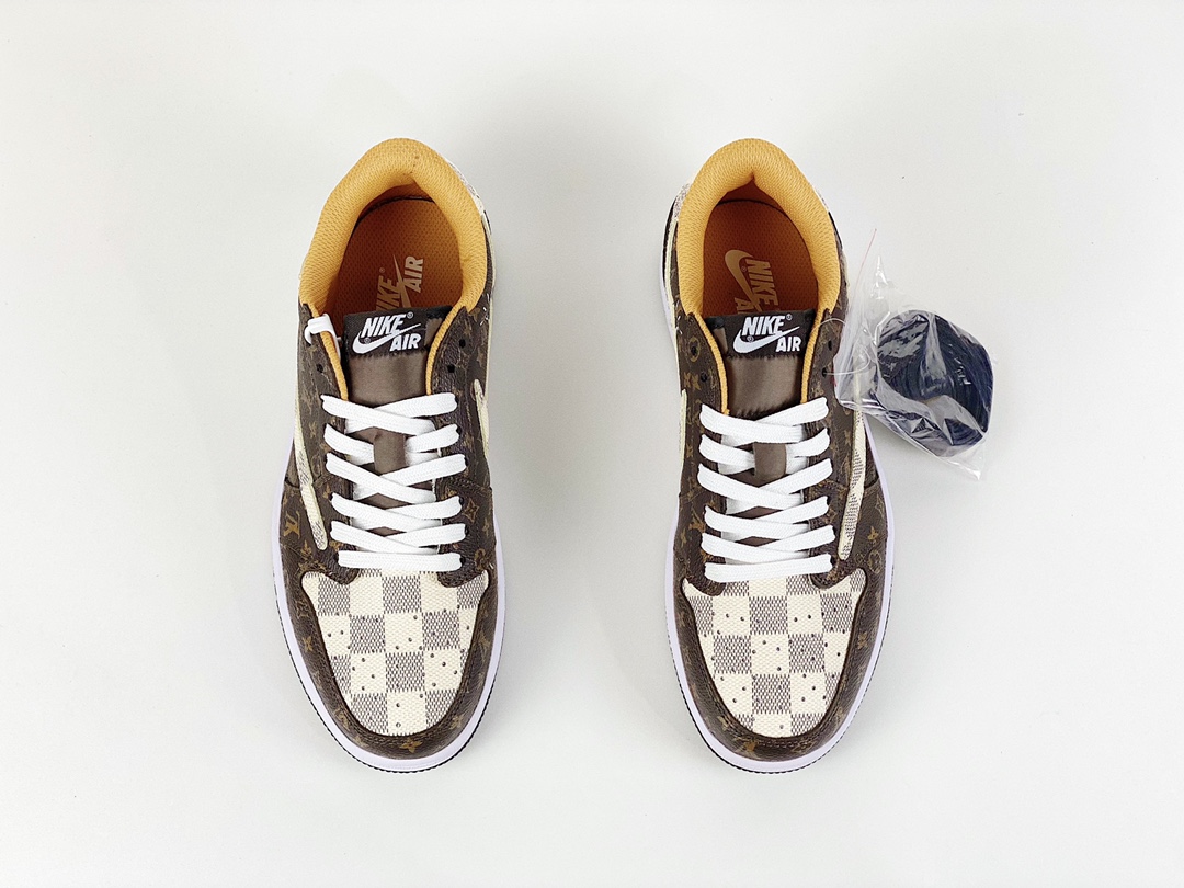H0 , 当红嘻哈歌手特拉维斯·斯科特联乘路易威登Louis Vuitton x Travis Scott x Nike Air Jordan 1 Low OG SP”Damier Azur/Brown/LV Monogram”AJ1乔丹一代经典低帮文化百搭休闲运动篮球鞋“TS联名深棕棋盘格子LV倒钩”采用软质牛剖皮革鞋面材质内置气垫及耐磨橡胶大底尺码:36 36.5 37.5 38 38.5 39 40 40.5 41 42 42.5 43 44 44.5 45