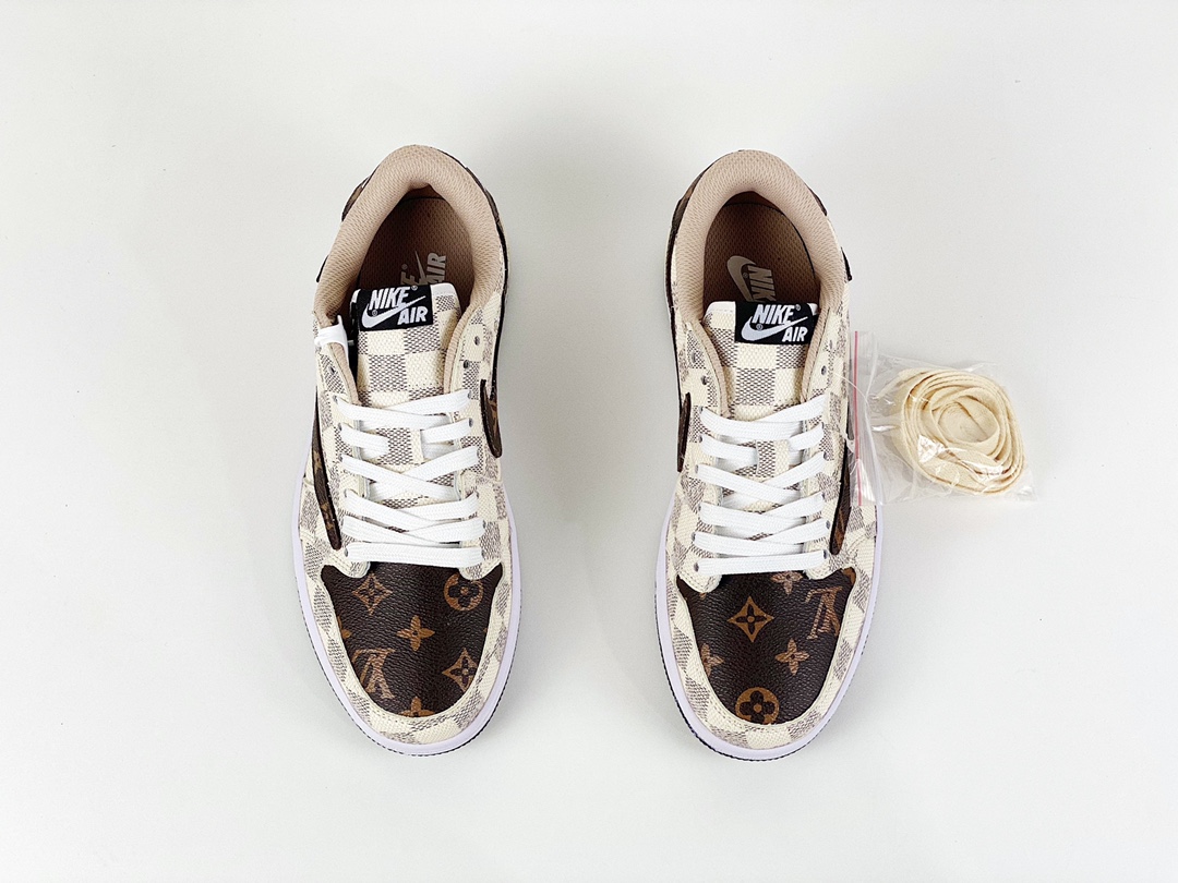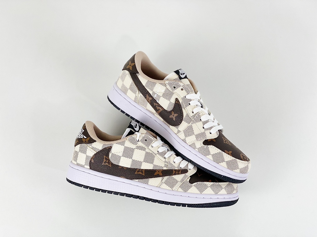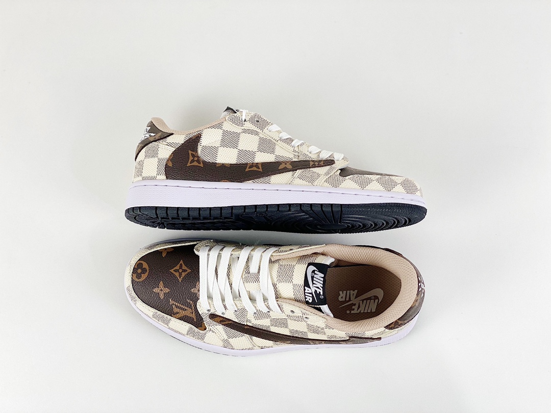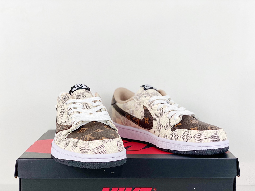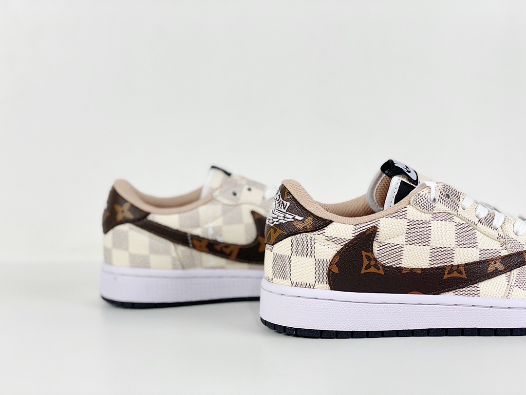 H0 , 当红嘻哈歌手特拉维斯·斯科特联乘路易威登Louis Vuitton x Travis Scott x Nike Air Jordan 1 Low OG SP”Damier Azur/Brown/LV Monogram”AJ1乔丹一代经典低帮文化百搭休闲运动篮球鞋“TS联名深棕米白棋盘格子LV倒钩”采用软质牛剖皮革鞋面材质内置气垫及耐磨橡胶大底尺码:36 36.5 37.5 38 38.5 39 40 40.5 41 42 42.5 43 44 44.5 45