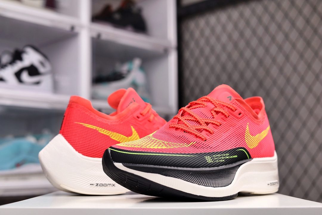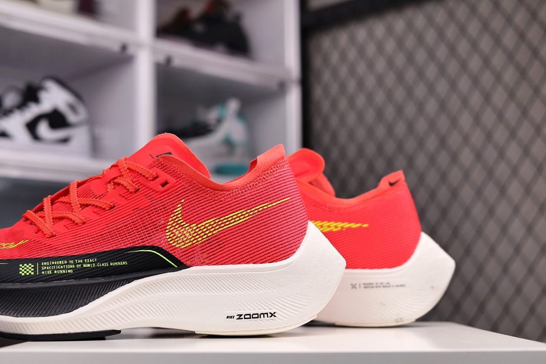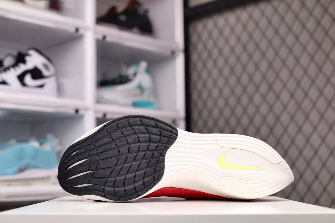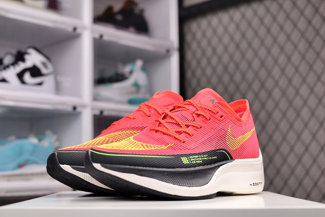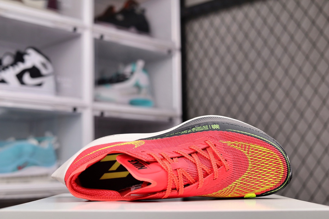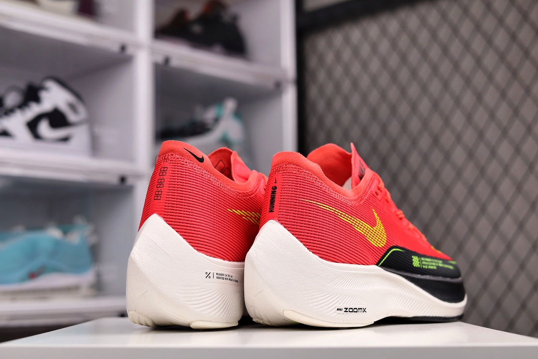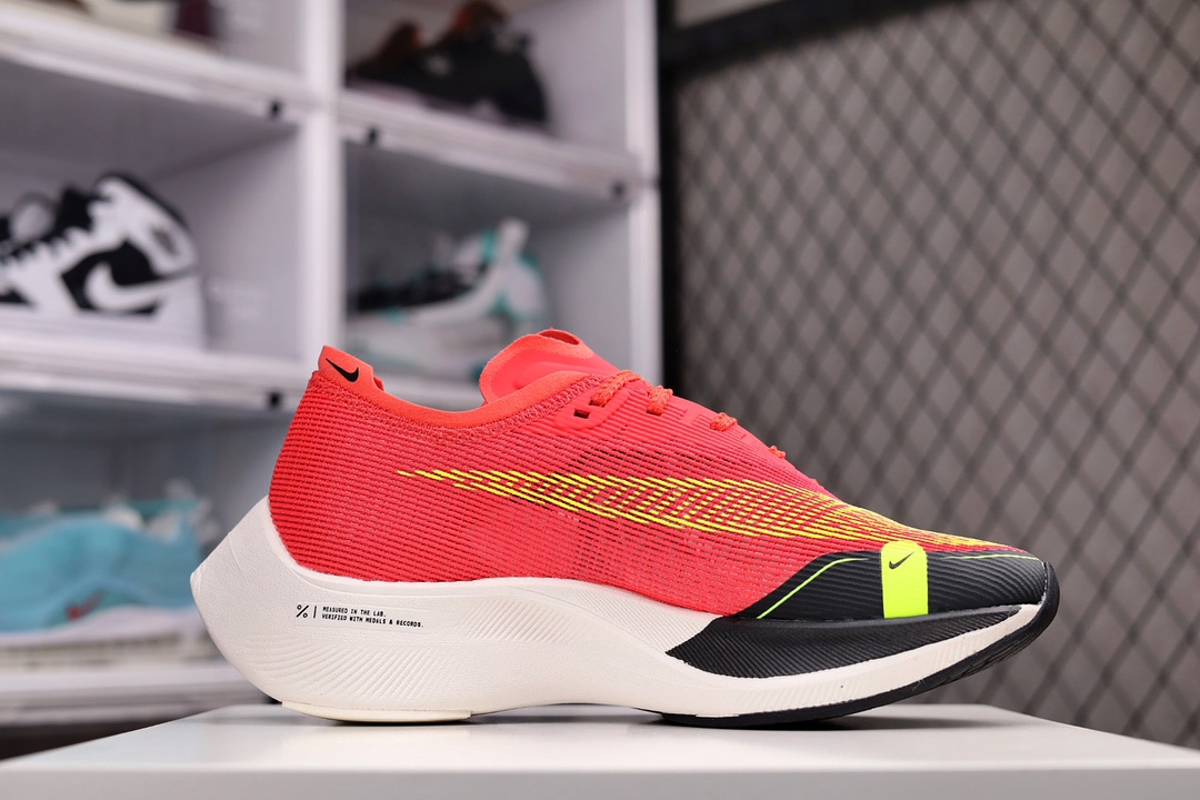 H0 NK ZoomX Vaporfly Next% 马拉松跑步鞋二代 鞋面使用了全新 Vaporweave 科技,这种类似蝉翼的材质相比 Flyknit 更加轻薄透气,非对称的鞋带系统和泡棉护垫的加入令舒适度更高,采用醒目的绿色作为主色调,鞋头辅以超大的 Swoosh 点缀,再配上流线型外观设计