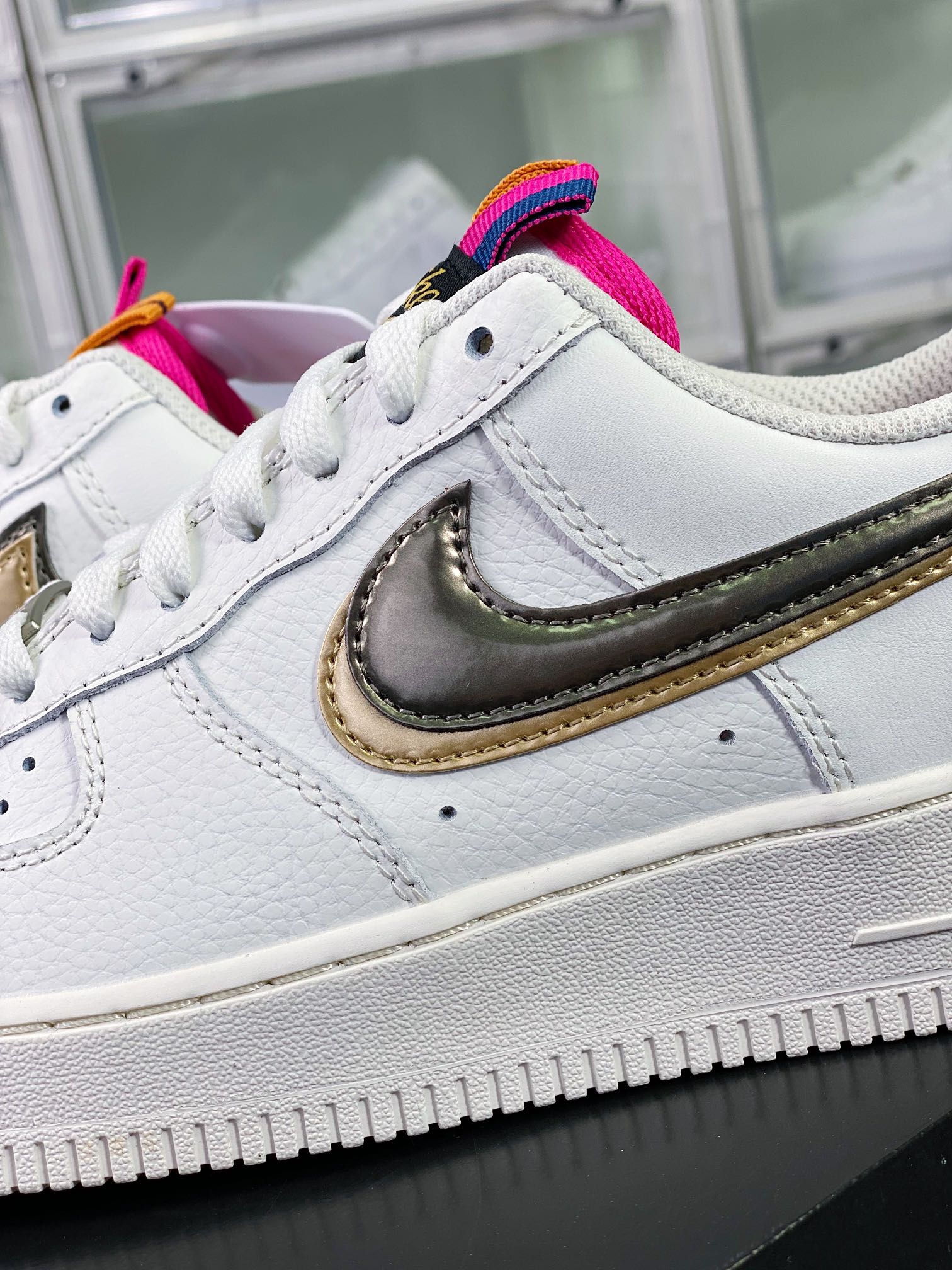 G0 女鞋真标带半码升级原楦数据开发版型采用硬质荔枝纹牛剖皮革鞋面材质内置全掌air sole气垫夏季穿搭神器,耐克Nike Wmns Air Force 1’07 Low GS”White/Gold Sliver”空军一号经典低帮百搭休闲运动板鞋“皮革白金银双钩子”CT3839-104