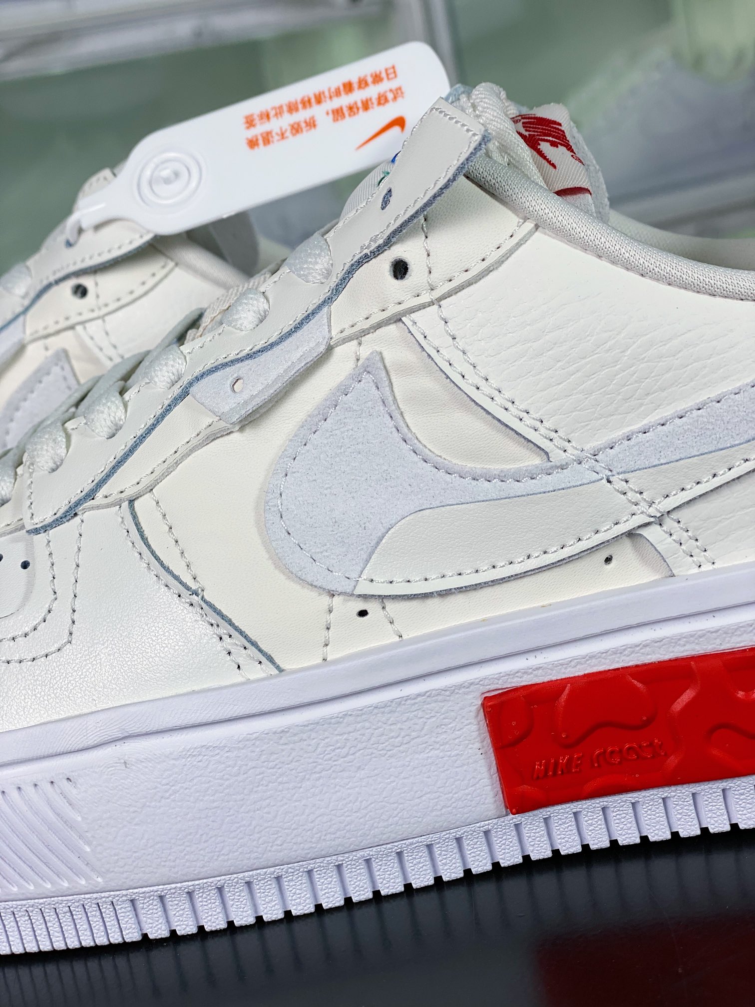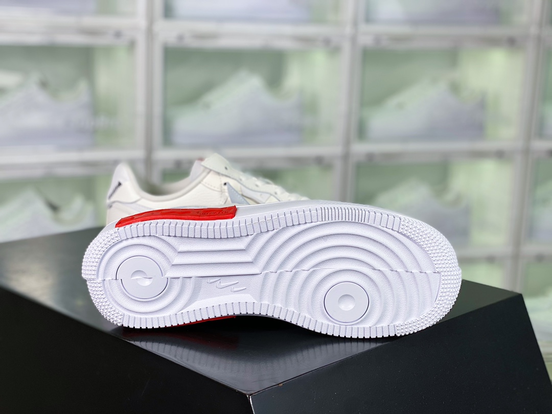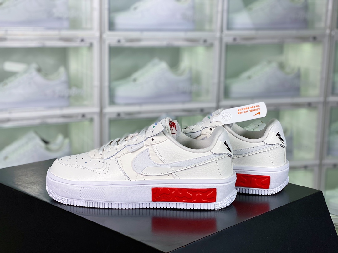 G0 男女鞋真标半码制原楦原纸版开发数据中采用React泡棉组合防滑RB橡胶外底炫酷拼接解构设计,全新耐克Nike Wmns Air Force 1 Fontanka”Sail White/Red”空军一号错位解构系列低帮轻量百搭休闲运动板鞋“皮革米白红”DH1 I5 -001