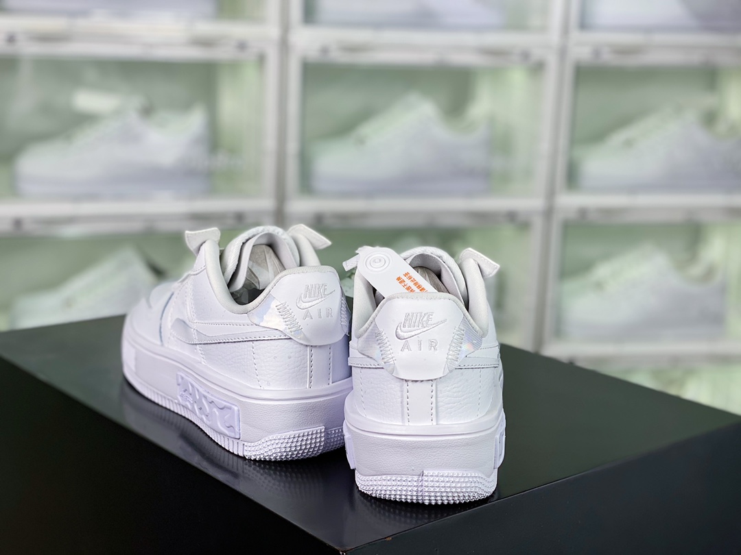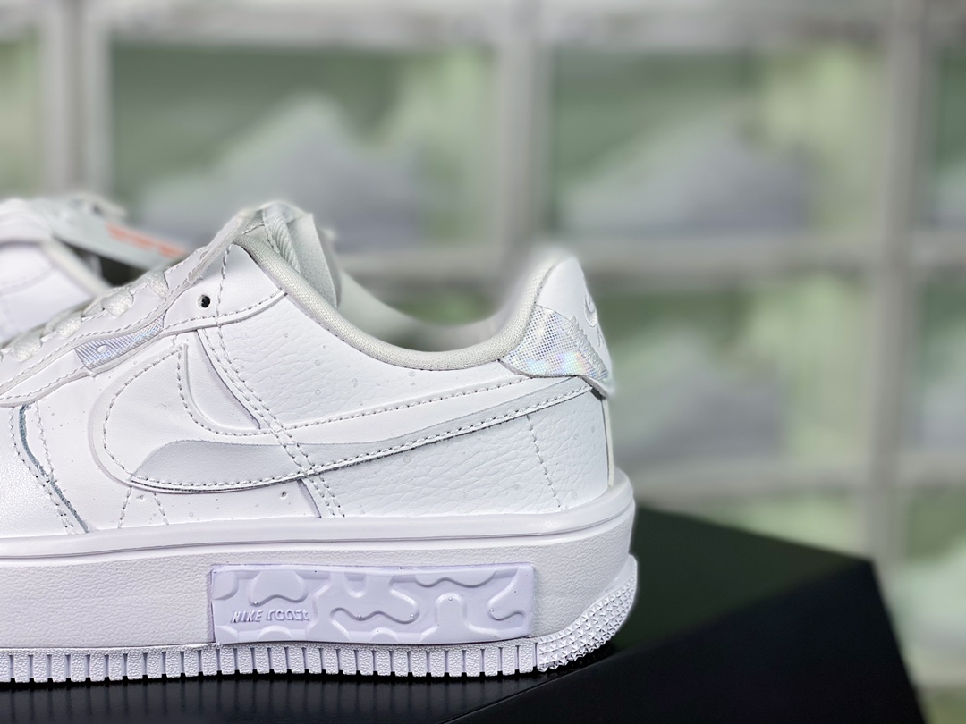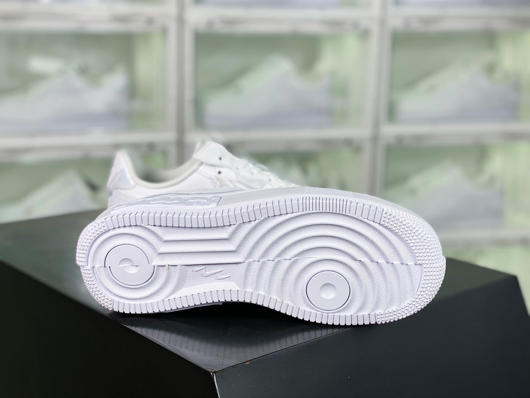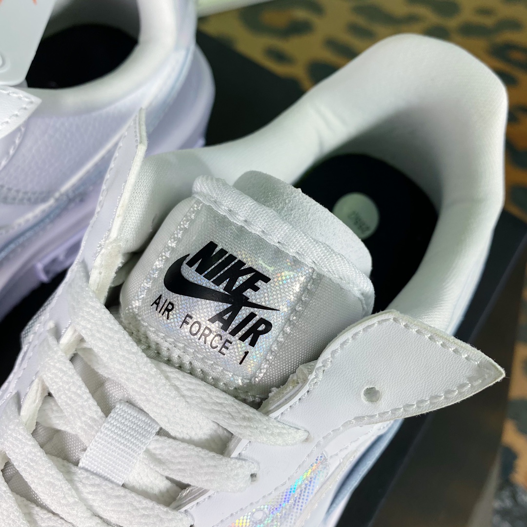 G0 男女鞋真标半码制原楦原纸版开发数据中采用React泡棉组合防滑RB橡胶外底炫酷拼接解构设计,全新耐克Nike Wmns Air Force 1 Fontanka”White Iridescent”空军一号错位解构系列低帮轻量百搭休闲运动板鞋“皮革白炫彩泼墨满天星反光”DQ5021- F5