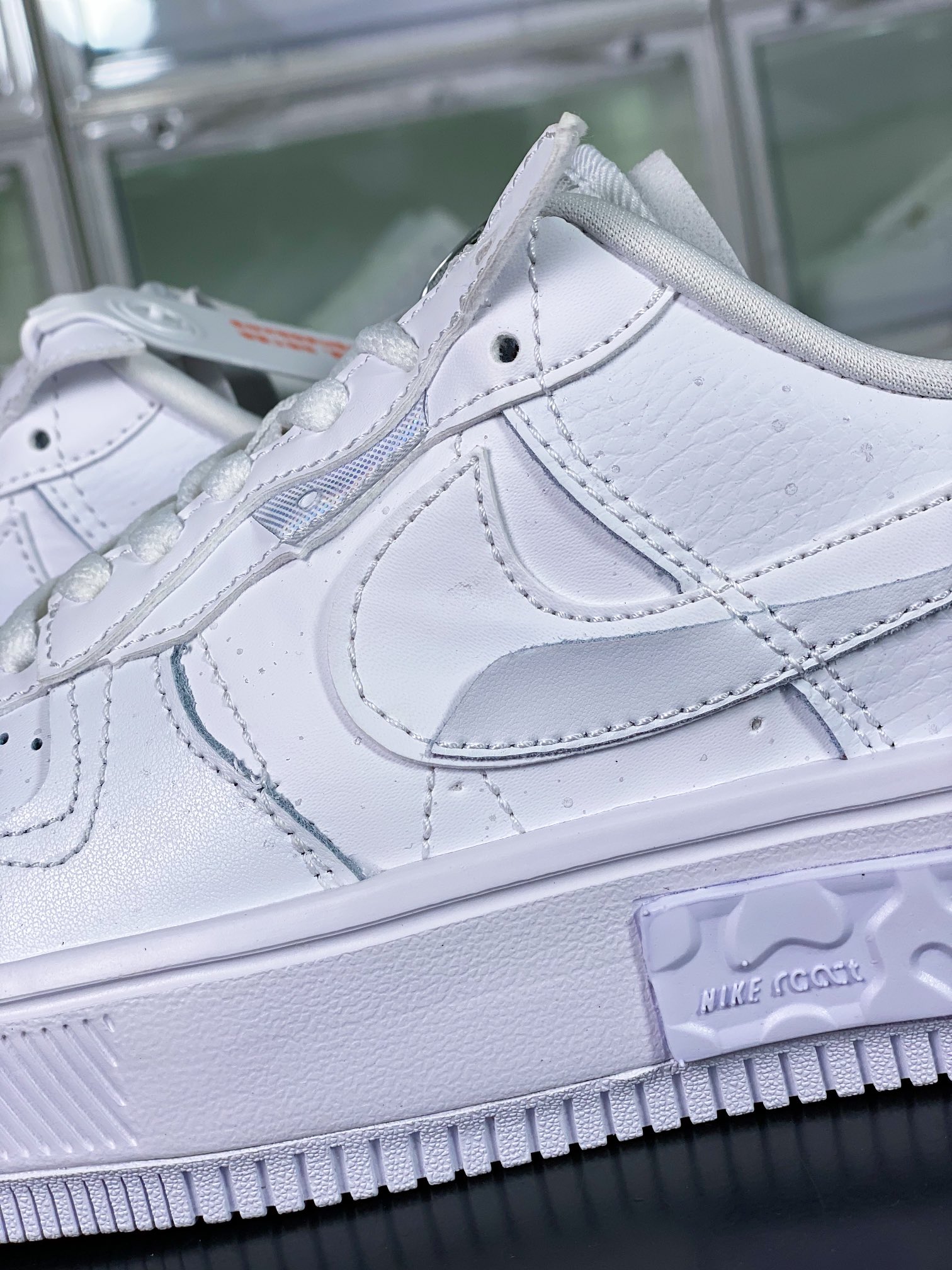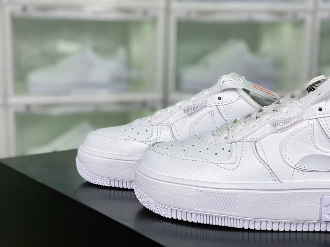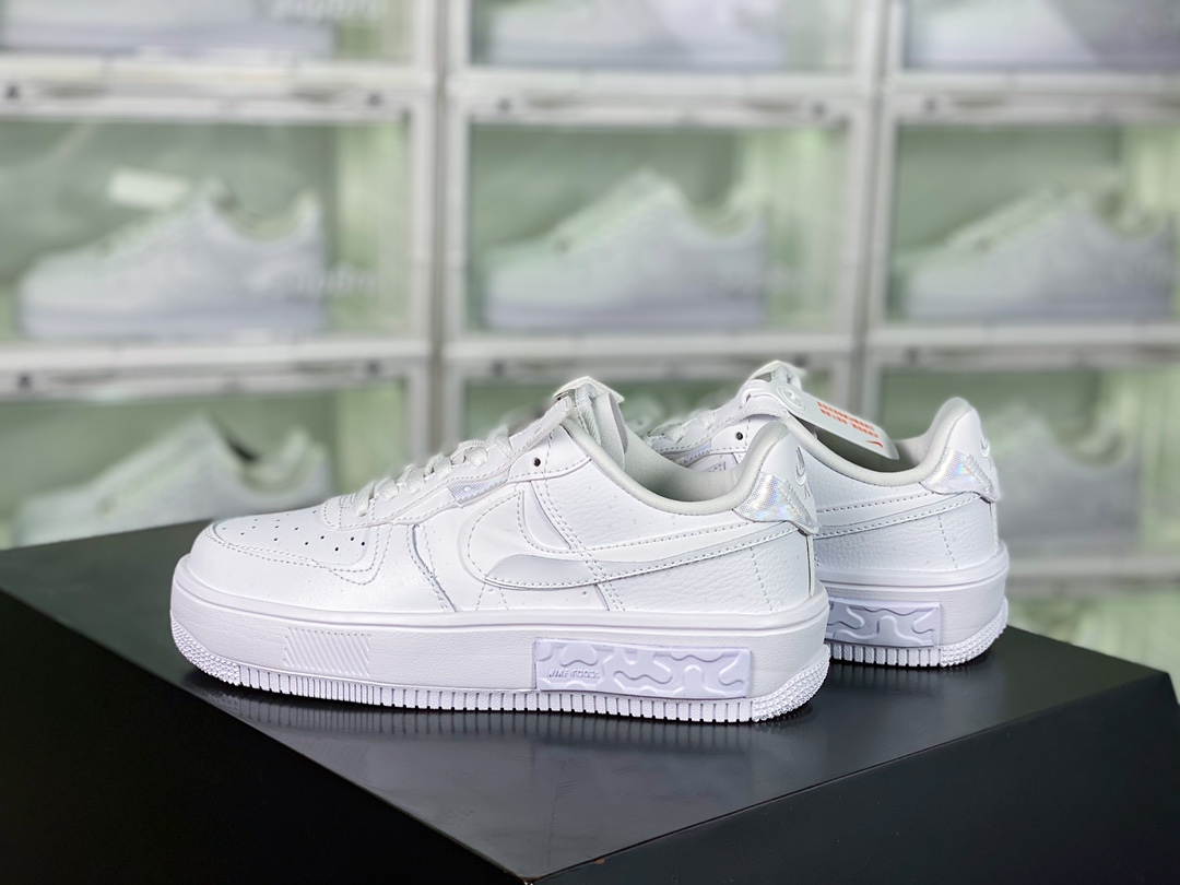 G0 男女鞋真标半码制原楦原纸版开发数据中采用React泡棉组合防滑RB橡胶外底炫酷拼接解构设计,全新耐克Nike Wmns Air Force 1 Fontanka”White Iridescent”空军一号错位解构系列低帮轻量百搭休闲运动板鞋“皮革白炫彩泼墨满天星反光”DQ5021- F5