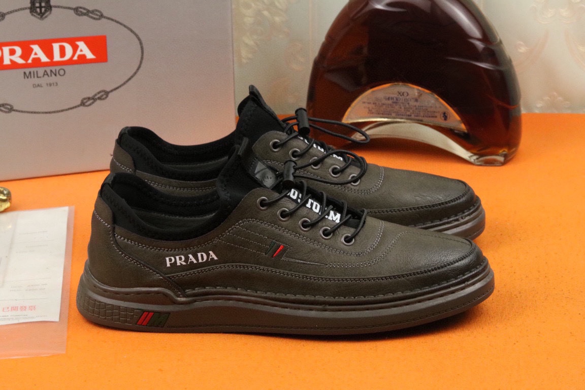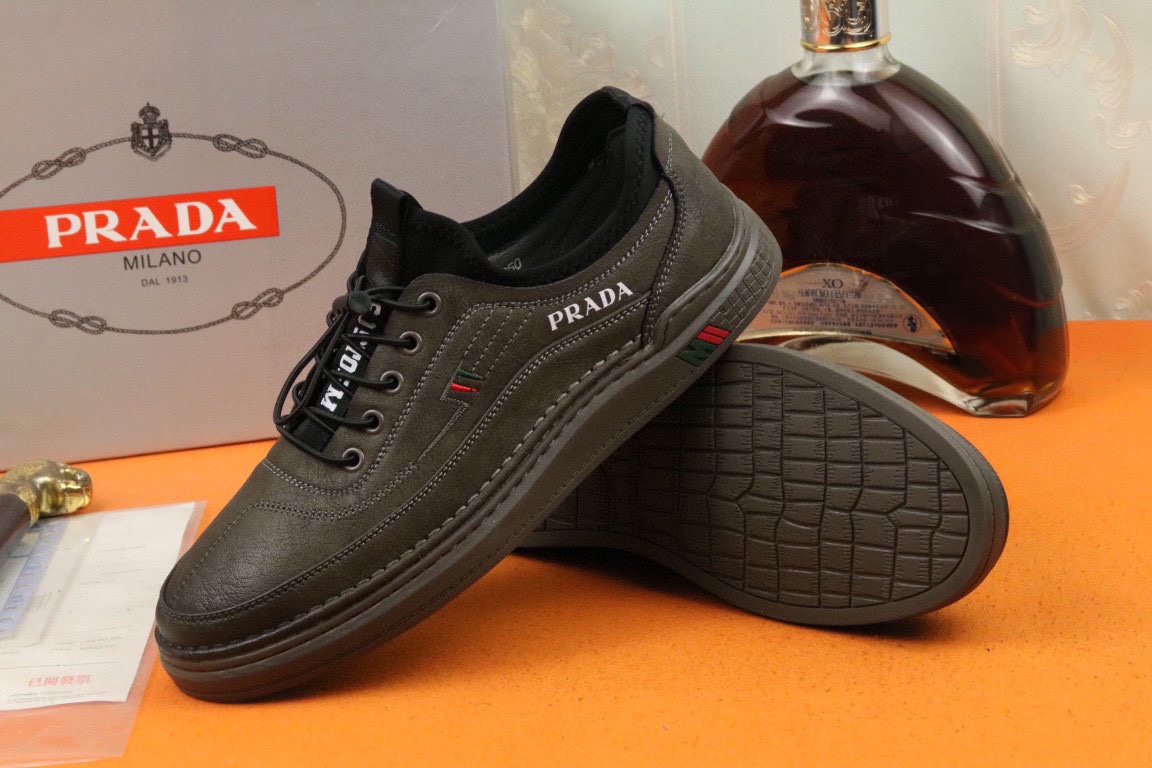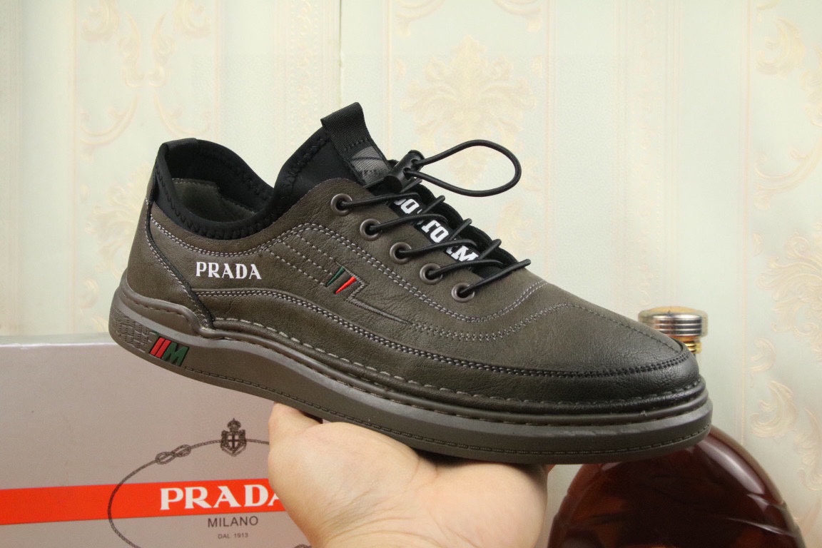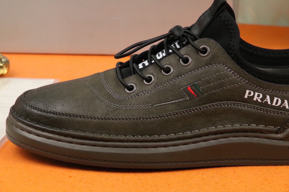 I5 高品质PRADA普拉达上市著名奢侈品牌,专柜同步更新,意大利男鞋时尚杂志季刊封面主推款鞋面采用意大利进口磨砂牛皮,猪皮内里。原版橡胶大底,上脚舒适有型。 细节无可挑剔。