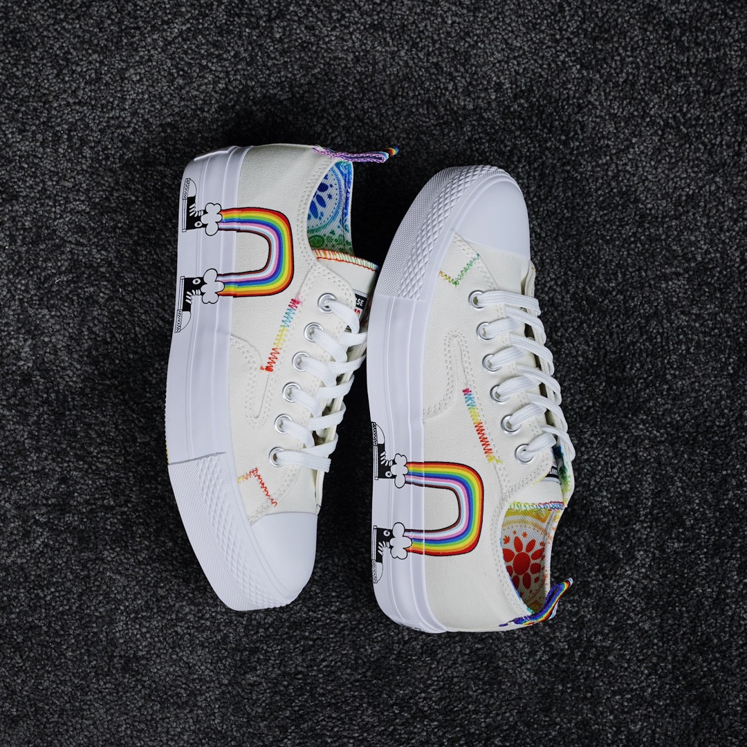 G0 匡威全新Pride系列彩虹厚底这双低帮厚底小白鞋细节太多啦 令人眼前一亮采用趣味彩虹图案、彩虹鞋舌标签和外底彩虹点缀,彰显自豪感。有点小解构 还有腰果花内里 鞋跟彩虹织带方便穿脱 特别是彩虹logo和彩虹大底让我们把彩虹穿脚上吧哈哈哈货号:A02264C尺码:35 36 36.5 37 37.5 38 39 39.5 40 41 42