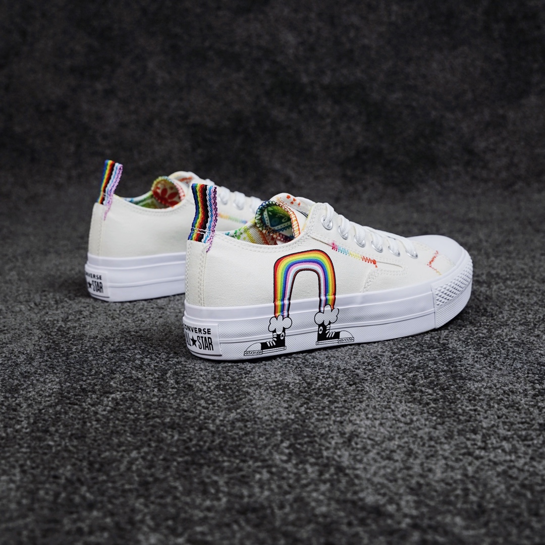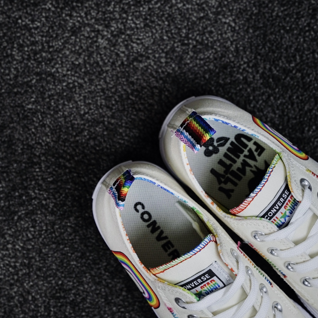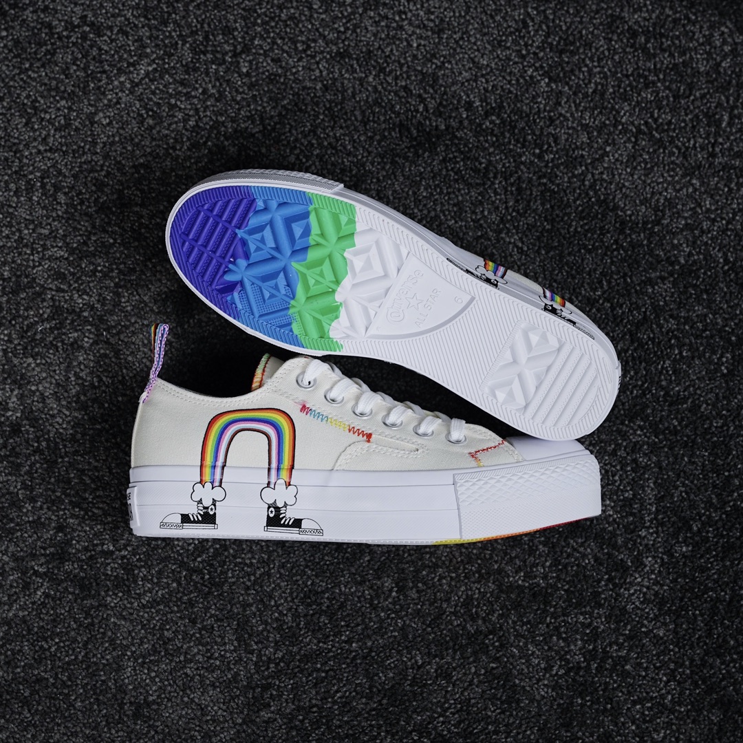 G0 匡威全新Pride系列彩虹厚底这双低帮厚底小白鞋细节太多啦 令人眼前一亮采用趣味彩虹图案、彩虹鞋舌标签和外底彩虹点缀,彰显自豪感。有点小解构 还有腰果花内里 鞋跟彩虹织带方便穿脱 特别是彩虹logo和彩虹大底让我们把彩虹穿脚上吧哈哈哈