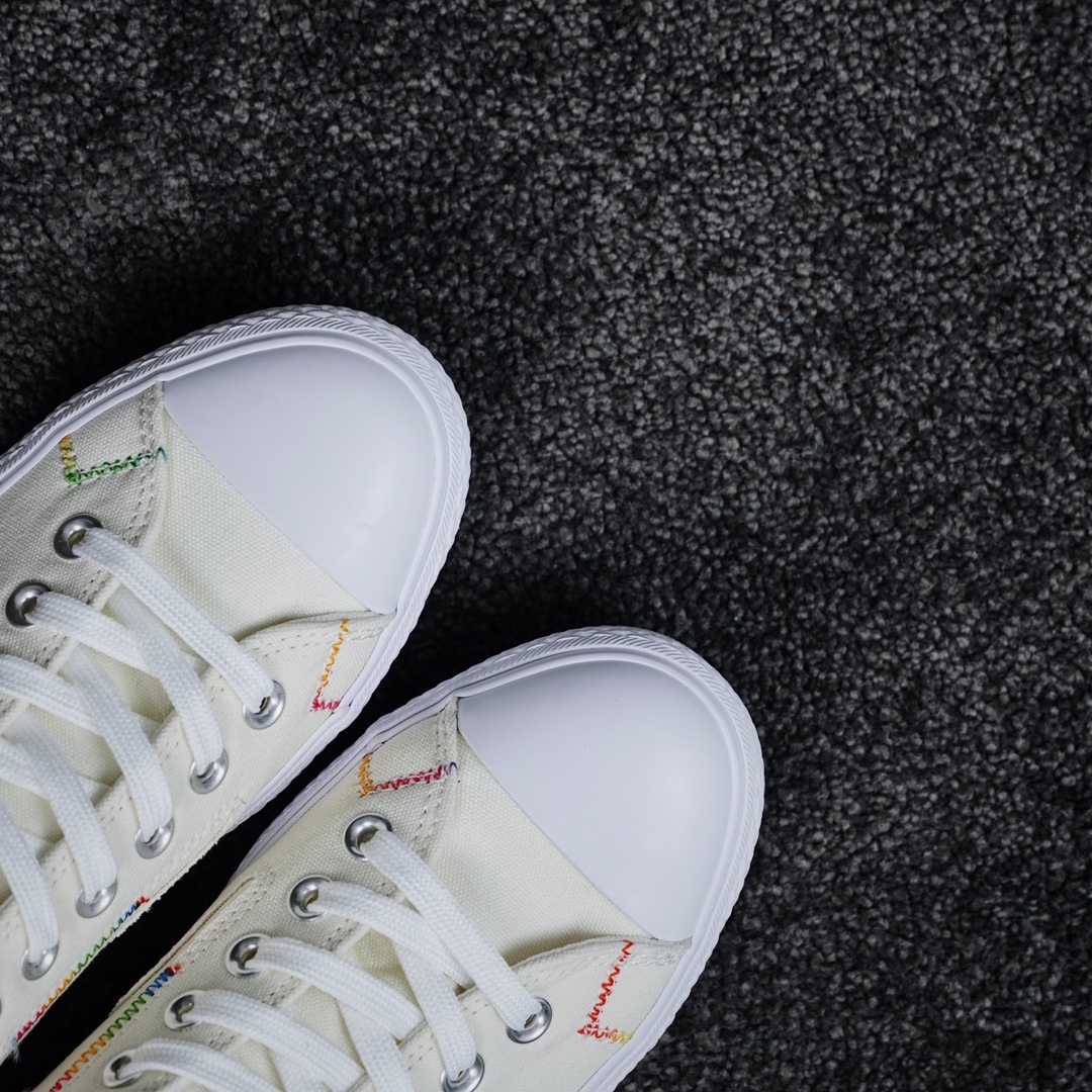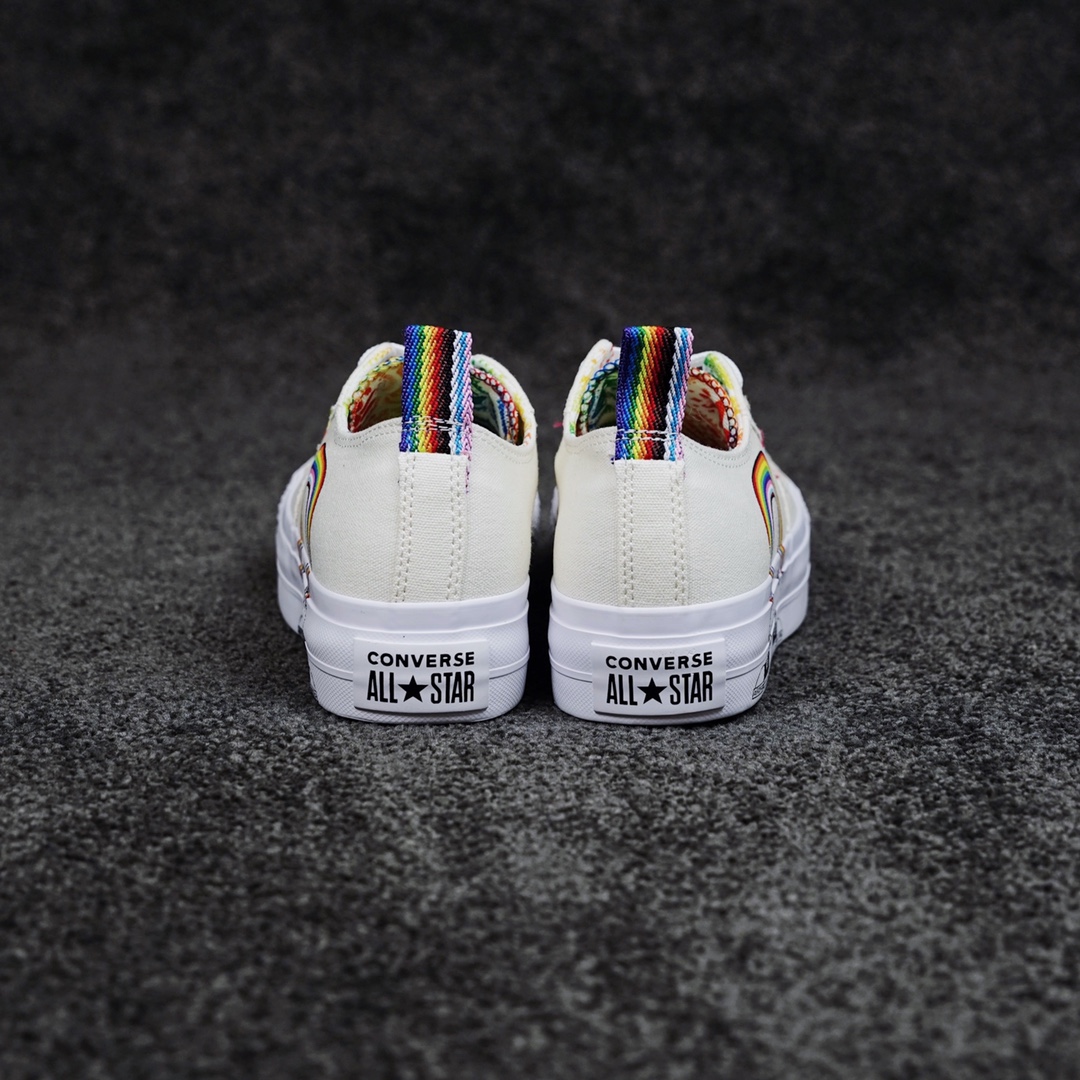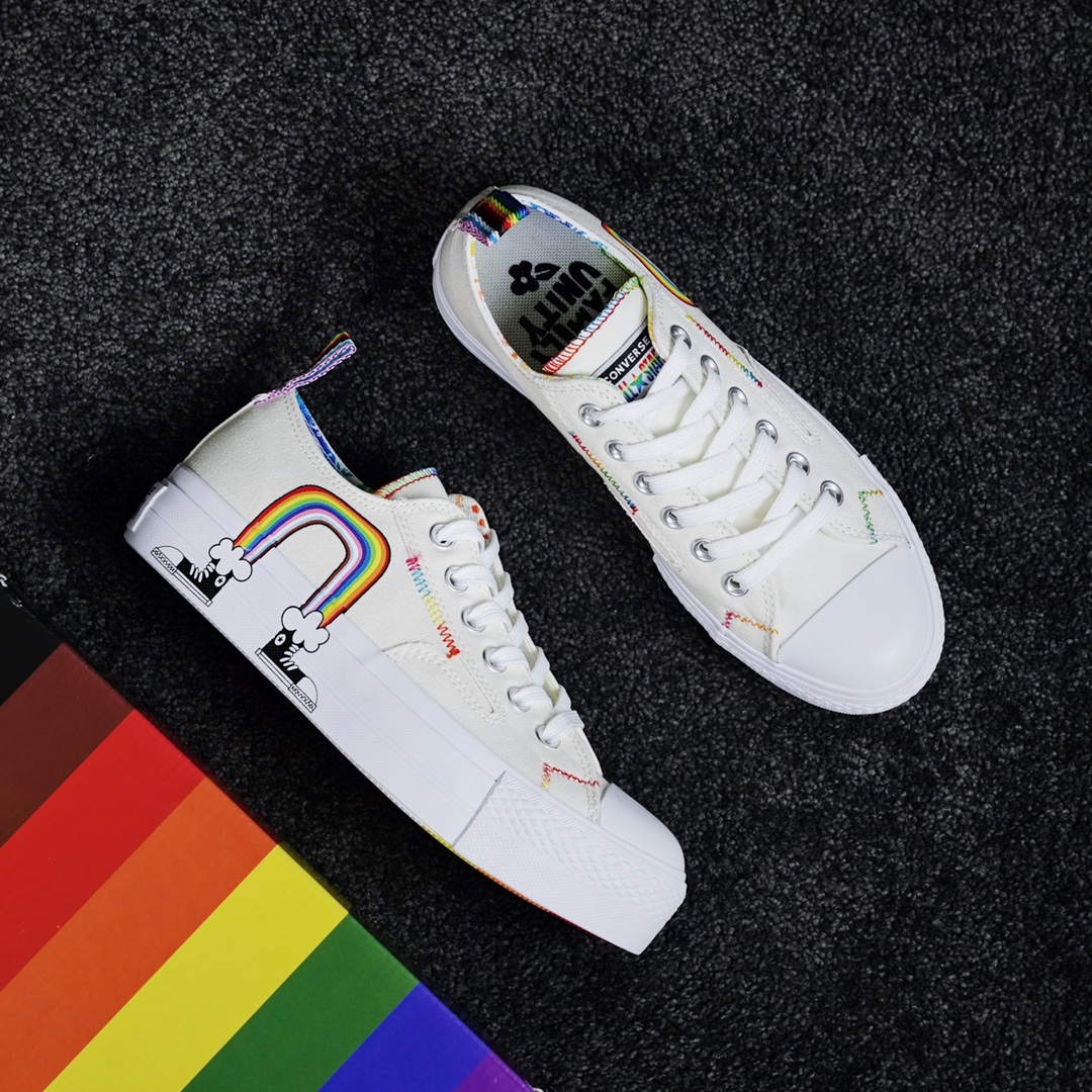 G0 匡威全新Pride系列彩虹厚底这双低帮厚底小白鞋细节太多啦 令人眼前一亮采用趣味彩虹图案、彩虹鞋舌标签和外底彩虹点缀,彰显自豪感。有点小解构 还有腰果花内里 鞋跟彩虹织带方便穿脱 特别是彩虹logo和彩虹大底让我们把彩虹穿脚上吧哈哈哈