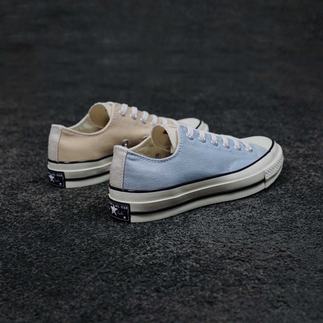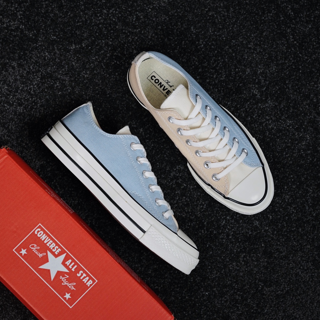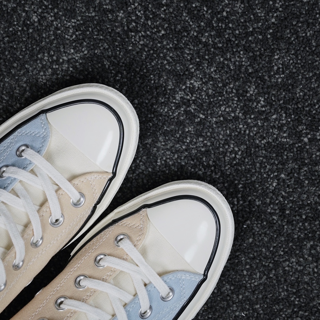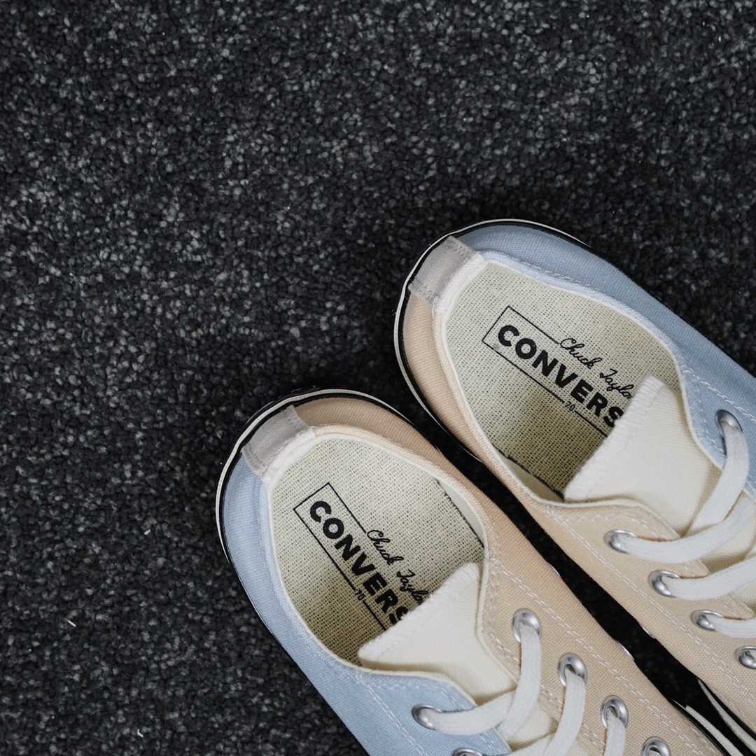 G0 匡威拼色冰淇淋 清凉夏日Converse Chuck 70s 奶茶蓝拼色经典的70S低帮鞋型蓝本 后跟星标贴片鞋身内外侧采用拼色设计,外侧鞋身蓝色,內侧鞋身奶茶色,鞋舌纯白色,左侧鞋舌内里印有可持续利用环保星形标识内外侧都是浅色调设计,对这种清新的配色真是毫无抵抗力