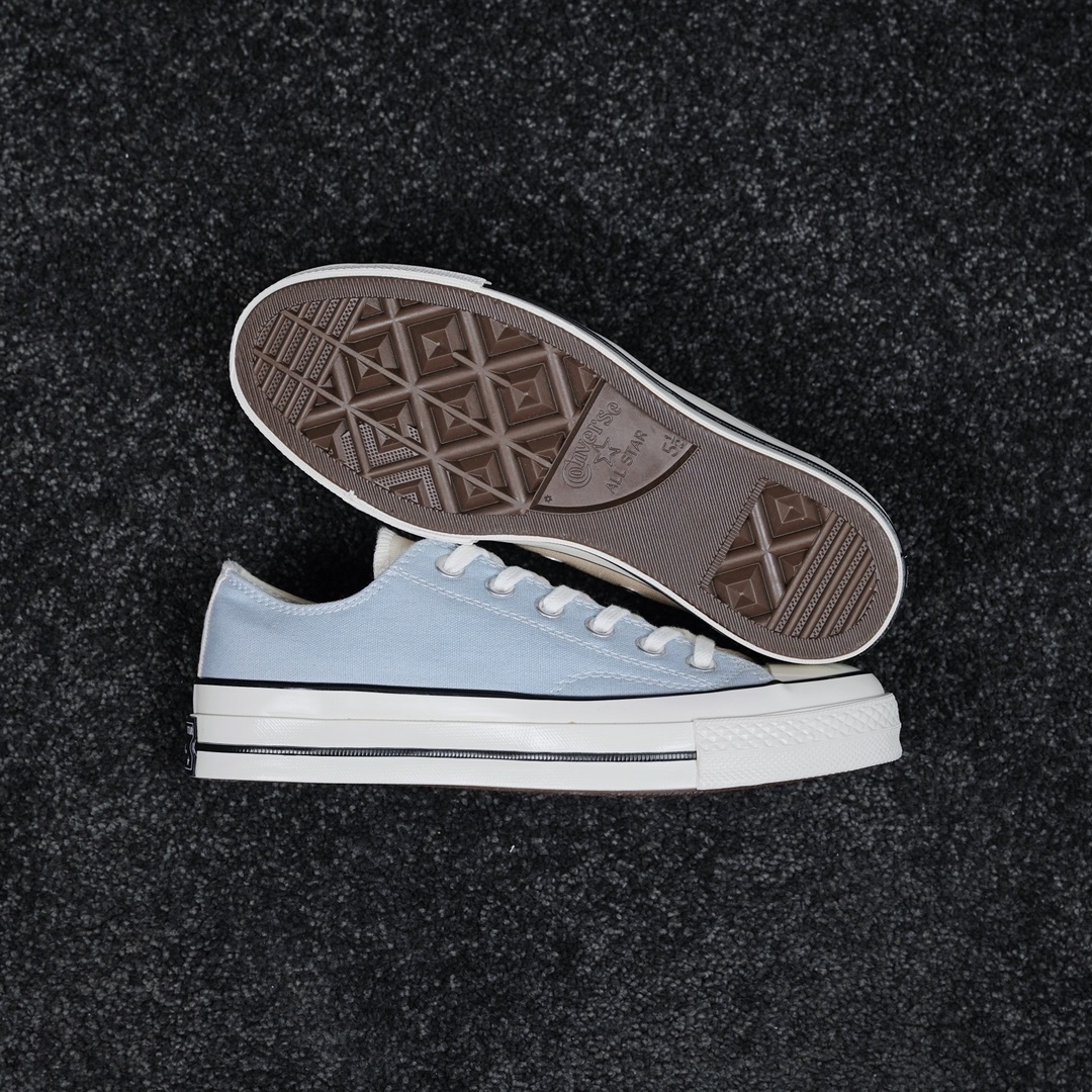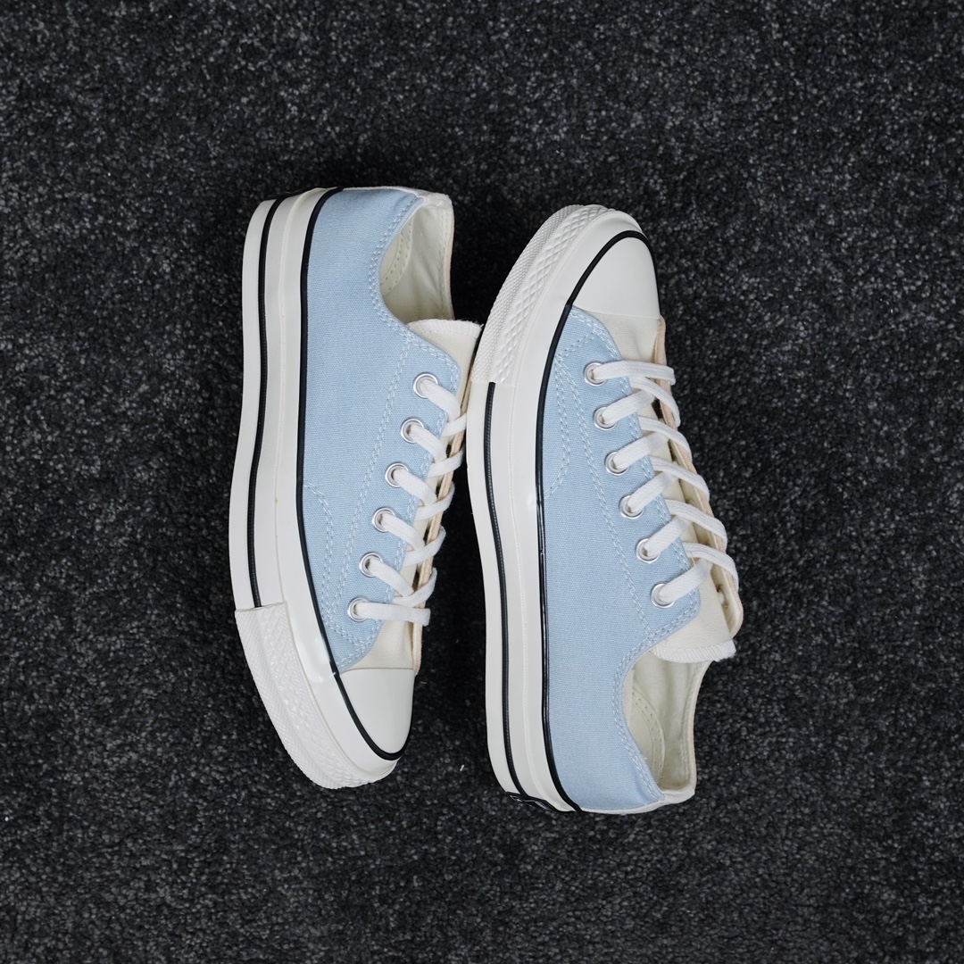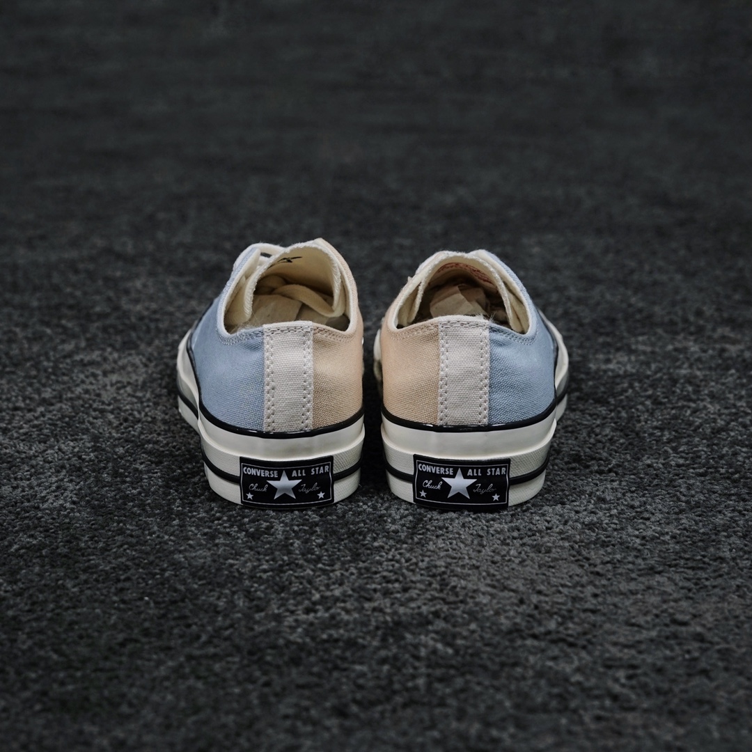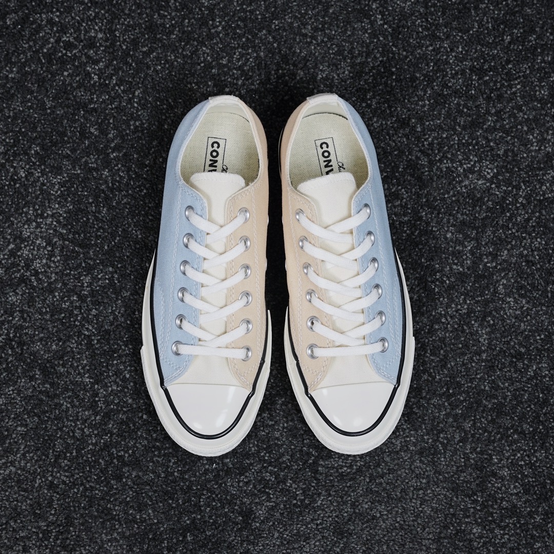 G0 匡威拼色冰淇淋 清凉夏日Converse Chuck 70s 奶茶蓝拼色经典的70S低帮鞋型蓝本 后跟星标贴片鞋身内外侧采用拼色设计,外侧鞋身蓝色,內侧鞋身奶茶色,鞋舌纯白色,左侧鞋舌内里印有可持续利用环保星形标识内外侧都是浅色调设计,对这种清新的配色真是毫无抵抗力