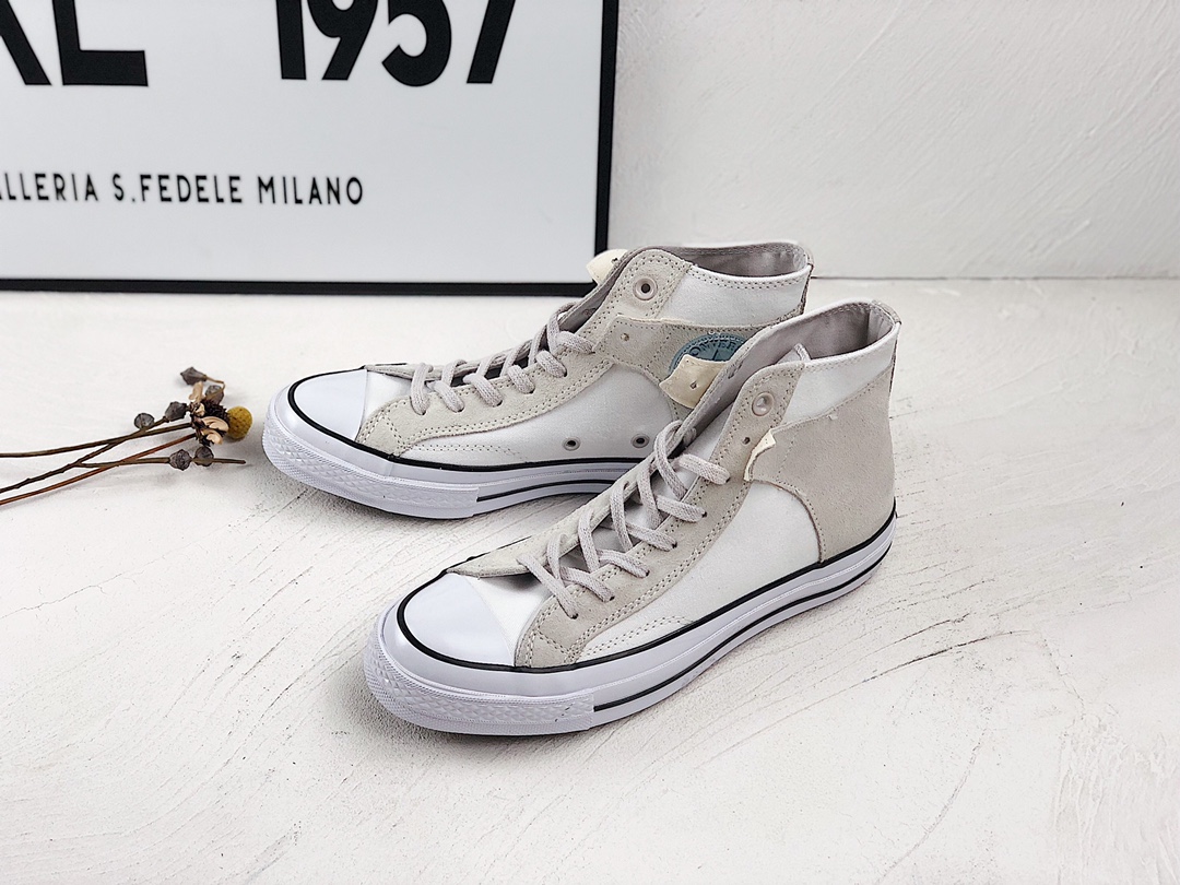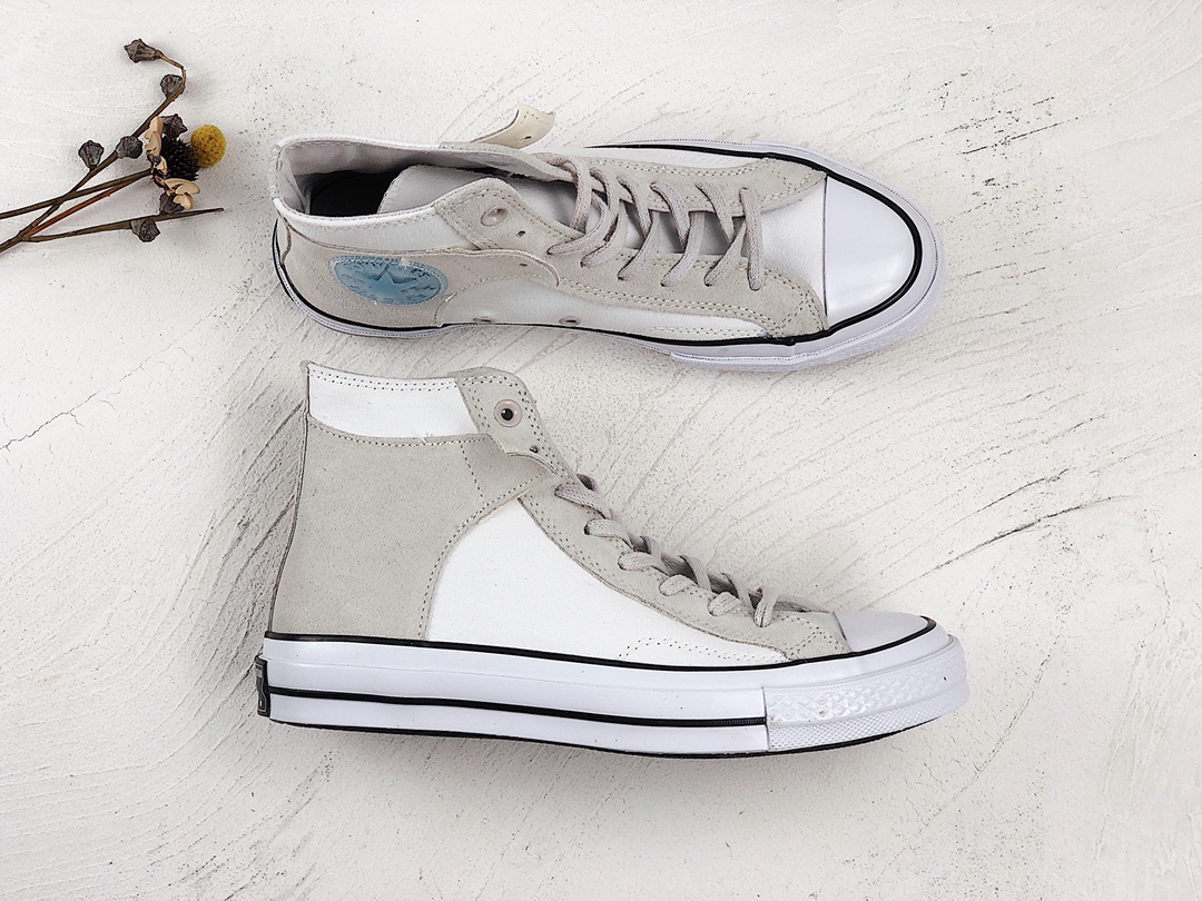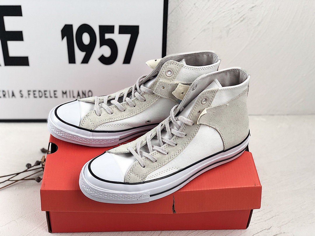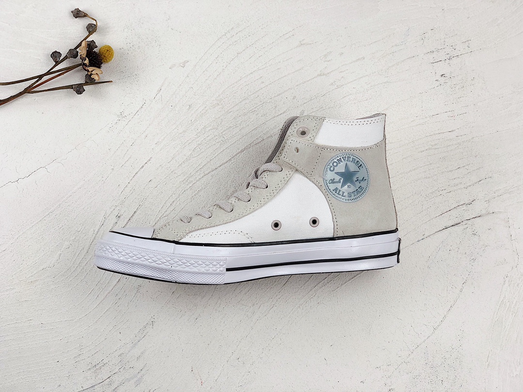 G0 匡威CONVERSE Chuck 70 米白鹿皮拼接高帮 米白灰 匡威全新系列鹿皮拼接 整体以米白灰为主色调给你一种耐看的感觉,特殊的后跟鞋身鹿皮包边 透明外标设计 搭配工装裤 细节到位 简约低调百搭官方