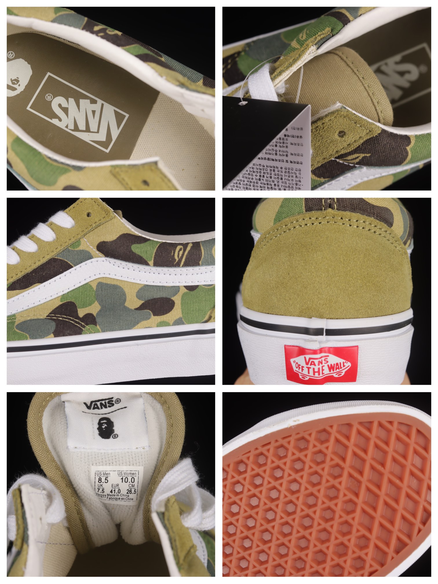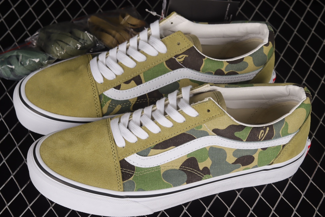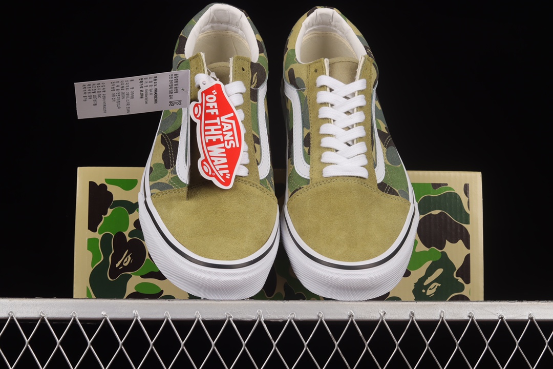 G0 原装鞋盒另送三幅鞋带Bape x Vans Old Skool 猿人头联名款迷彩低帮帆布板鞋 VN0A54F37BE此次联名选用麂皮材质和帆布材质最让人惊喜的是OldSkool经典鞋型配送了三副鞋带美式复古春夏穿搭夏日想穿出街头感却没有头绪?!属于迷彩的季节我终于等到了!