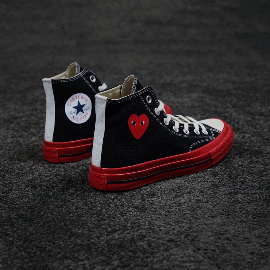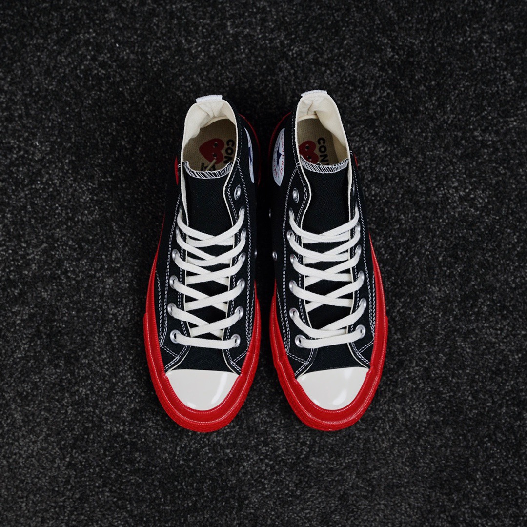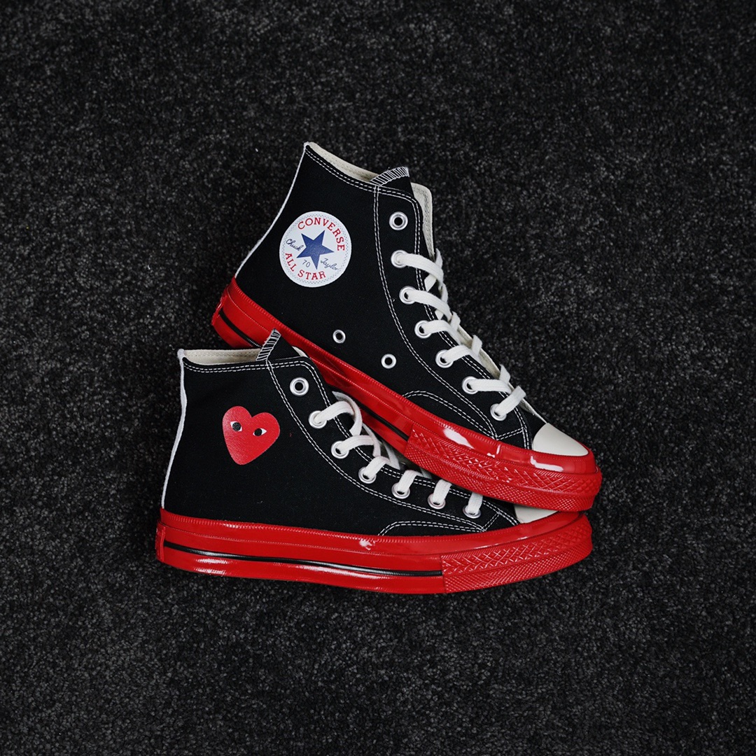 G0 CDG x Converse Chuck Taylor 1970s全新大红底 川久保玲 联名12周年此次CDG与匡威联名再出新意 大胆的鲜明红色大底让人眼前一亮 呼应鞋面标志性的红心标志 另外大底围条处随着配色不同亦会有相应的条纹 整体配色好看又亮眼 适合春夏季节穿搭