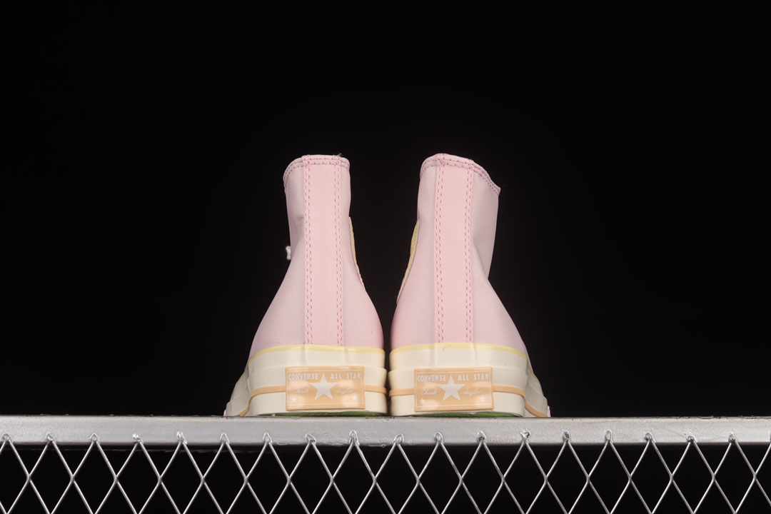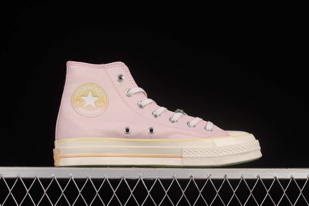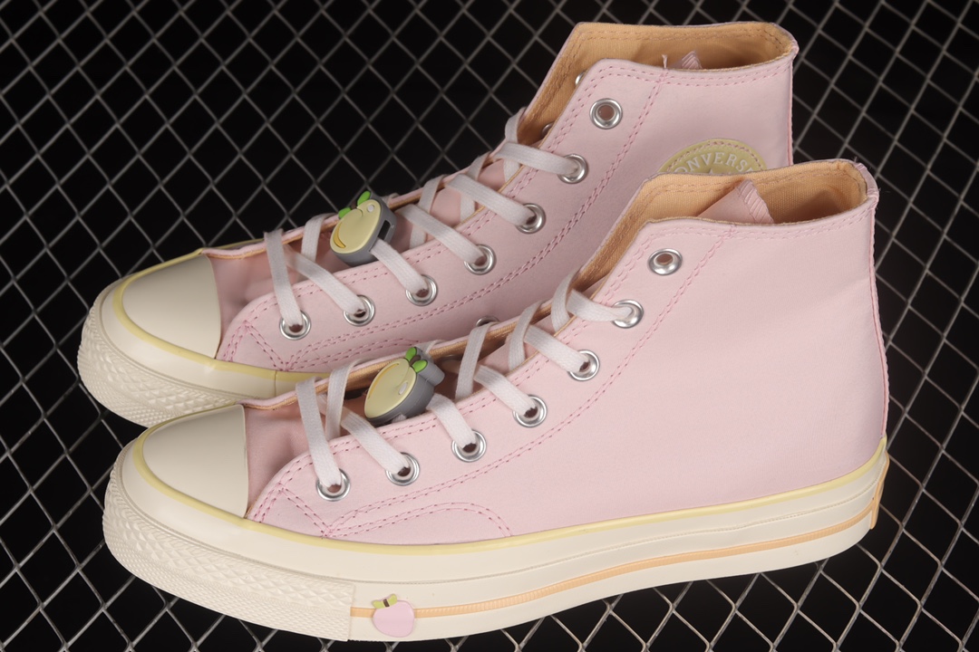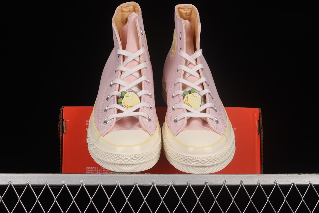 G0 Converse Chuck 70 Hi 全新水果拼盘 水蜜桃粉 皮革高帮休闲板鞋 A02295C鞋款以粉色帆布鞋面、绿色鞋底、杏色内衬及中底线条、水果元素装饰呈现极具春夏风格的鞋身设计。全新的女生专属规格也令这款经典球鞋增添几分活泼的运动感觉
