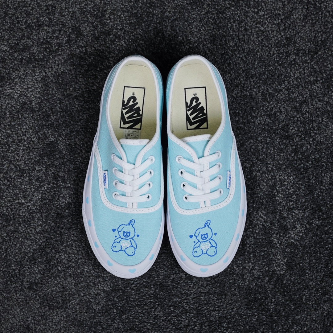 G0 Vans Authentic 淡蓝小熊爱心万斯海外官网新版 浅蓝面布搭配白色围条 满满少女心 独特的围条印上蓝色爱心搭配独特小熊涂鸦 让你感受不一样的感觉尺码:35 36 36.5 37 38 38.5 39工艺:硫化1:1(重量1:1、真标、原钢印、材质标、鞋型标)