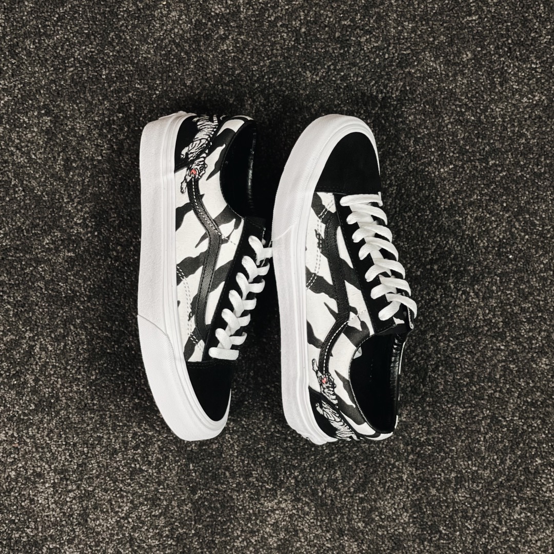 G0 Vans Style 36 黑白老虎刺绣VANS将2022壬寅年虎年元素与经典棋盘格元加以变幻并运用至经典鞋型,推出虎年限定系列。Style 36该系列彩用具有新年代表性,后跟和鞋身电锈老虎图案,鞋身印有人气豹纹印花以及棋盘格爱心印花三组合鞋款凸显设计主题以交叉重叠呈现出炸眼的视觉效果。尺码:35-44(36.5 38.5 40.5 42.5)工艺:硫化1:1(重量1:1、真标、原钢印、材质标、鞋型标、合格证)