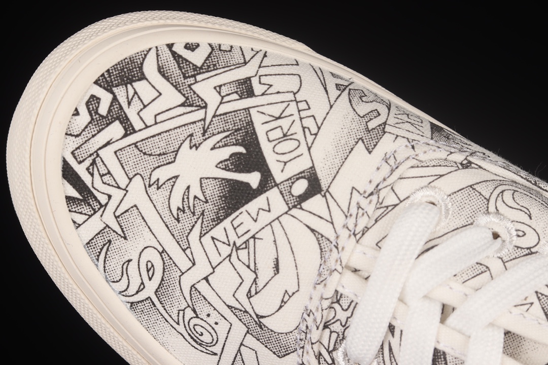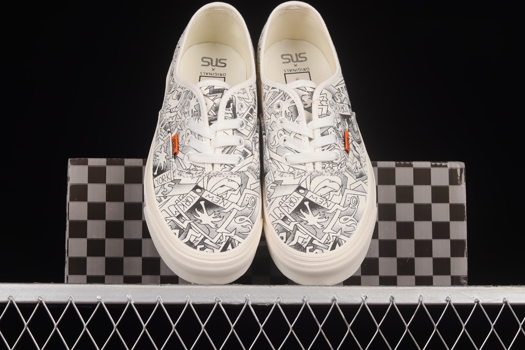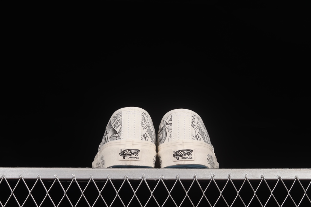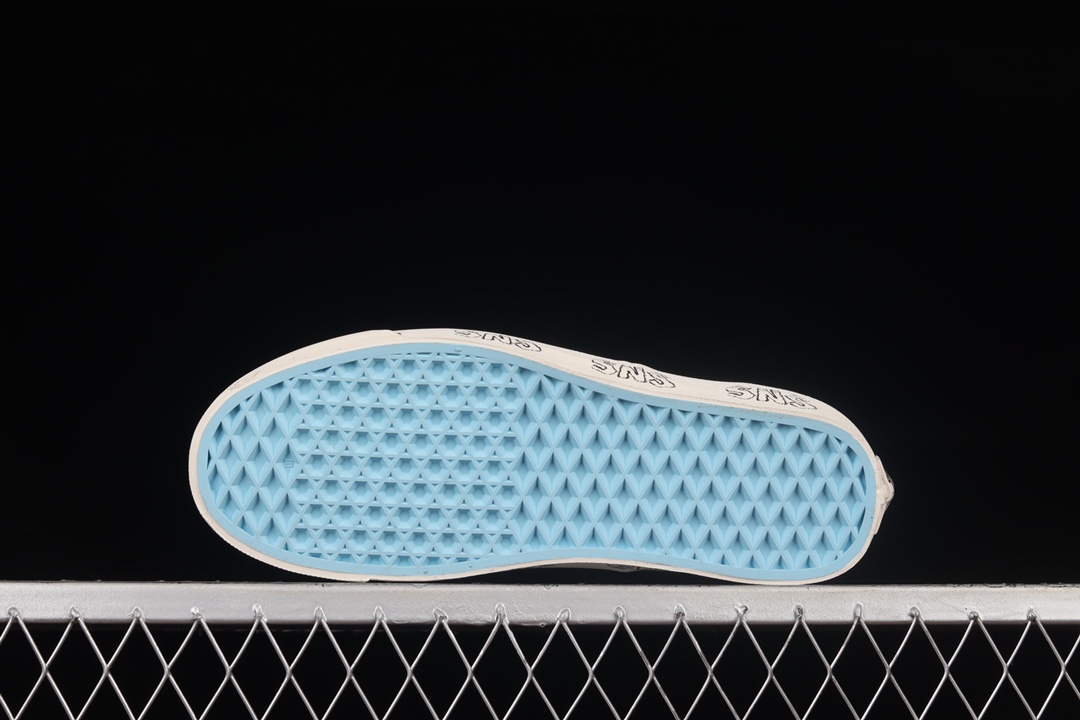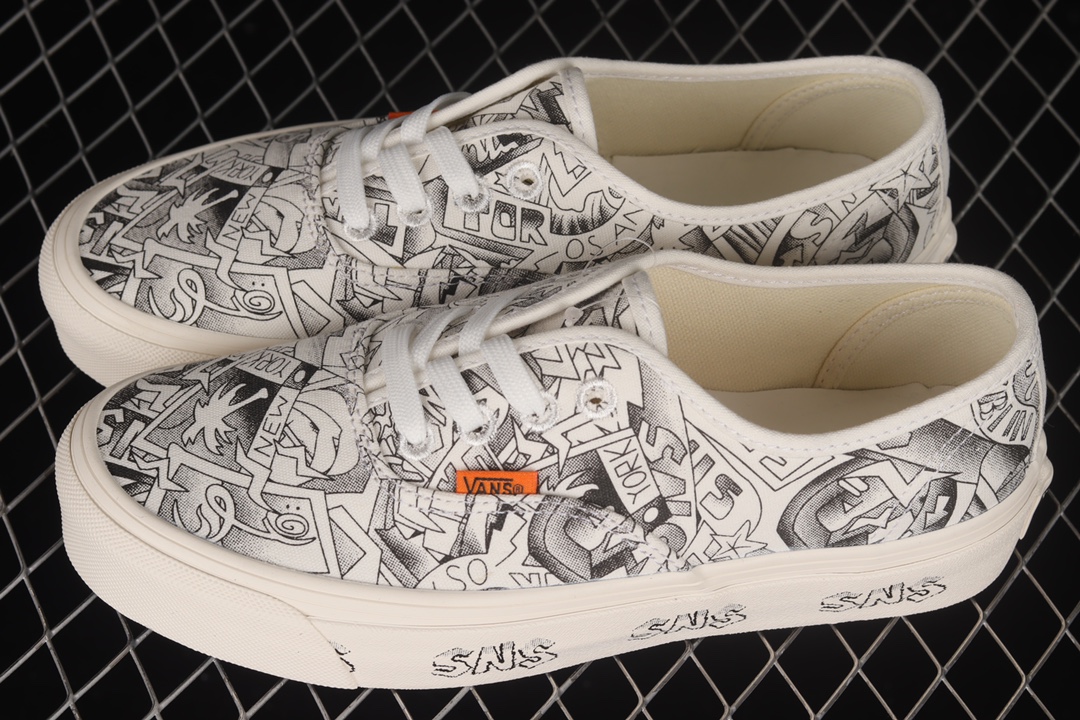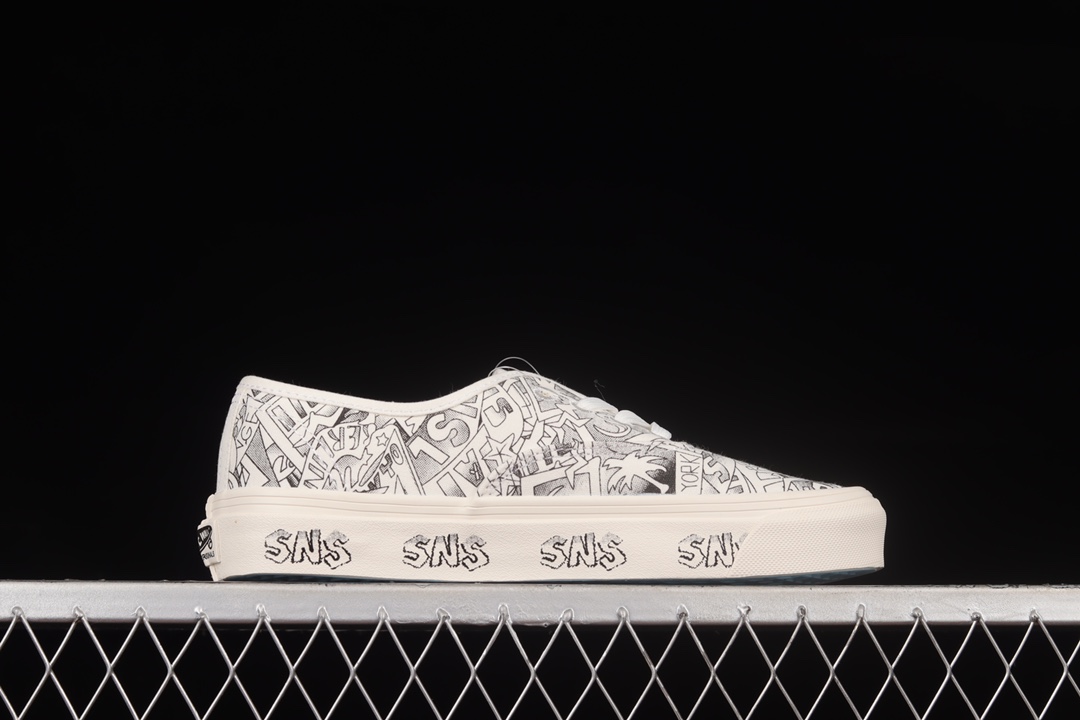 G0 Vans Vault x SNS 联名黑白插图海滩印花复古帆布板鞋 VN0A4BV9676此次采用Authentic鞋型,鞋面整体以米白为主色,搭配了涂鸦图案,中底部分印上了sns字样,鞋垫部分也同样表示了其合作身份。外底则采用了比较清新的天蓝