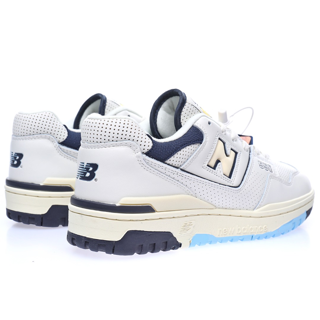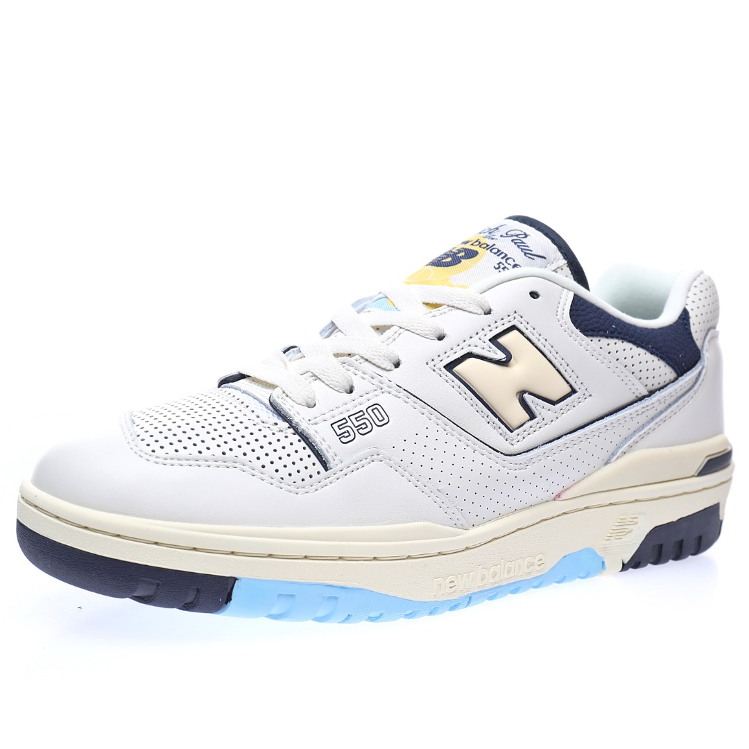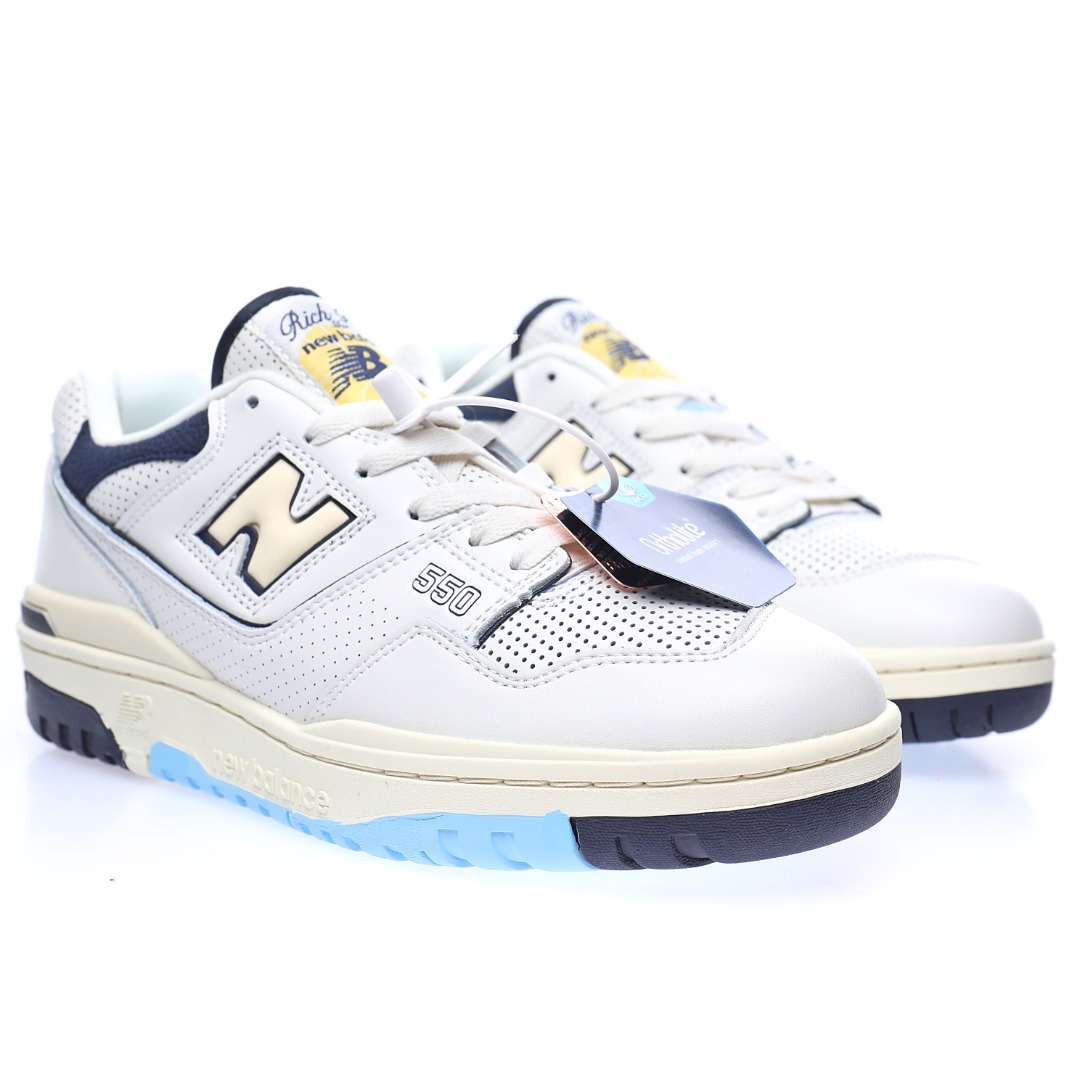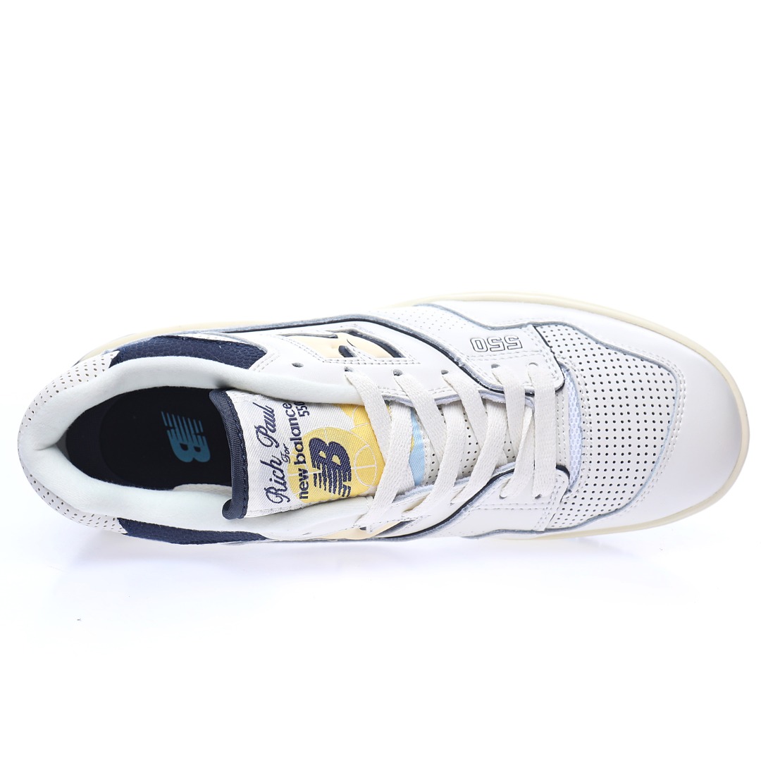 G5 男女鞋真标半码制升级原楦原纸版数据开发版型采用移膜牛培皮组合冲孔皮革鞋面材质厚实耐磨橡胶缓震大底携手NBA经纪人Rich Paul x NB新百伦New Balance BB550系列经典复古低帮休闲运动篮球板鞋“皮革米白海军蓝浅黄”BB550RP1