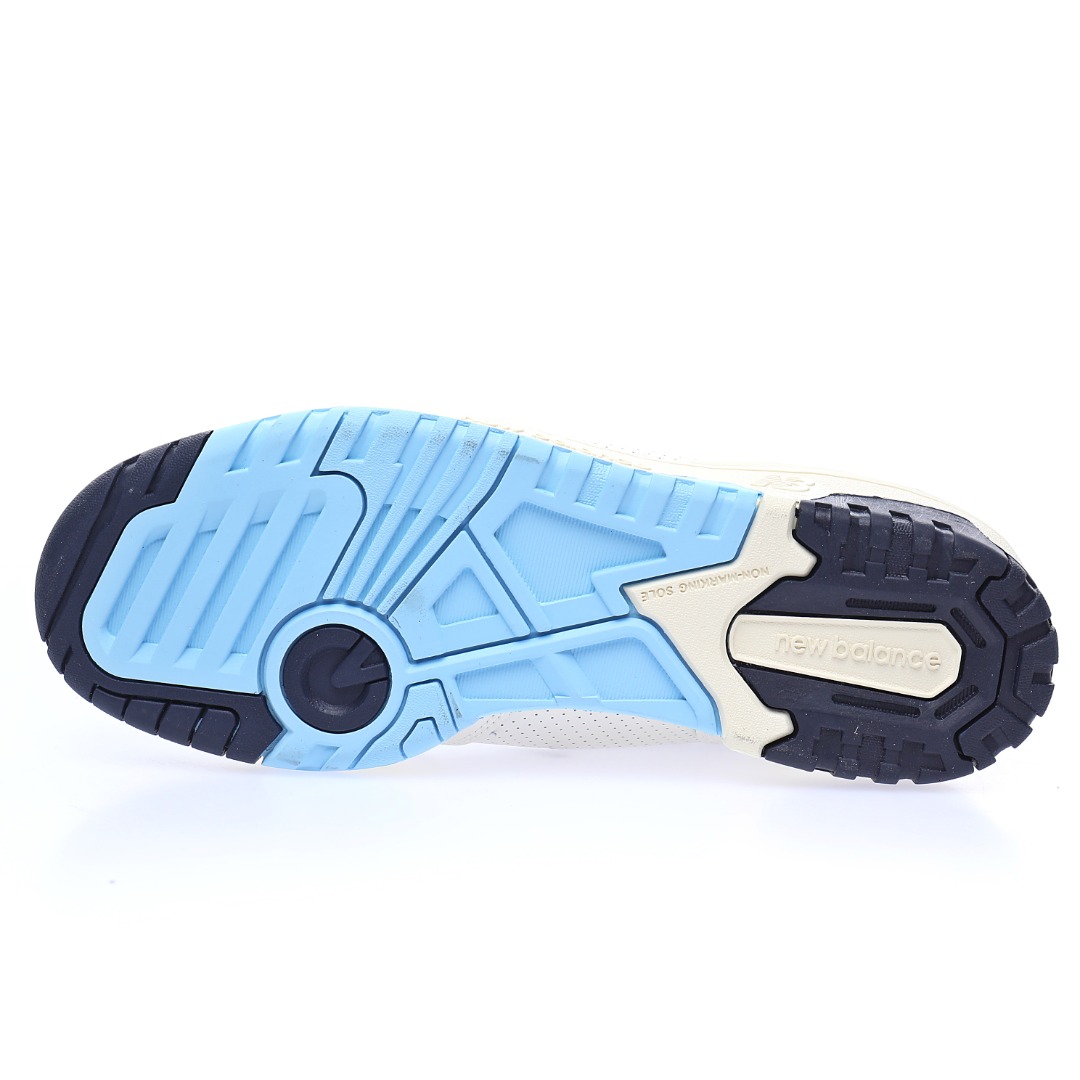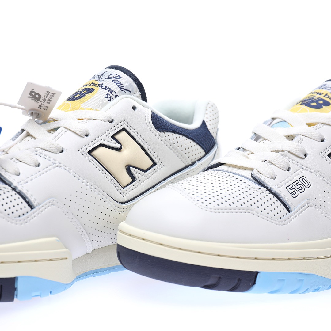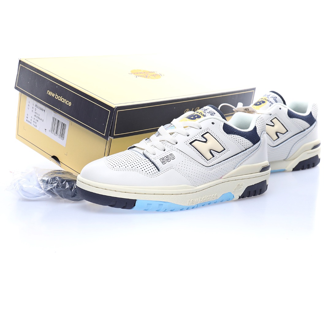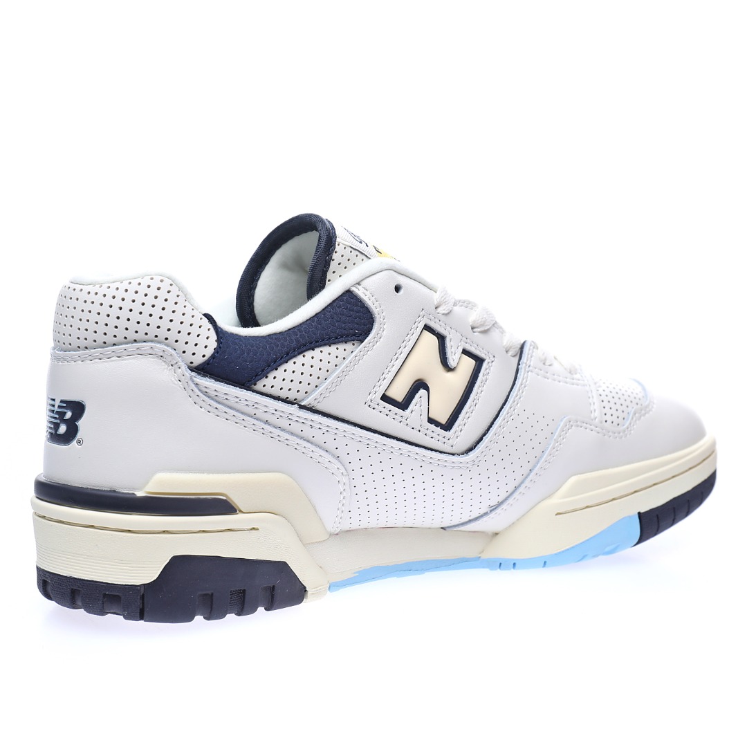 G5 男女鞋真标半码制升级原楦原纸版数据开发版型采用移膜牛培皮组合冲孔皮革鞋面材质厚实耐磨橡胶缓震大底携手NBA经纪人Rich Paul x NB新百伦New Balance BB550系列经典复古低帮休闲运动篮球板鞋“皮革米白海军蓝浅黄”BB550RP1