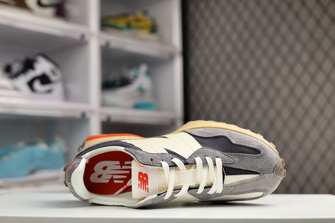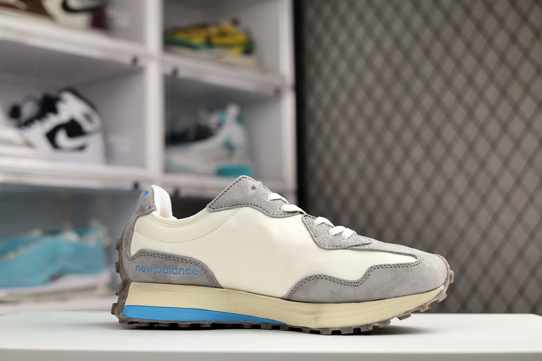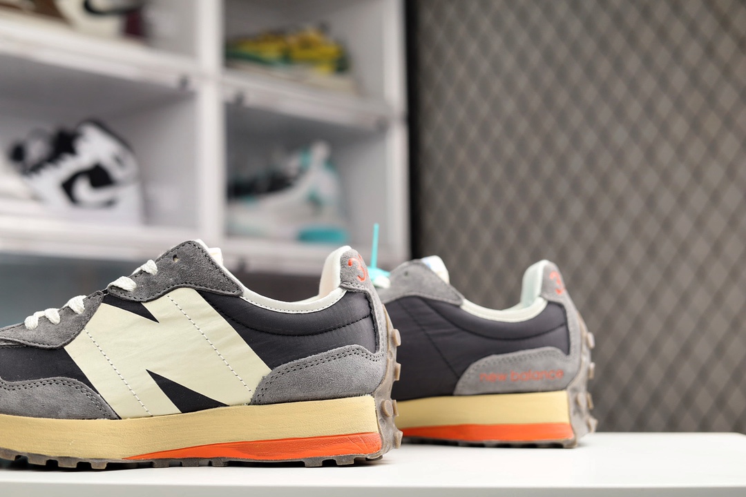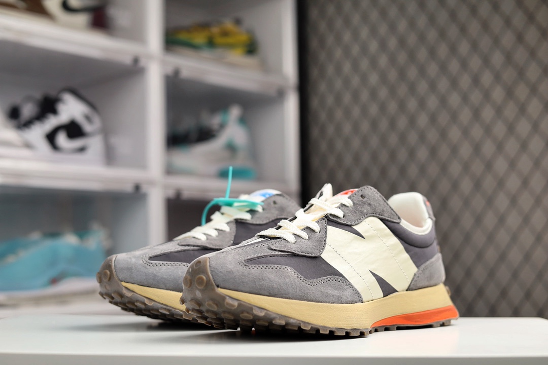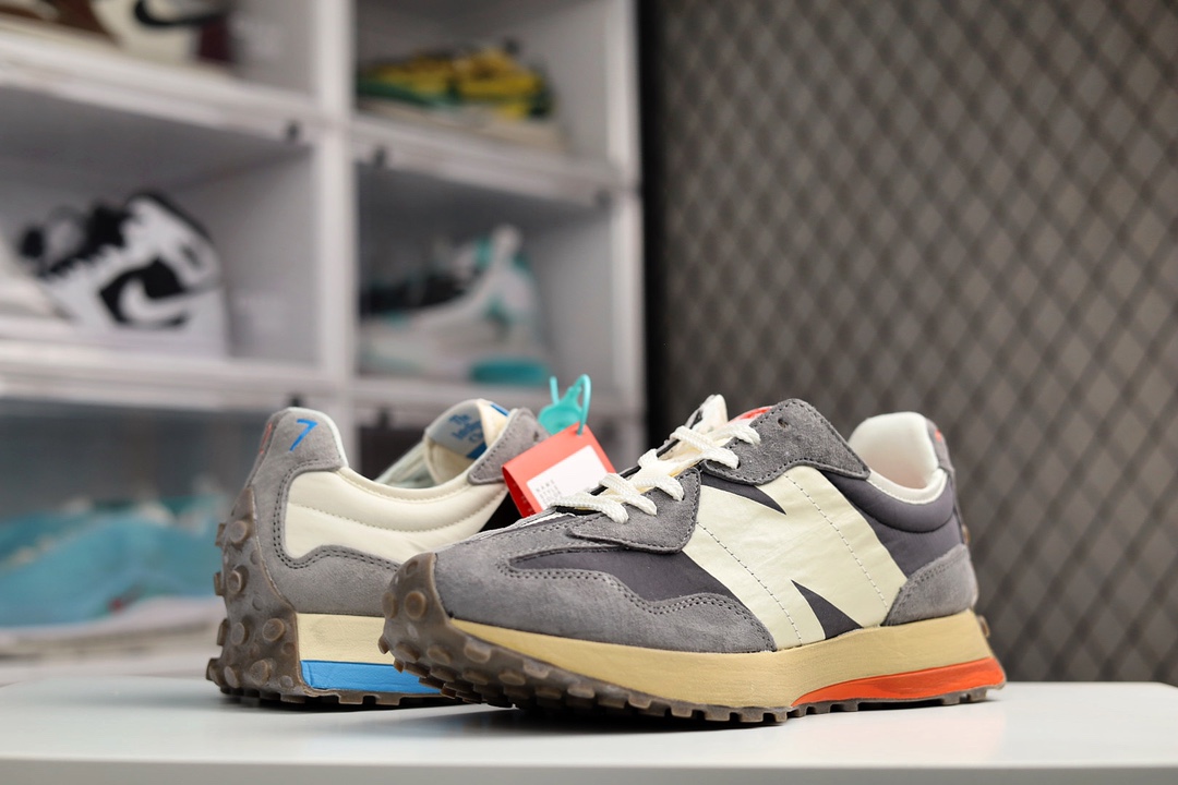 G5 综合版男女鞋真标半码制升级原楦原纸版开发版型采用正确无色差固色猪巴革及透气牛津布料拼接构成中底高弹EVA发泡材质组合满丁防滑耐磨橡胶外底上世纪 70 年代的意大利街头风格NB新百伦New Balance MS327系列复古休闲运动慢跑鞋“鸳鸯碳灰米白做旧”