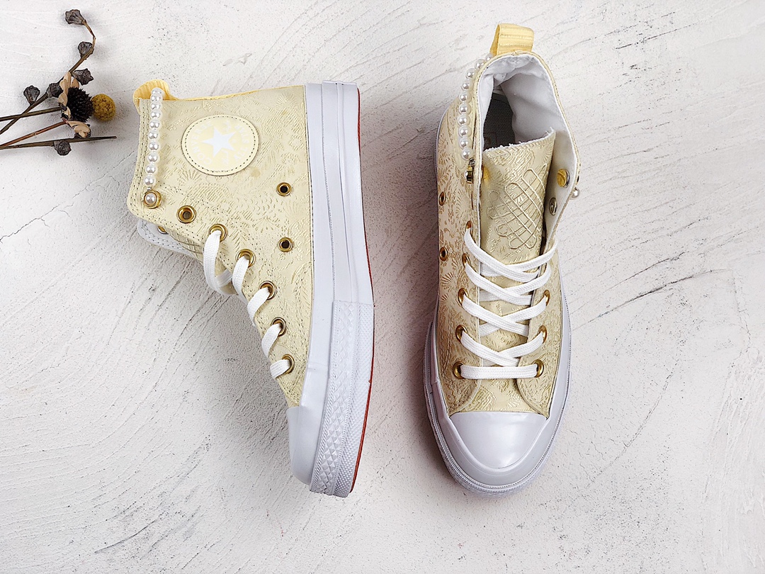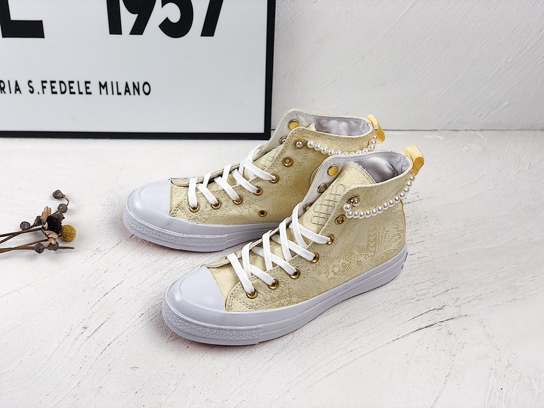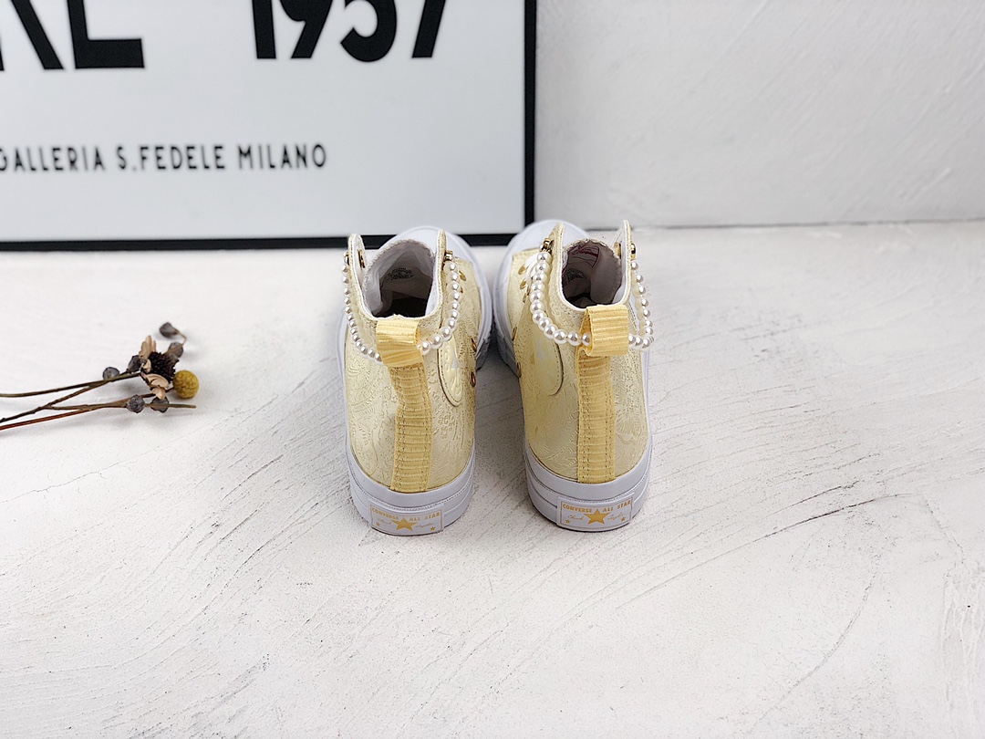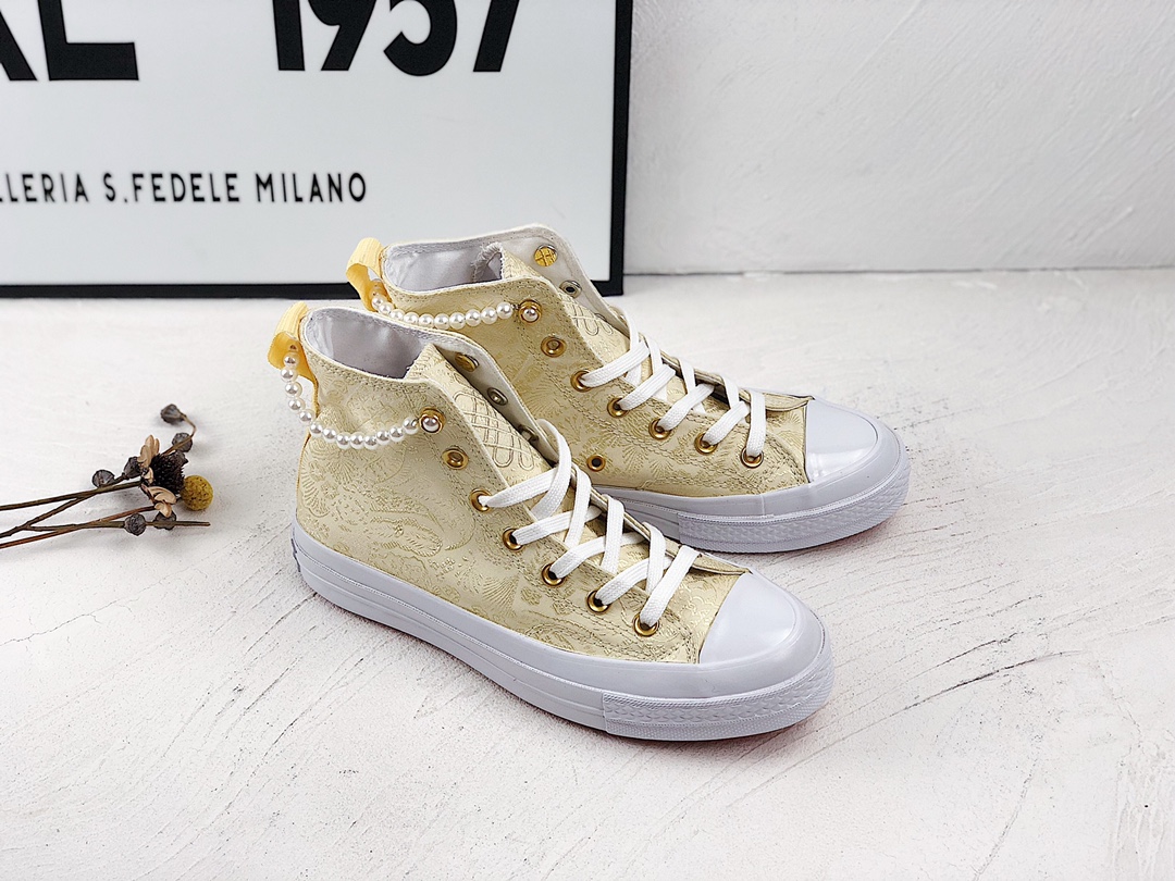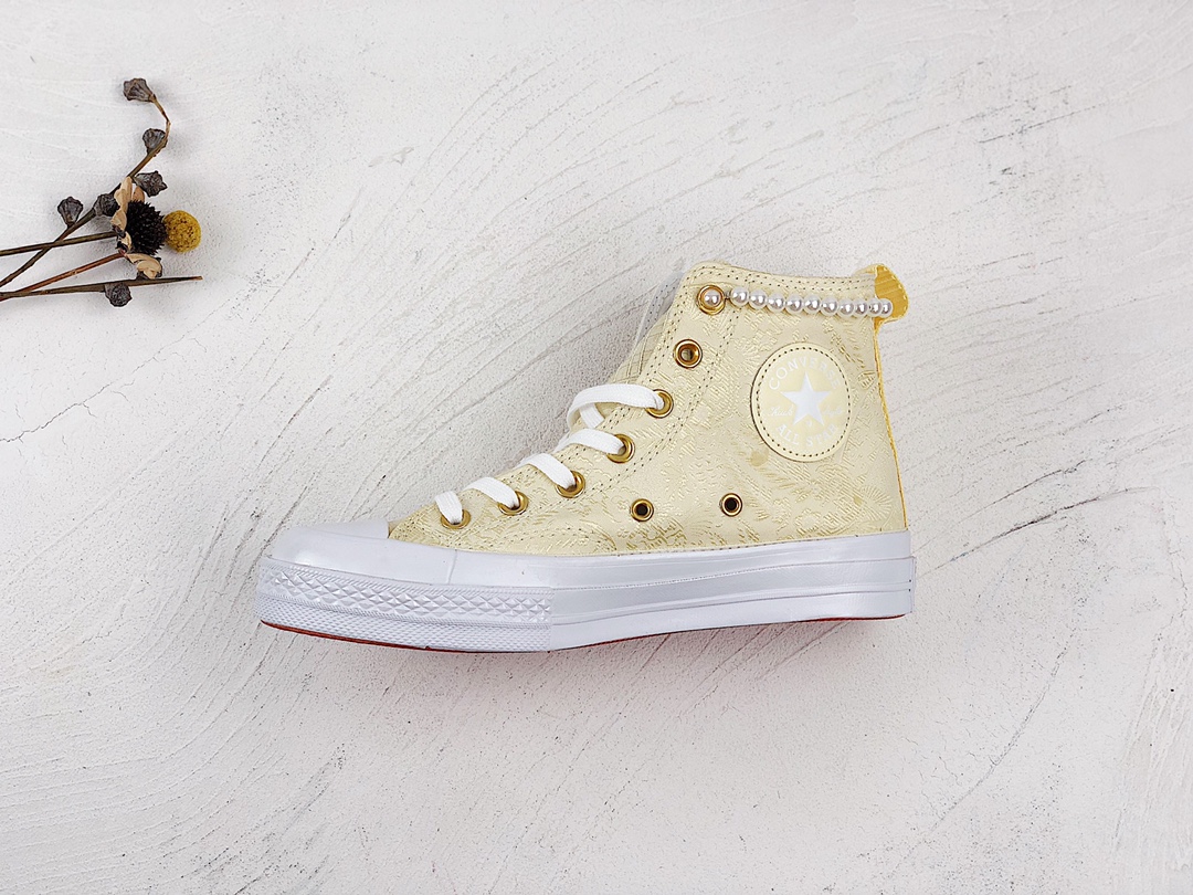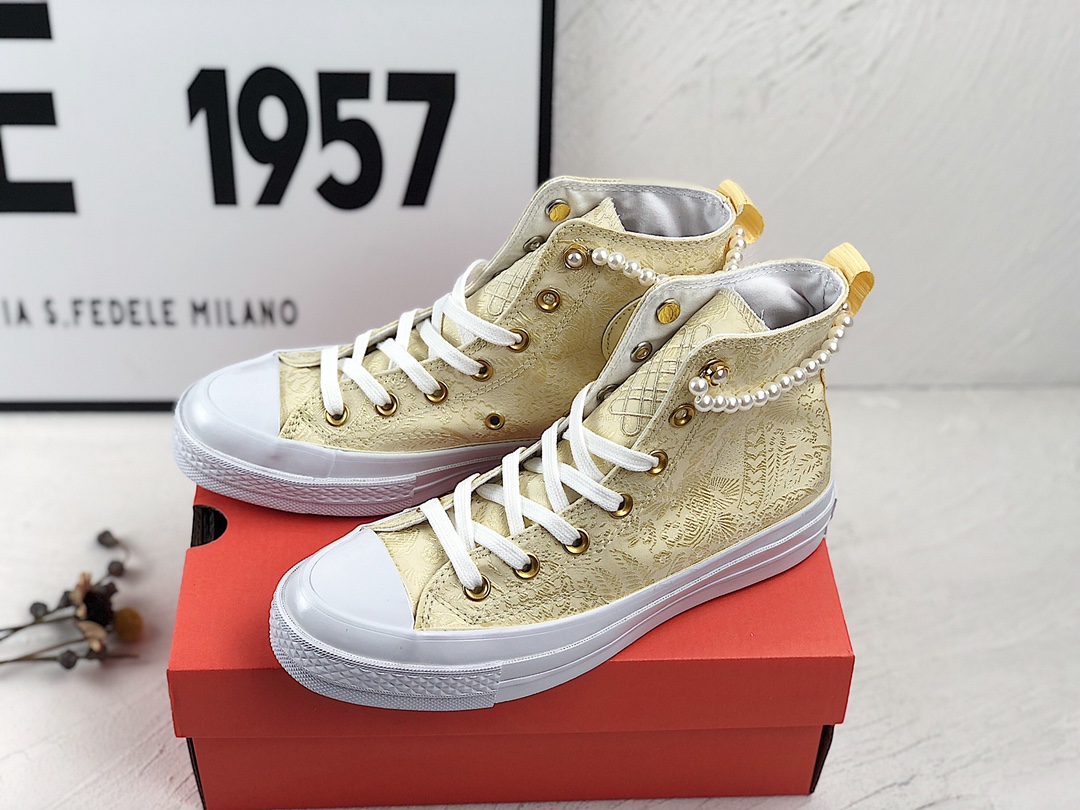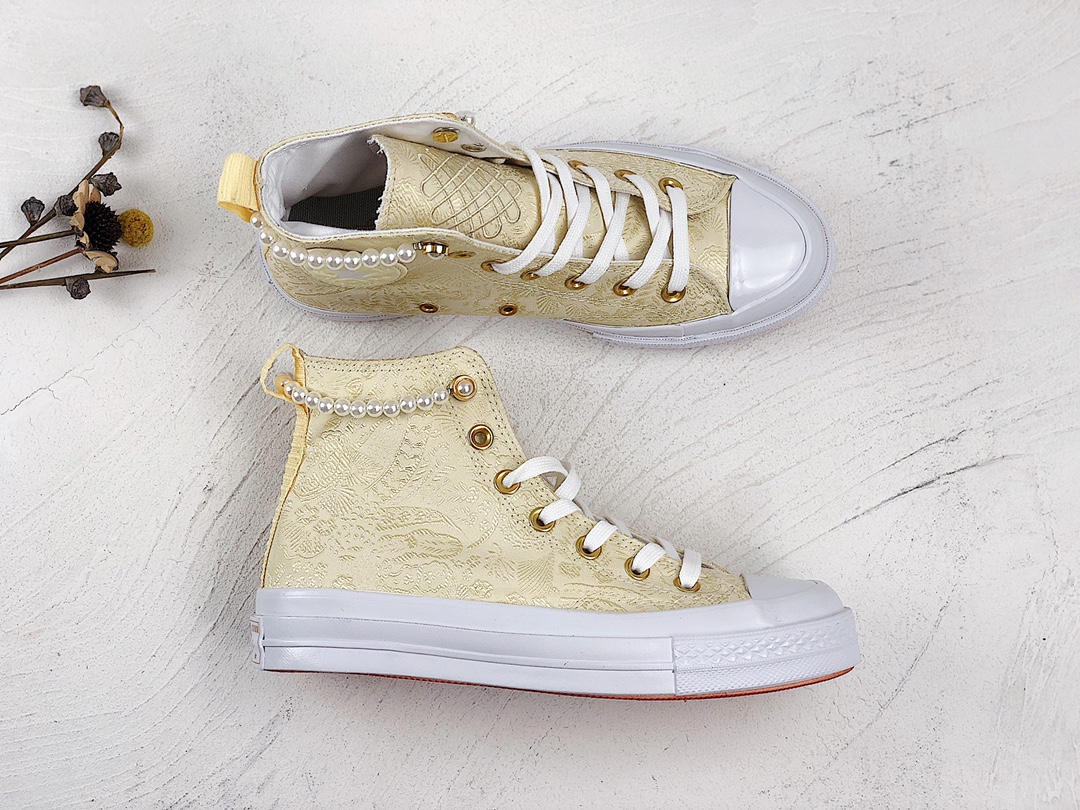 H0 匡威限量款CHUCK 1970S全新“宫锁珠帘”中国风系列浅金色缎面提花鞋面贵气十足 贵气但不俗气鞋面覆满体现自然力的植物图腾 贵气中带着清新亮点是鞋后跟的亚克力珍珠挂饰,衬托鞋子奢华又大气 而且是可拆卸珍珠珠链 超吸睛鞋舌是刺绣中国结印花设计寓意吉祥中国宫廷风 彰显“珠光宝气”的尊贵身份 精致典雅又优雅!细节满满 yyds 搭配淡色系衣裙都可 颜值超高 人间绝美 太适合春夏踏青啦 官方货号:17 J0 1CSize:35-44(36.5 37.5 39.5 45 42.5)