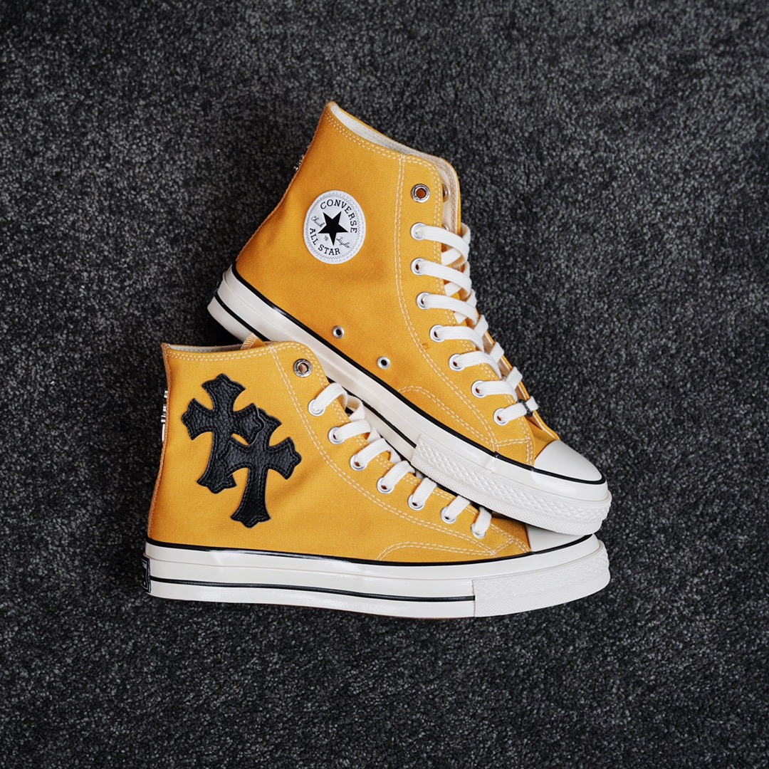 H0 Chrome Hearts x Converse Chuck Taylor 1970s克罗心联名贴皮十字大匡威 首发实拍鞋身后侧克罗心标志十字架贴皮 后跟宝剑银饰点缀 侧标完美 细节到位 全新工艺升级 完美组成一双全新的70s,整体看起来非常柔和舒适,鞋身给整体带来高级的感觉 尺码:35-44(36.5 37.5 39.5 41.5 42.5)1970s 克罗心,以匡威 1970s 为蓝本,开创式的将今年大火的克罗心Chrome Hearts的经典元素融合在一起。【配件】 经典的牛皮荔枝纹十字皮标+镀银大宝剑+镀银鞋带扣+镀银鞋眼扣+镀银鞋头螺旋五金。【工艺】每一份五金的加持都给原本经典百搭的1970s,增加了浓厚的质感和复古感觉。【鞋盒】鞋盒采用立体加固工艺礼盒,抗压性强有收藏保留价值。