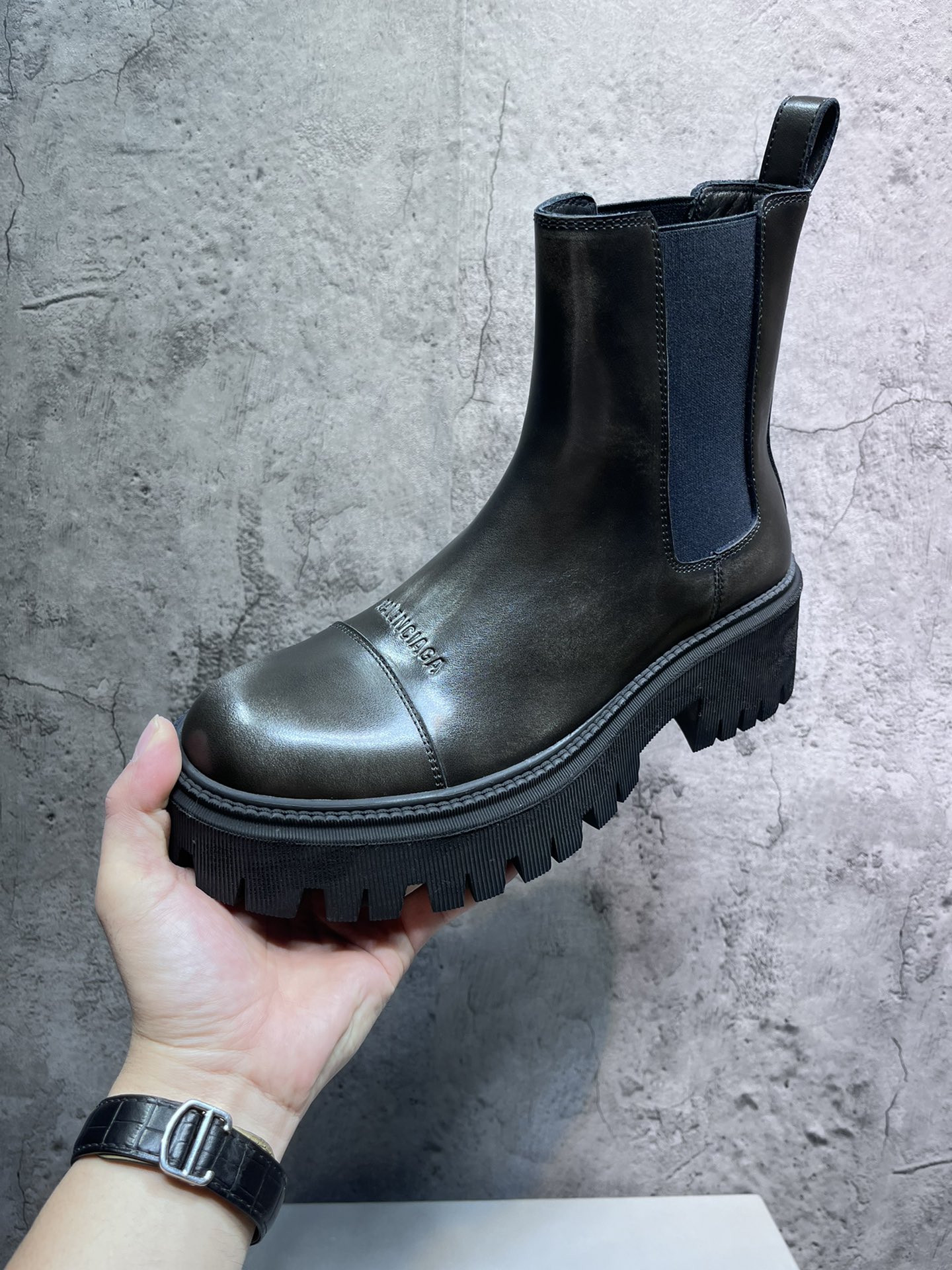 升级版大底一比一原版开模,顶级版本BALENCIAGA巴黎世家大头马丁靴,檫色做旧复古松紧靴靴,经典开边珠黑色给整体更酷的感觉,时尚元素与经典结合、这款被无数网红、明星、时尚宠爱、、只能说不仅好穿、而且还特别好走、怎么搭配你走在街头都是亮点、、柔软度超强、内里采用丝绸牛皮、穿进去超舒服被包围的感觉、鞋底采用原版耐磨大底橡胶底、专柜包装,后跟约5cm左右、前掌约2.5cm左右、