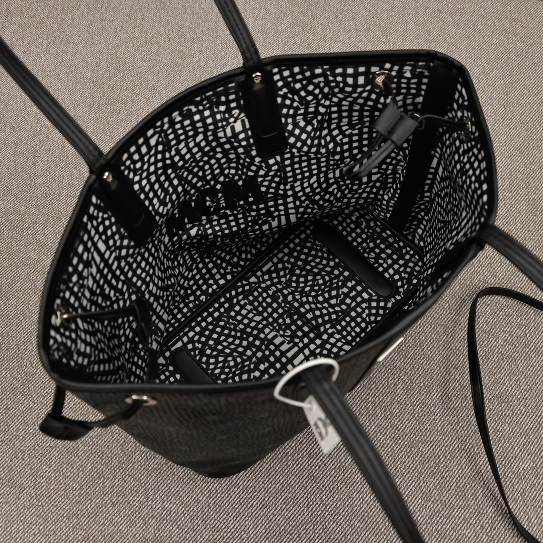 这款实用的购物袋采用经典Visetos材料制成,饰以Nappa皮革饰边,并可轻松翻面使用,展现出背面的光学格纹印花,此外其宽敞的外型可通过皮革抽绳进行即时调整,这款包袋还附带一个可拆卸手拿包,可在短途出行时单独作为钱包使用,实现了无与伦比的多功能性。
