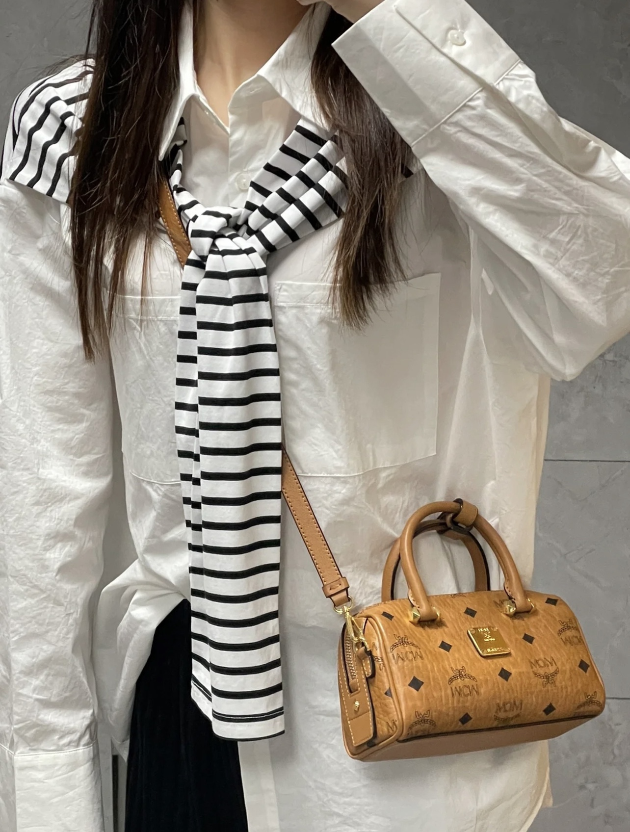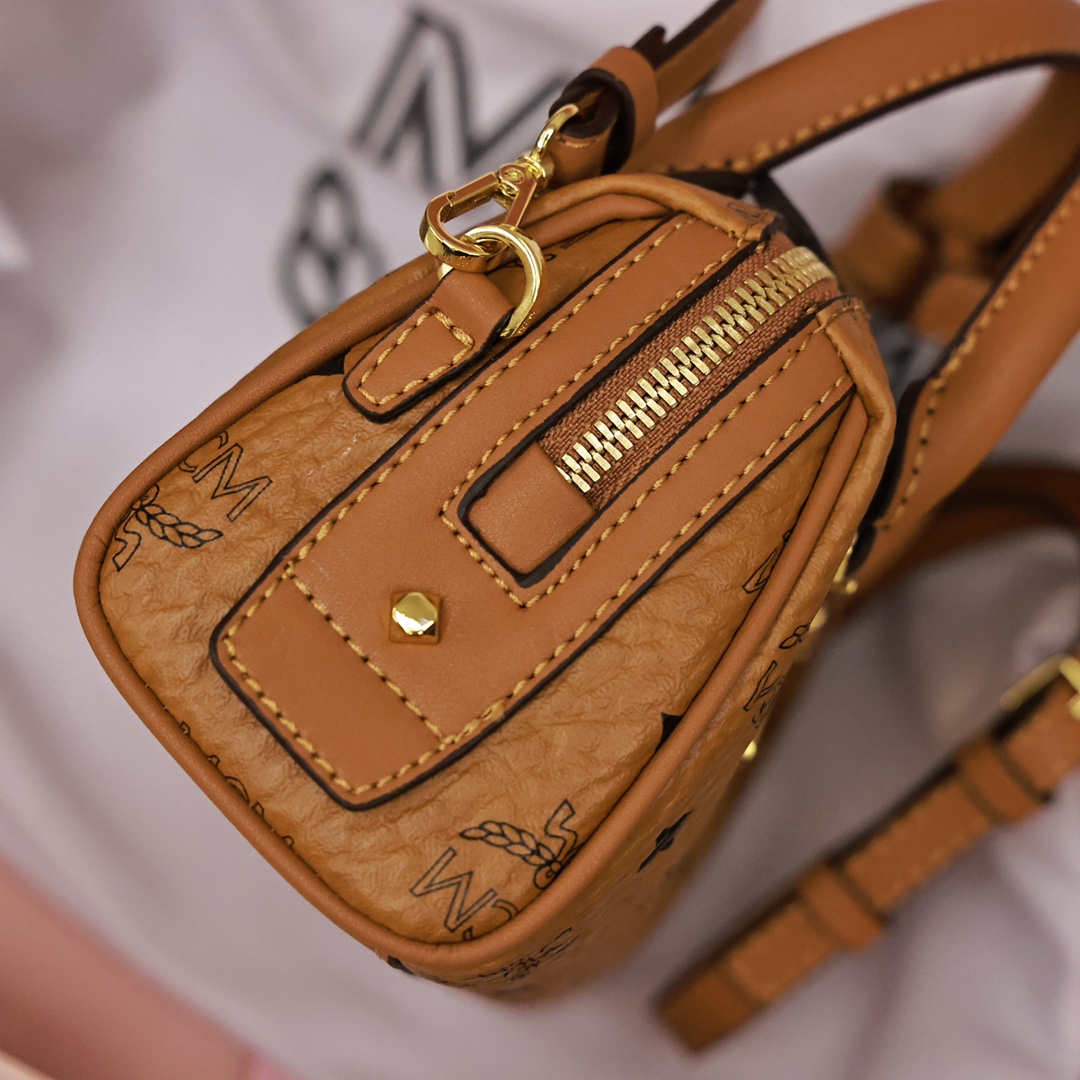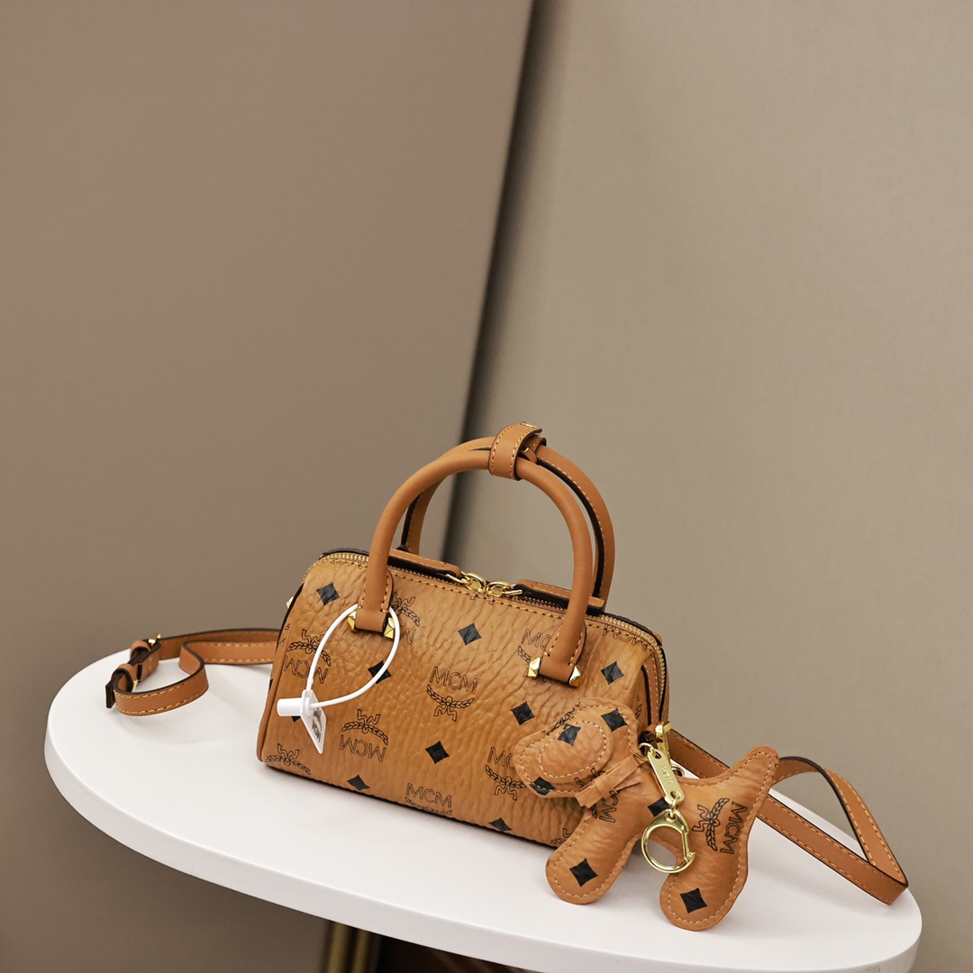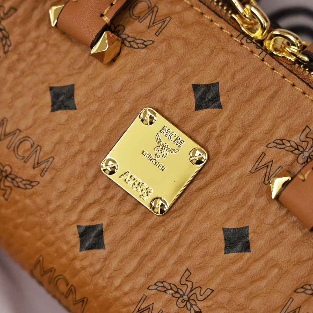 这款向MCM根植于旅行的理念致敬的波士顿包让人联想起周末旅行包.干净利落的线条.并配有方便开启的加长拉链.做工精细.一丝不苟.顶部提手由手工进行缠绕.针缝和边缘上漆.