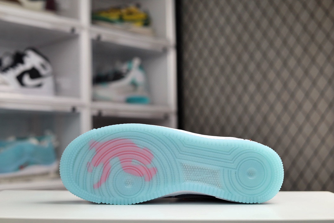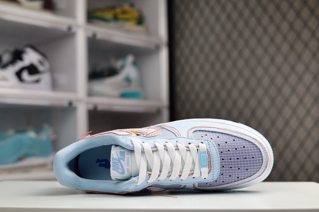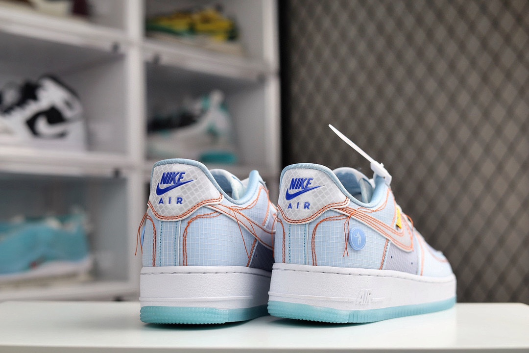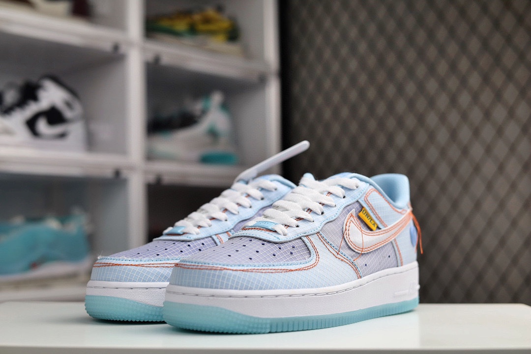 F5 注意:每只鞋上有8条缝线,不能剪掉缝线及网纱,剪掉后不可退换NK Air Force 1 空军一号 湖水蓝网纱鞋身采用半透明蝉翼材质替代传统的皮革面料方格纹理充满鞋面,算是这次联名最大的改动。Swoosh 上方加入黄色 UN\/LA 的标签,后跟外侧与前掌外底均点缀 Union Frontman 标志,彰显专属联名身份货号:CJ9649- K0 FMSize:36 36.5 37.5 38 38.5 39 40 40.5 41 42 42.5 43 44 44.5 45