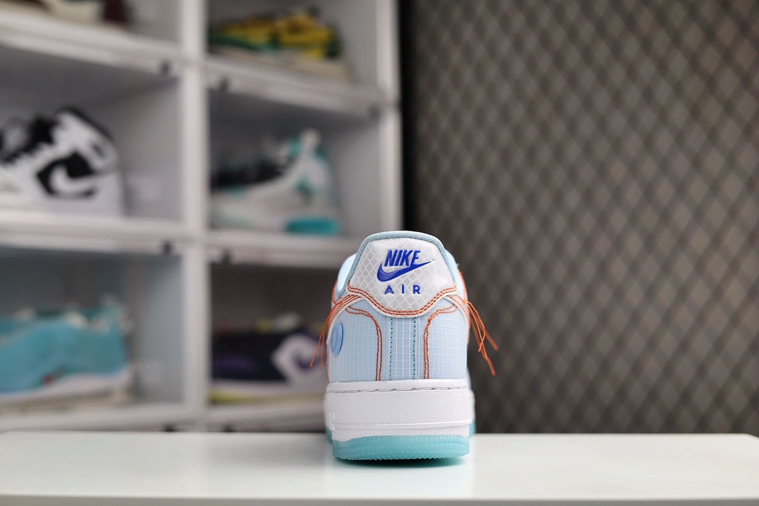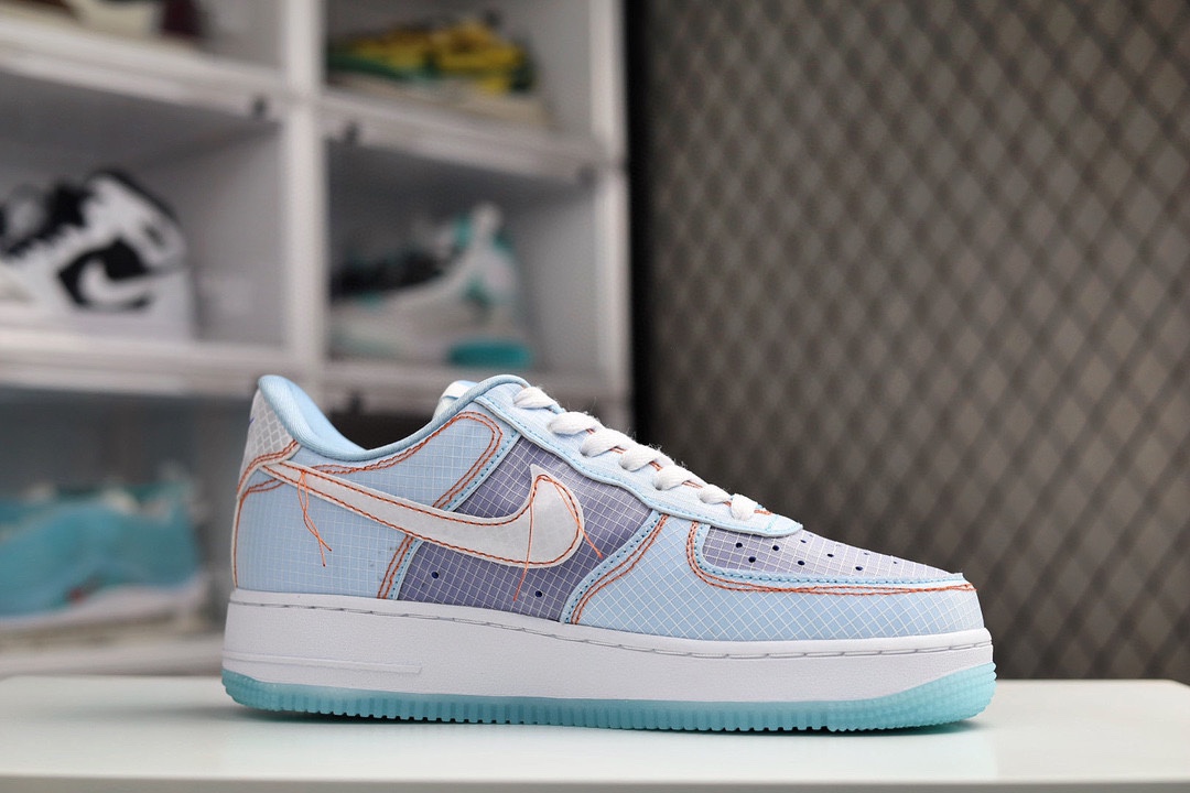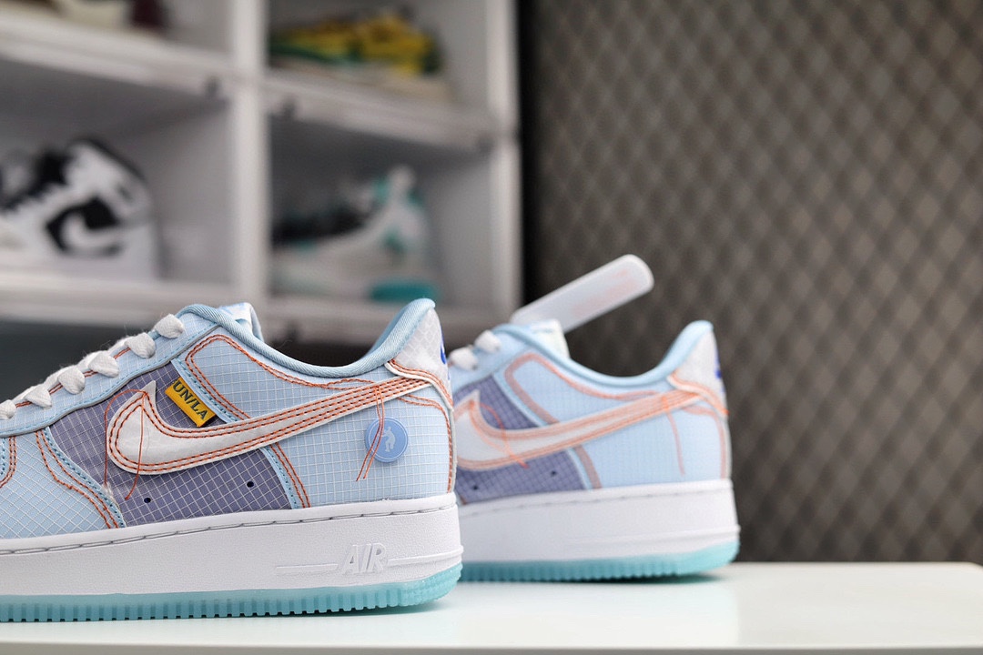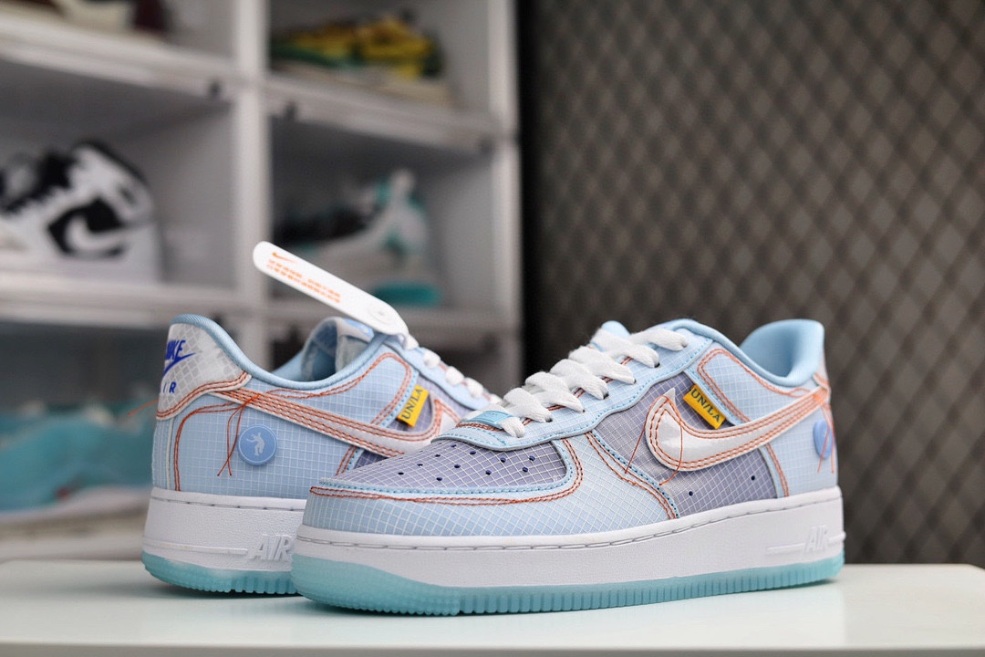F5 注意:每只鞋上有8条缝线,不能剪掉缝线及网纱,剪掉后不可退换NK Air Force 1 空军一号 湖水蓝网纱鞋身采用半透明蝉翼材质替代传统的皮革面料方格纹理充满鞋面,算是这次联名最大的改动。Swoosh 上方加入黄色 UN\/LA 的标签,后跟外侧与前掌外底均点缀 Union Frontman 标志,彰显专属联名身份