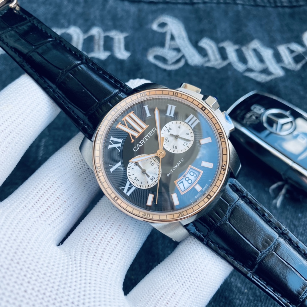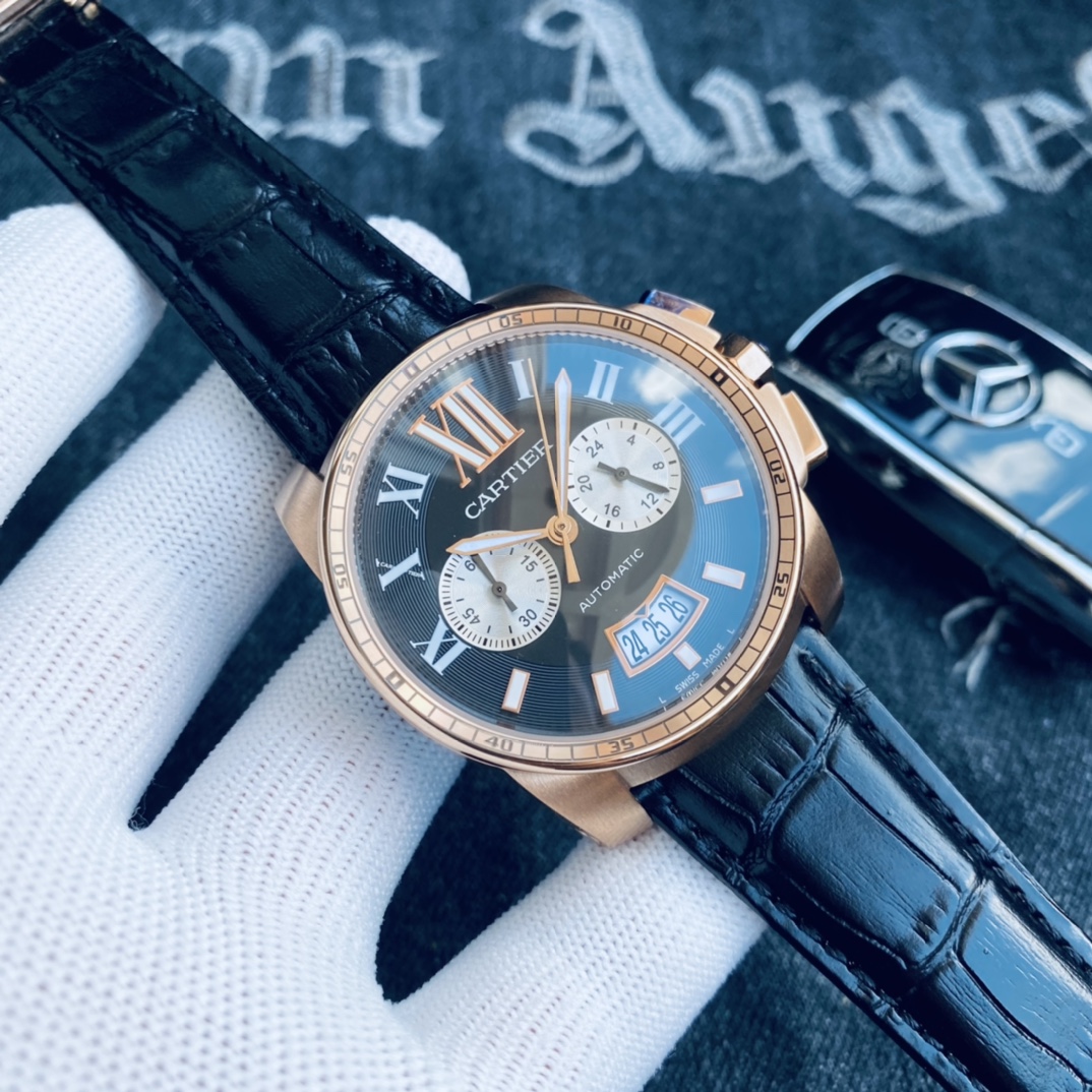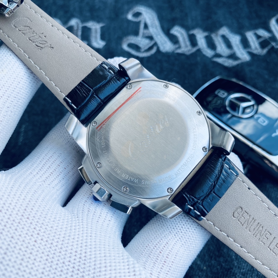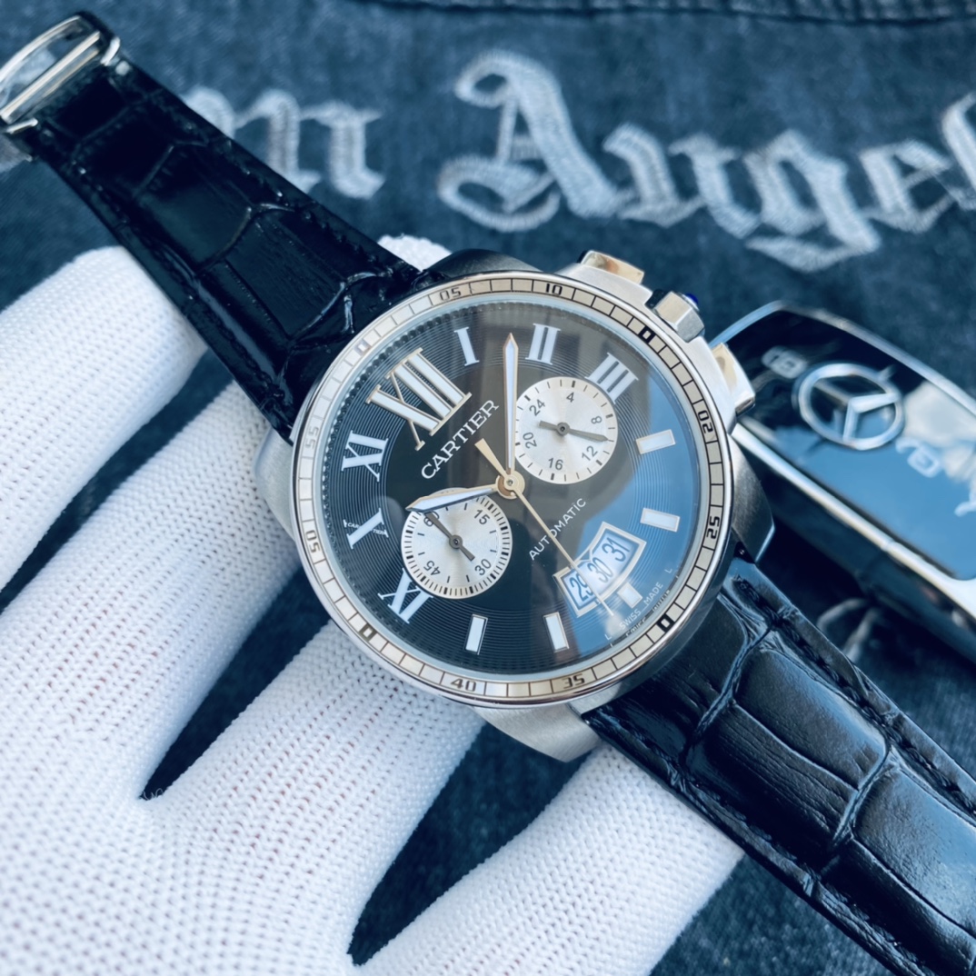 , 品牌: 卡地亚 Cartier 卡利博 系列: CALIBRE DE CARTIER潜水系列 表壳: 316精钢表壳精工制作 大气凌然 机芯: 顶级进口石英vk计时机芯走时精准 镜面: 顶级矿物质水晶防磨花玻璃 尺寸: 厚度12mm,直径42mm 字面: 超强表盘夜光丁 日历同步正品一致黑色底白字体显示 设计: 时尚与运动结合的潜水表硬朗而霸气,佩戴能突出男士魅力,彰显气质。